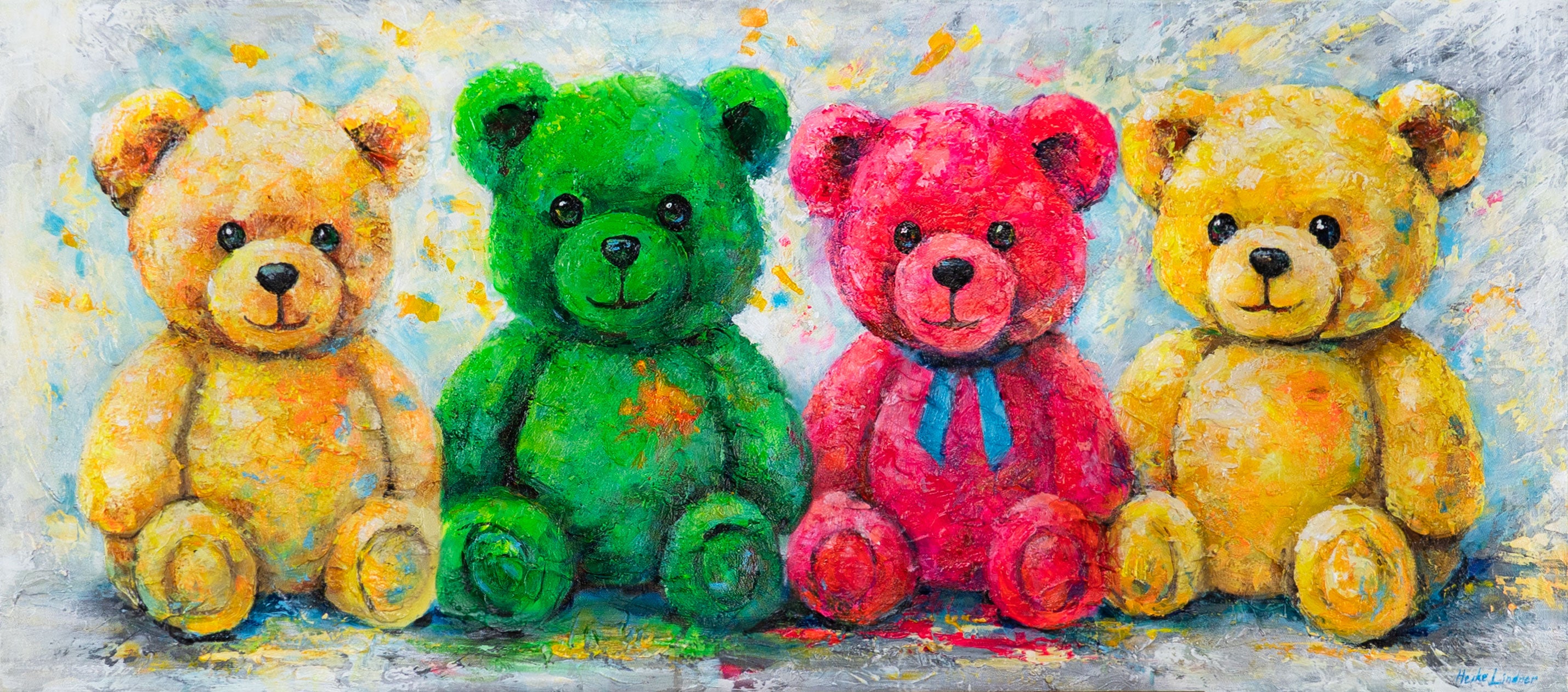 “Colorful Happiness” is een handgeschilderd acrylschilderij op canvas met vier kleurrijke teddyberen in geel, groen, roze en oranje. De sculpturale structuur, felle kleuren en liefdevolle details maken dit werk een vrolijke toevoeging aan elk huis.