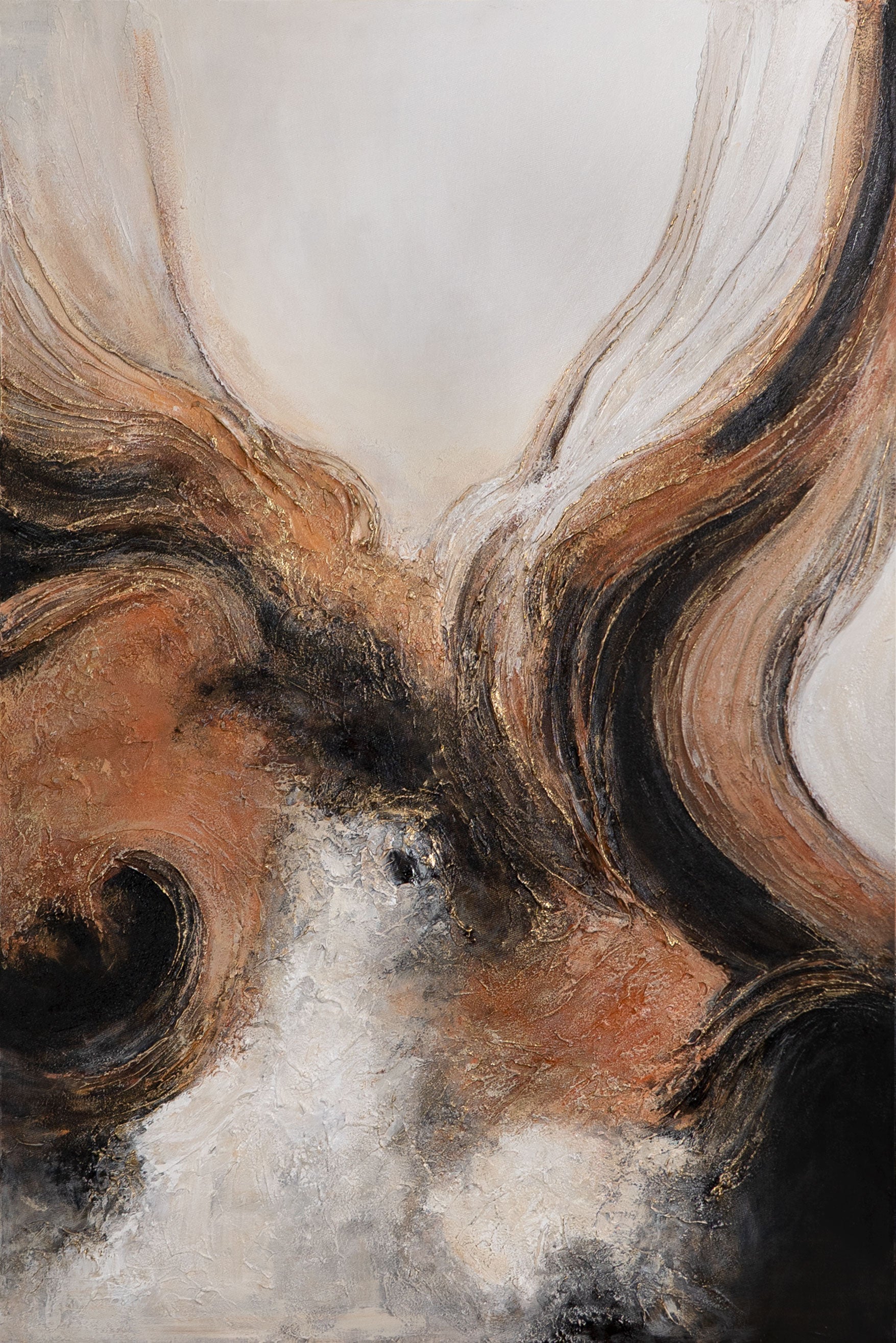 "Element in beweging" is een handgeschilderd acryl schilderij dat fascineert door zijn dynamische vormen en contrasterende kleurverlopen. Donkere accenten in zwart versmelten met warme bruin- en beigetinten, terwijl het gestructureerde oppervlak diepte en levendigheid creëert. De reliëfachtige uitvoering brengt beweging in het schilderij en maakt het een blikvanger van moderne wandkunst.