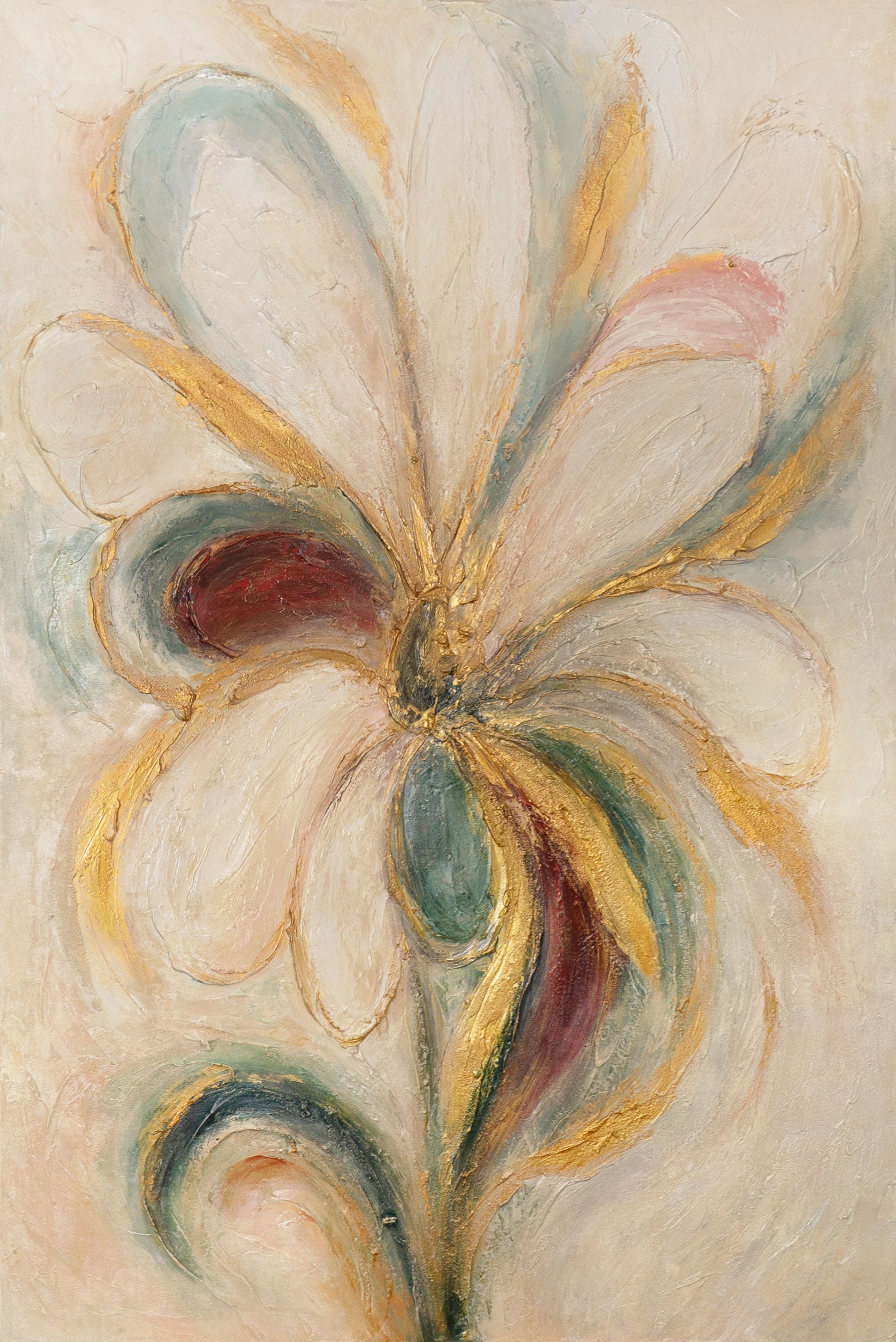„Bloemige Energie” is een handgeschilderd acrylschilderij op canvas, dat met zijn intense kleurkracht en gebogen lijnen een florale dynamiek ontplooit. Stralende accenten in goud, groen en rood ontmoeten zachte crème- en beige tinten, waardoor een harmonisch en tegelijkertijd levendig beeld ontstaat. De plastische structuur geeft het kunstwerk diepte en beweging, die doet denken aan een gestileerde bloem in de wind.