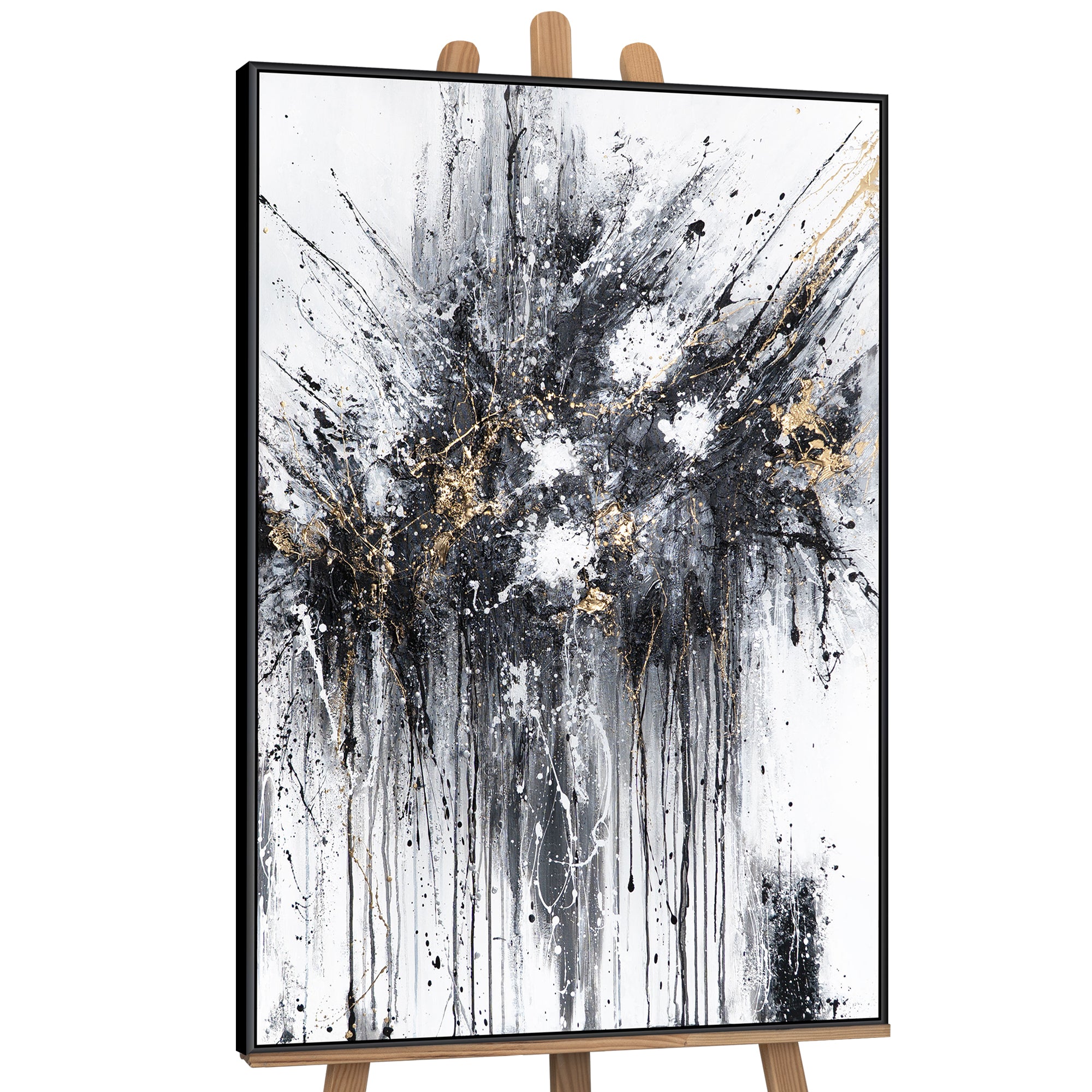 Een dynamische uitbarsting van lijnen, druppels en kleurexplosies domineert dit abstracte kunstwerk in zwart, wit en goud. Het schilderij komt over als een spontane energieontlading op het canvas – krachtig, ongecontroleerd, maar toch harmonieus in zijn interactie. De gouden accenten voegen een vleugje elegantie en diepte toe aan de compositie, terwijl het gestructureerde oppervlak het licht op verschillende manieren reflecteert.