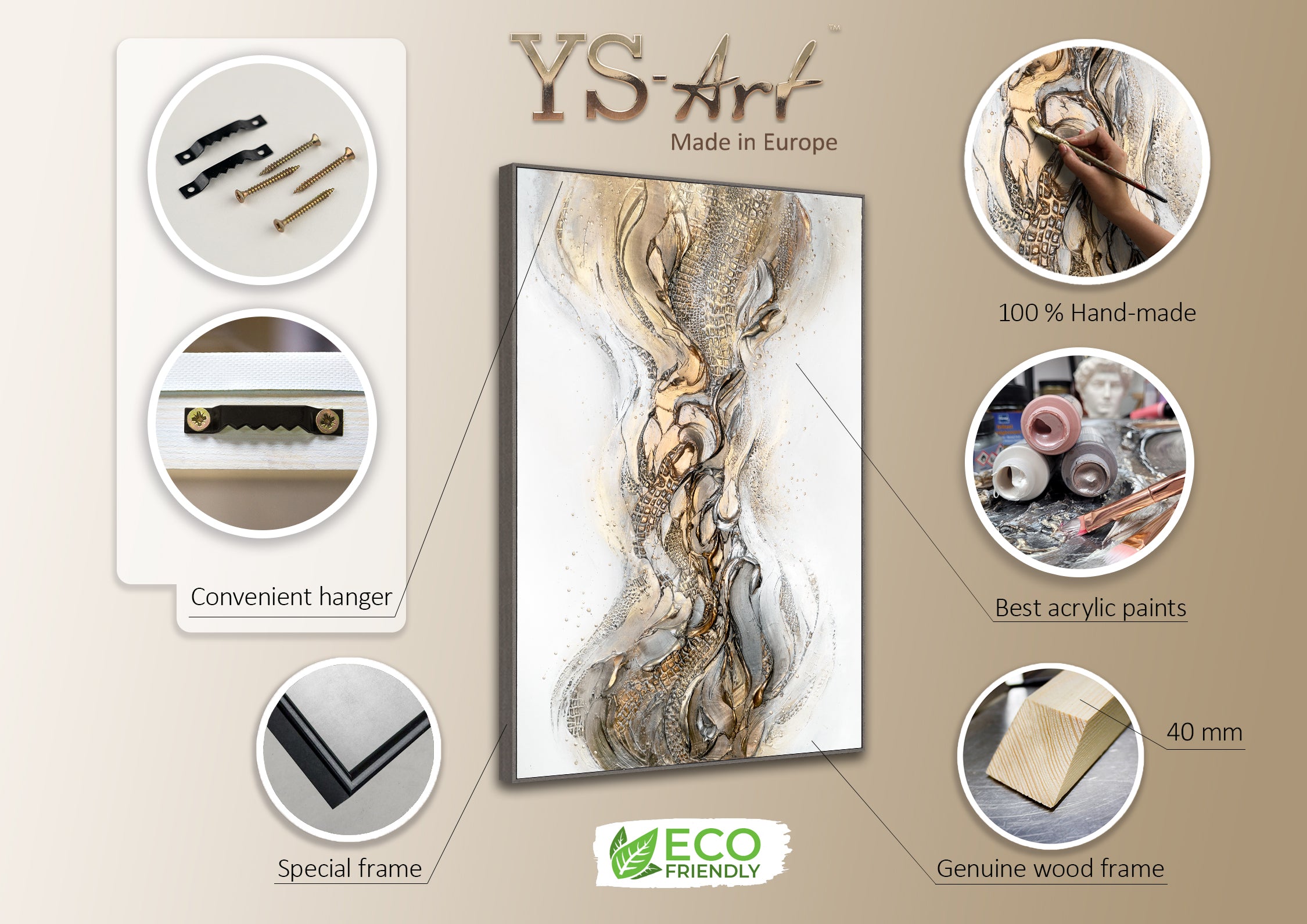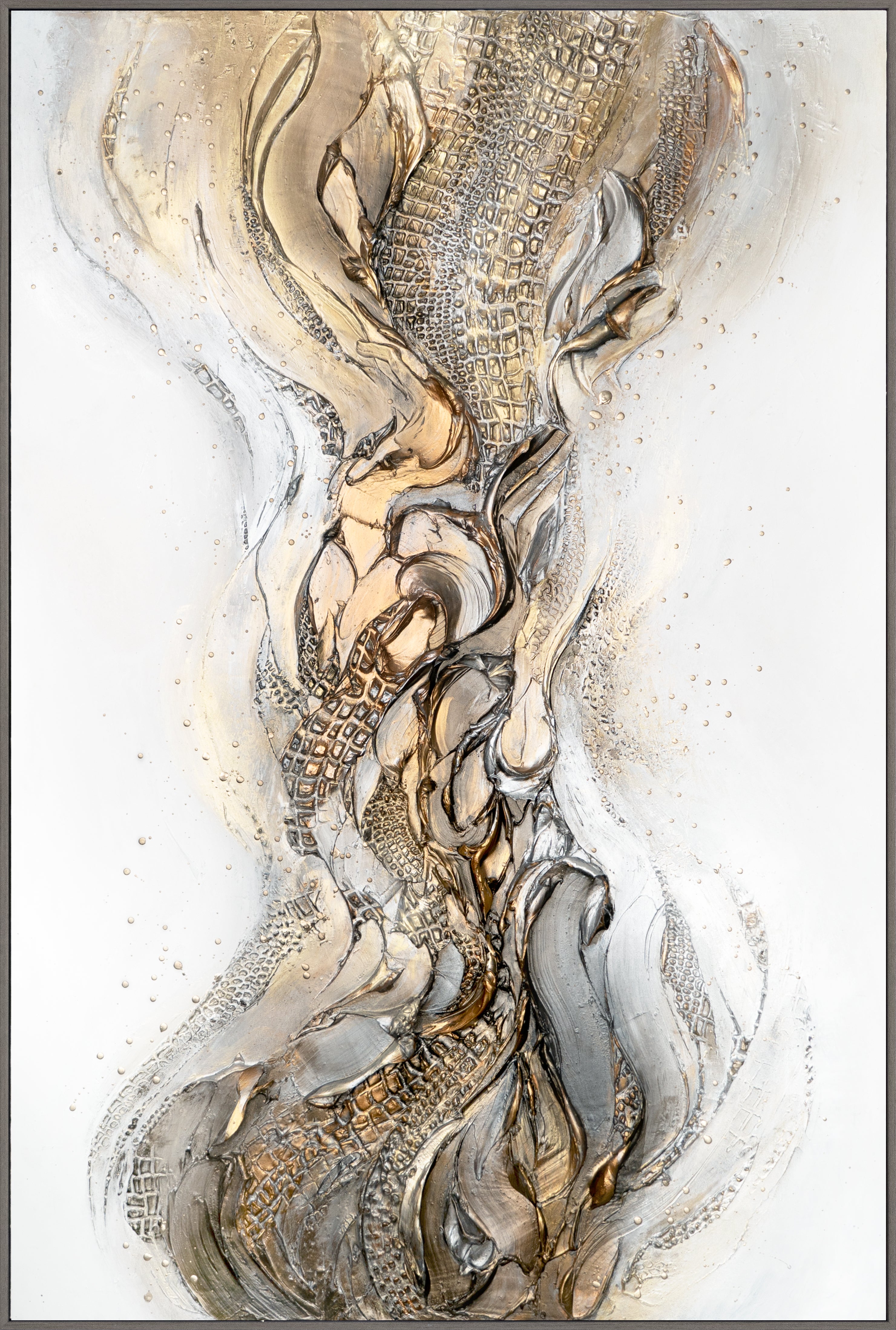 De combinatie van verschillende structuren en een uitgebalanceerd kleurgebruik zorgt voor een fascinerend visueel effect. Elk exemplaar is 100% met de hand geschilderd door professionele kunstenaars op een gespannen canvasdoek, gemonteerd op een houten keilrahmen van natuurlijke kwaliteit.