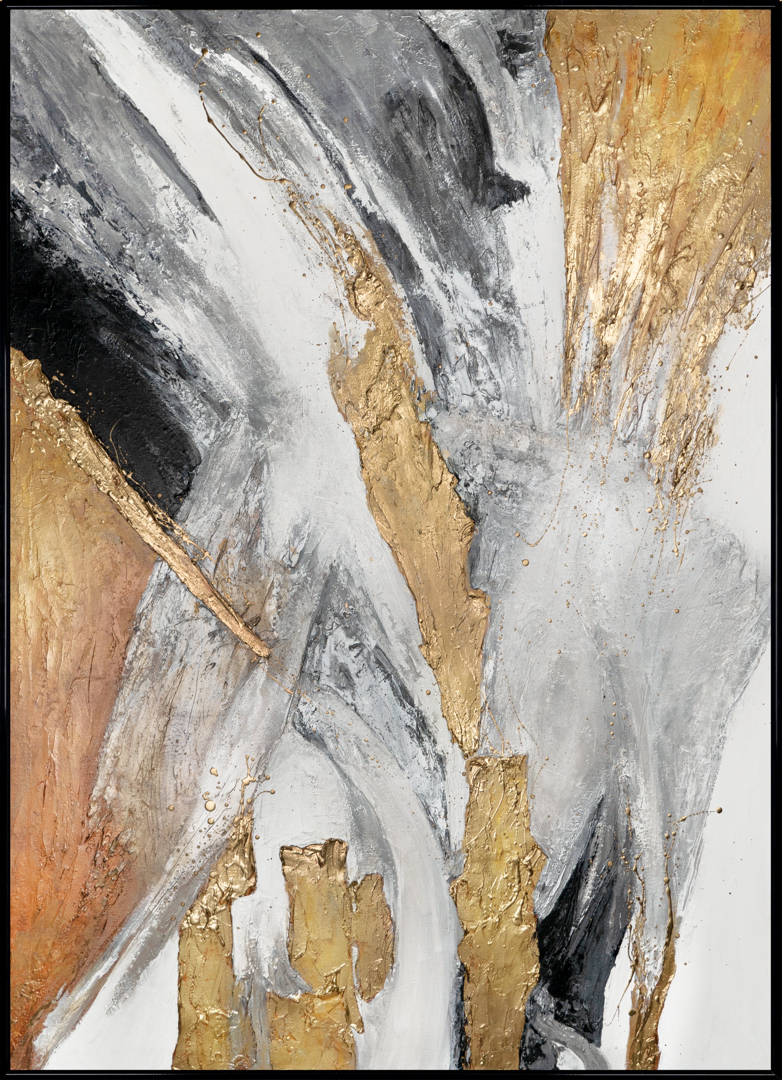 Verrijk uw huis of kantoor met dit elegante abstracte kunstwerk. De goud- en grijstinten zorgen voor een dynamische en moderne compositie. Het schilderij maakt indruk door de sterke contrasten en de expressieve penseelstreken. Het is 100% handbeschilderd en wordt geaccentueerd door een elegante lijst.