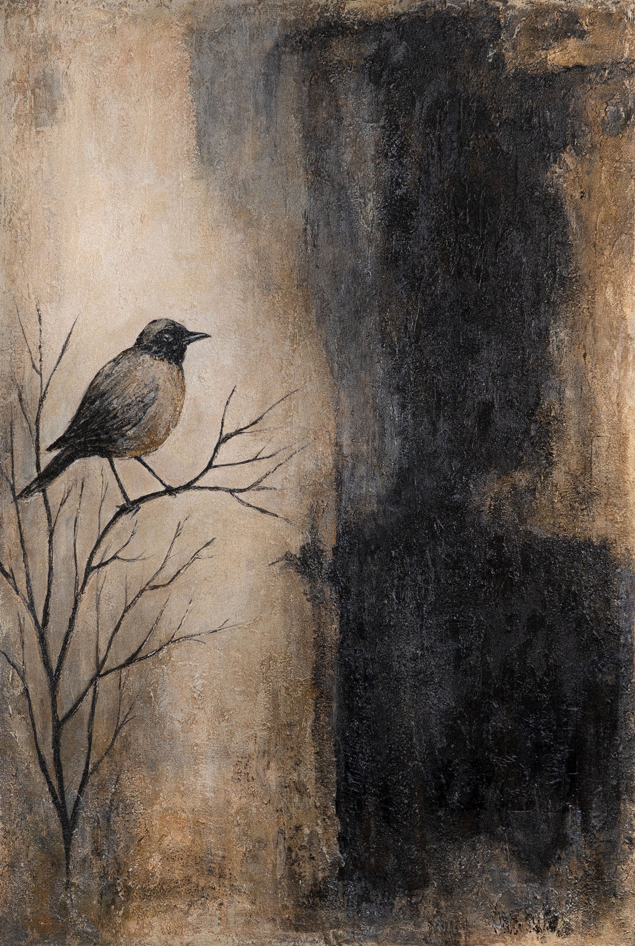 "Tak en schaduw" is een handgeschilderd acryl schilderij dat indruk maakt met zijn expressieve natuurmotief. Een enkele vogel zit op kale takken, ingebed in een contrasterende compositie van warme beige tinten, aardse bruin nuances en diep zwart. Het gestructureerde oppervlak geeft het schilderij diepte en een levendige textuur die de aandacht trekt.