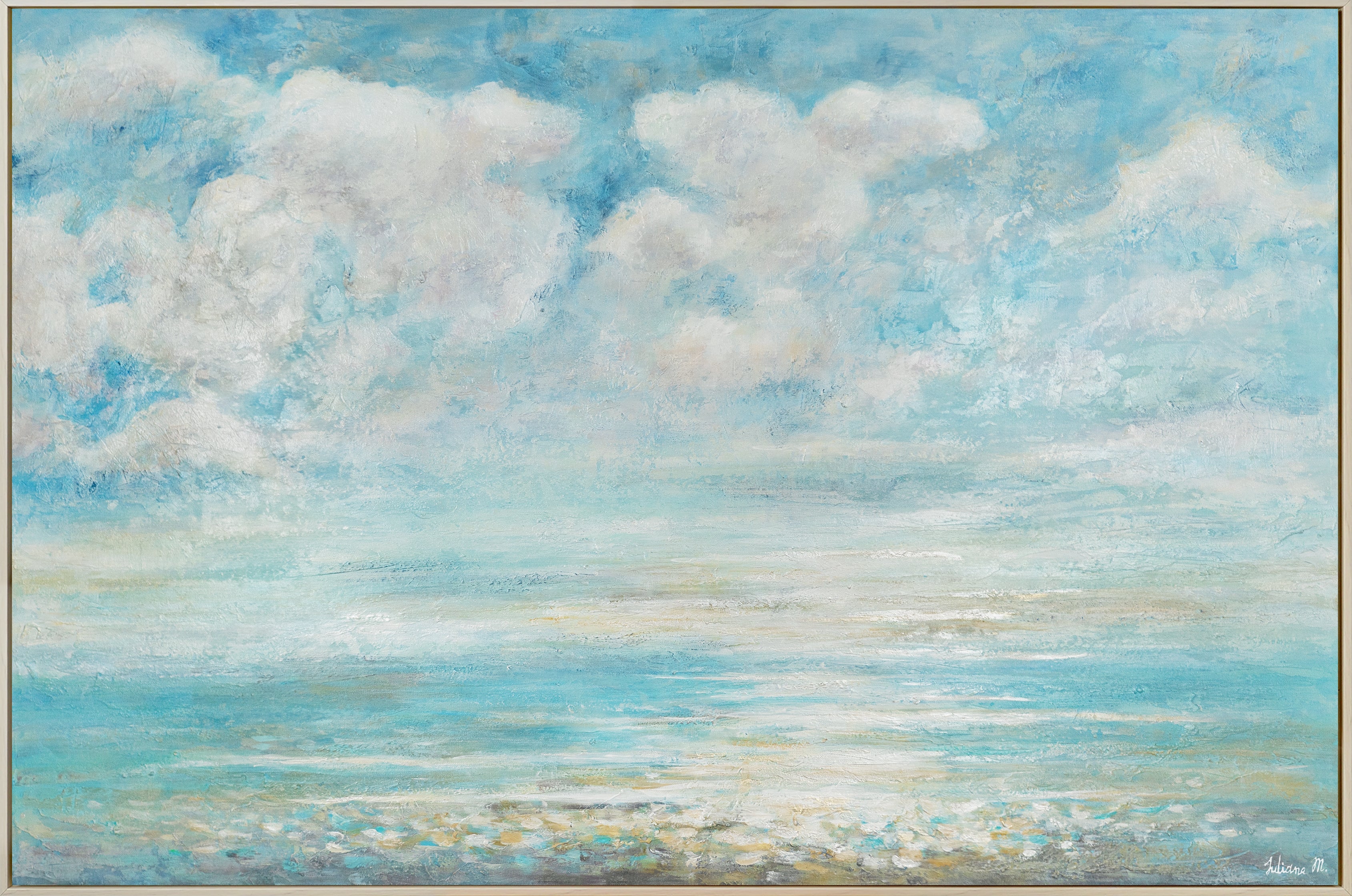 Ervaar de rustige schoonheid van de zee met dit adembenemende handgeschilderde schilderij. De vredige sfeer van een koele zomerochtend aan zee wordt vastgelegd in levendige kleuren en fijne details. Perfect voor het interieur van stadsappartementen of landhuizen, woonkamers en werkruimtes.