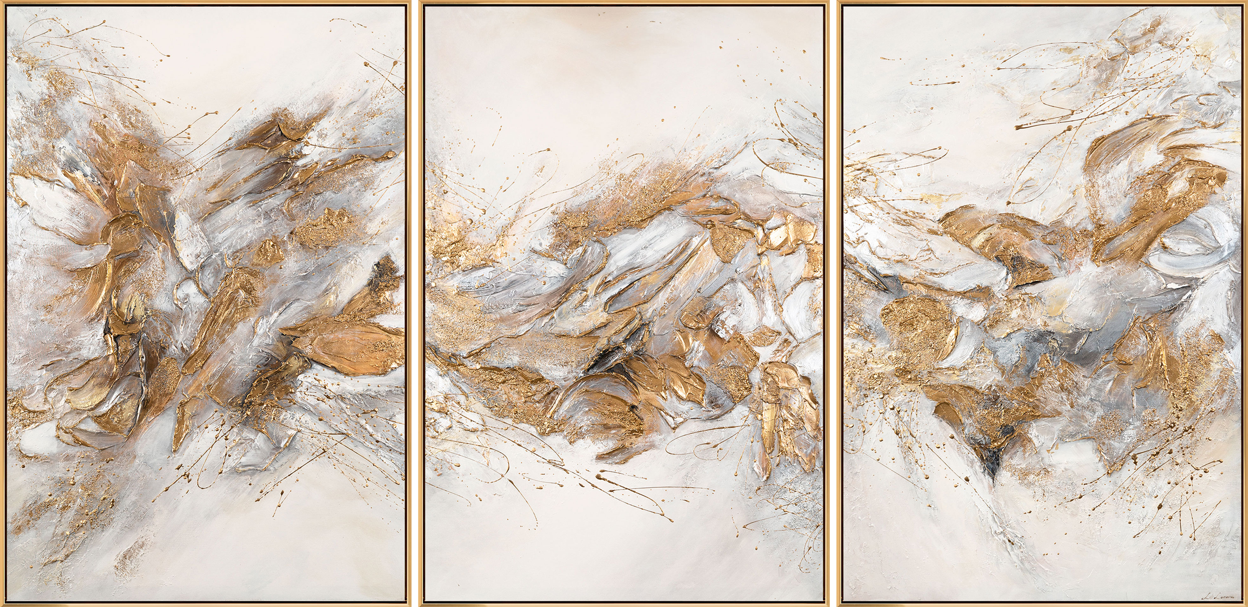 Verrijk uw huis of kantoor met dit elegante abstracte drieluik, dat een harmonieuze compositie vormt door de tinten goud en wit. Het schilderij maakt indruk door de sterke kleuren en expressieve penseelstreken. Het is 100% met de hand beschilderd en voorzien van elegante lijsten.