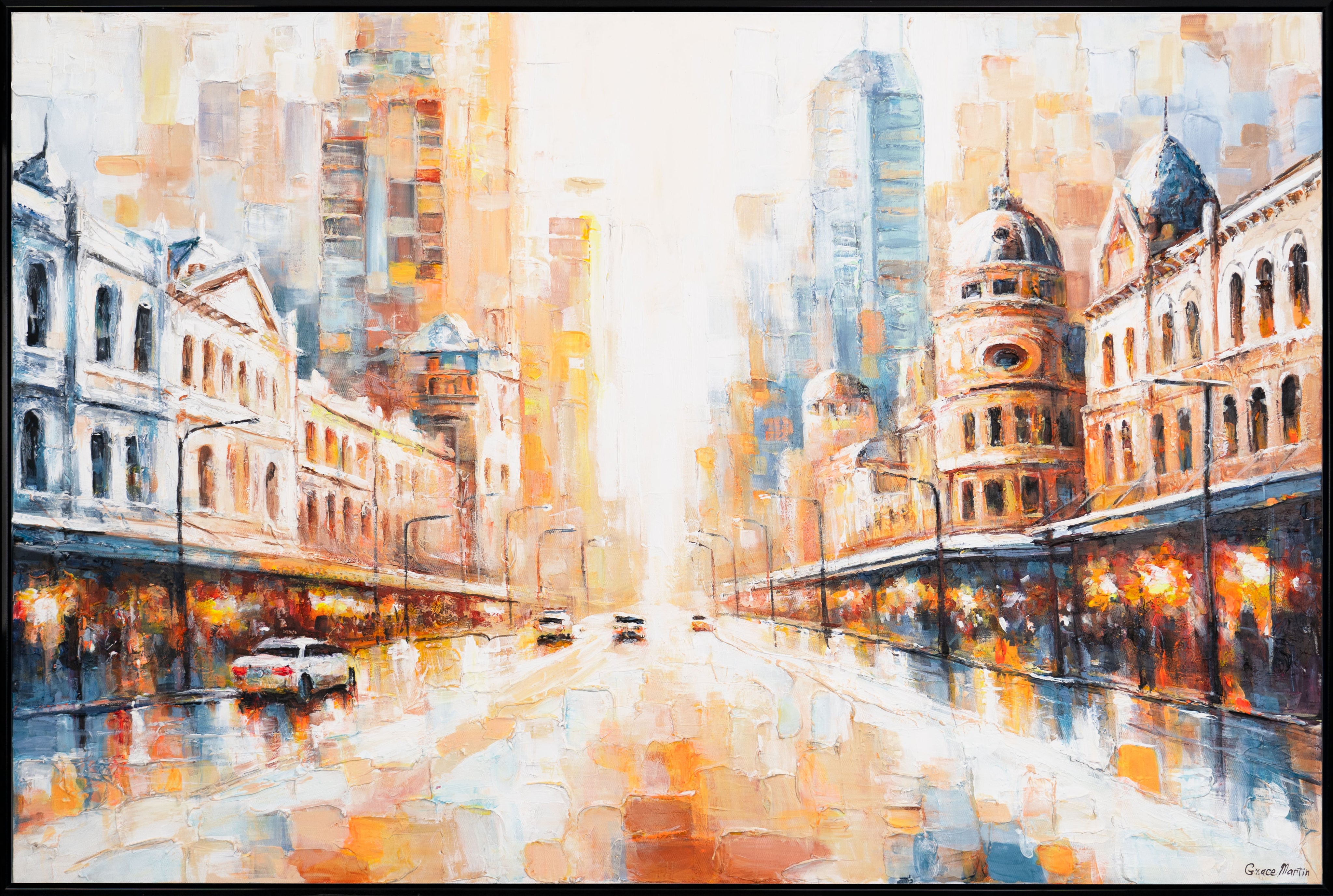 Het handgeschilderde acrylschilderij “Space and Rhythm” brengt stedelijk leven en architectonische elegantie op het doek. In levendige oranje tinten en fel licht ontstaat een gestileerd straatbeeld dat de dynamiek en uitgestrektheid perfect vastlegt.