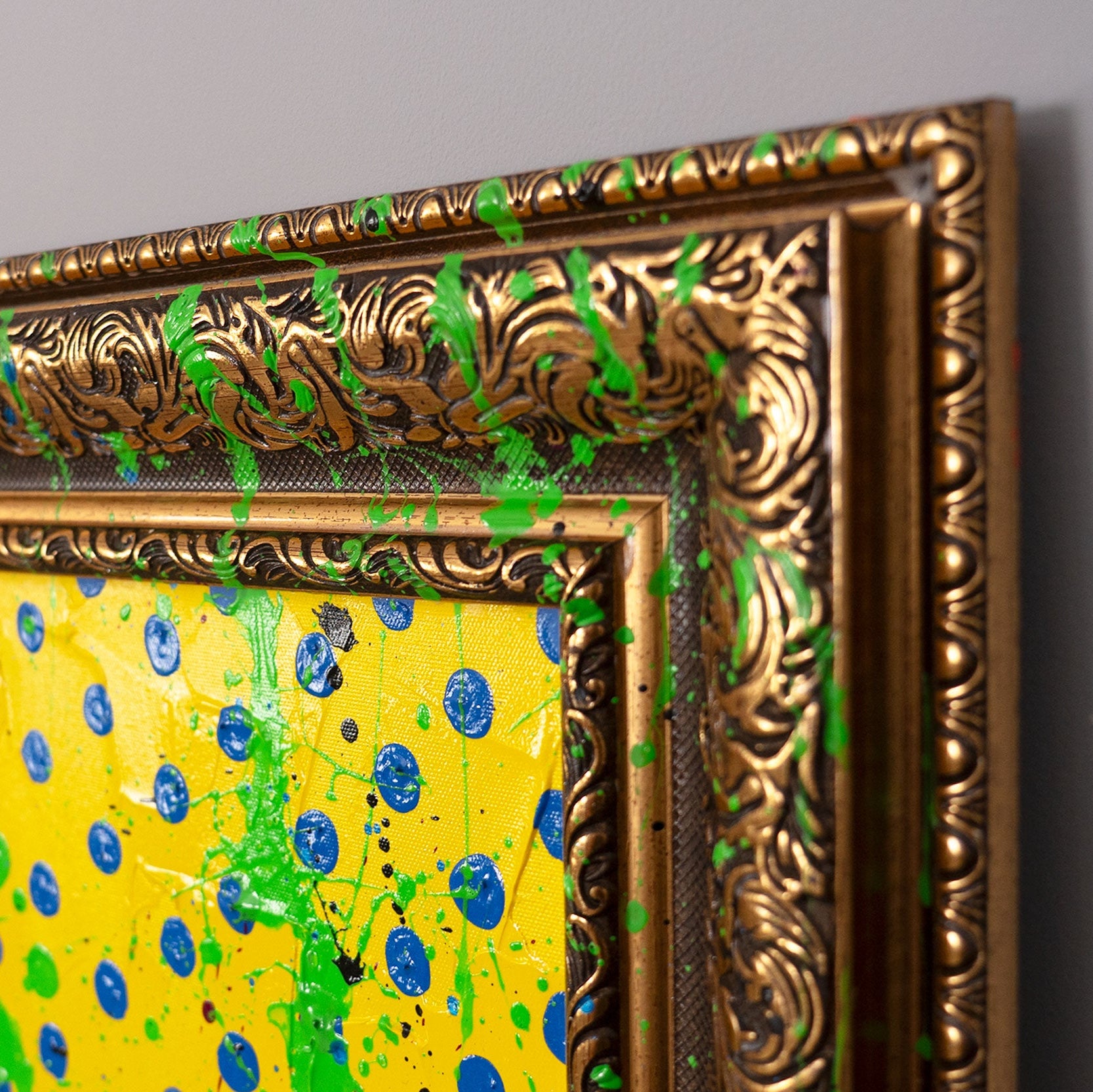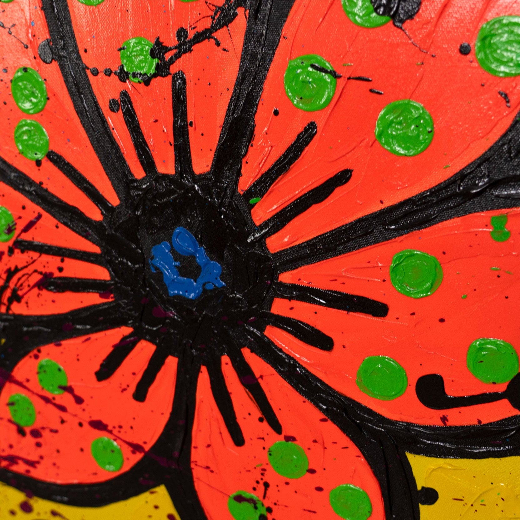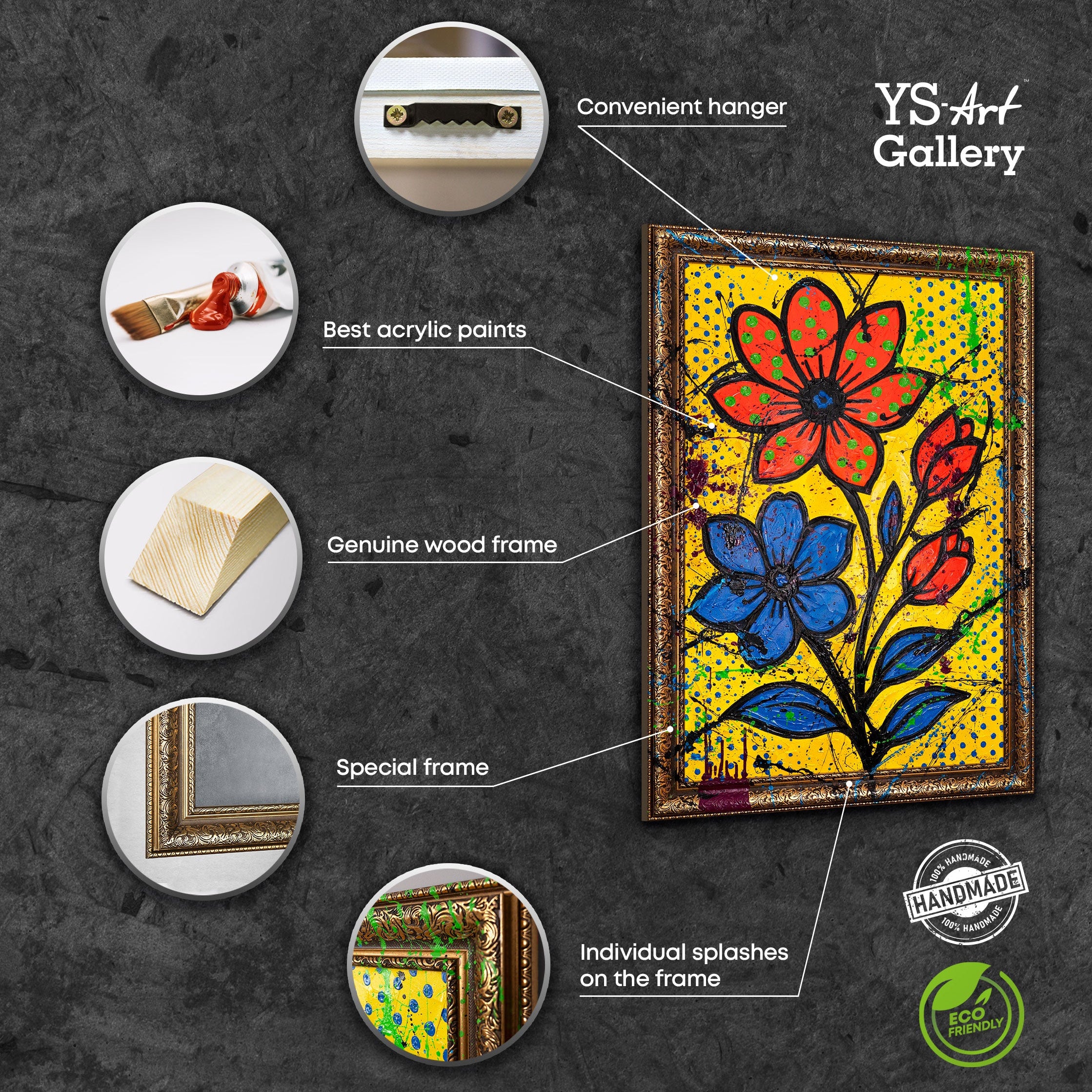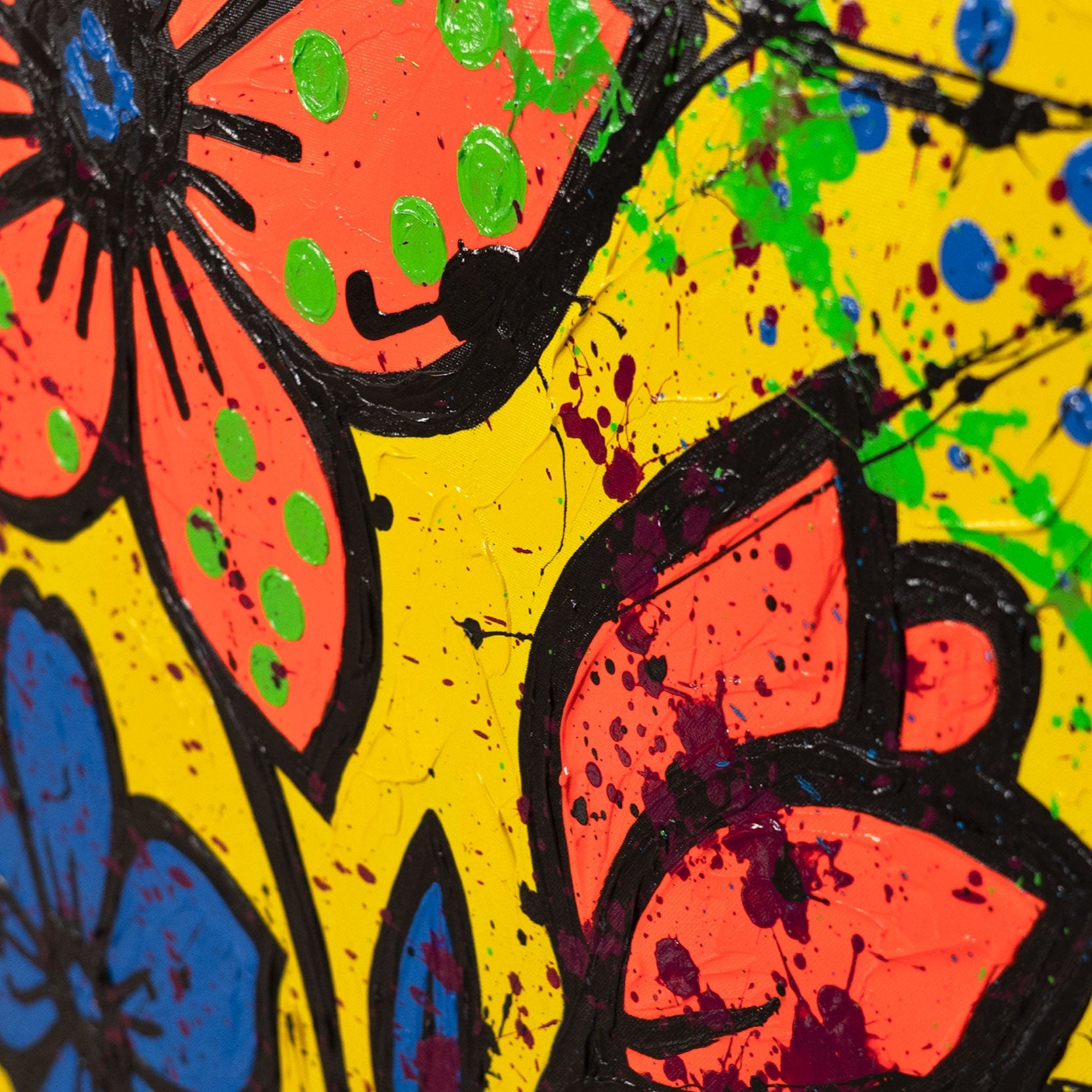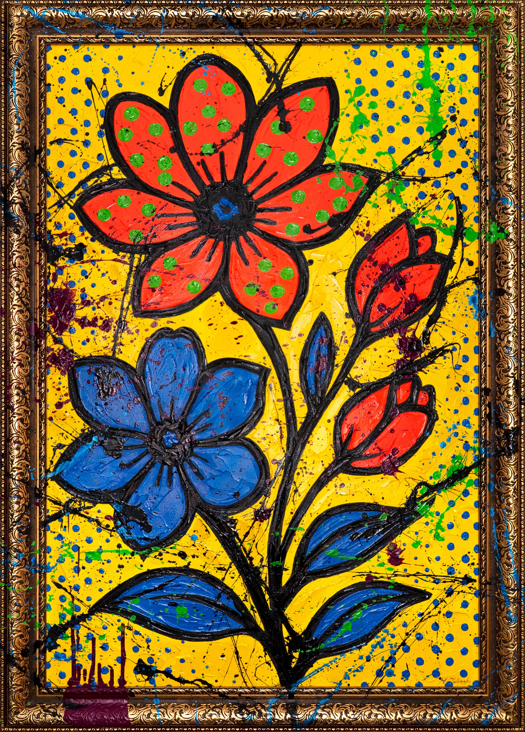 „Blütenrausch“ is een kleurrijk Pop-Art bloemenkunstwerk dat energie en levensvreugde uitstraalt. De felgele achtergrond, de rode en blauwe bloemen met groene accenten en de dynamische verfspatten maken dit werk tot een expressieve uiting van moderne kunst. Elk detail is handgeschilderd en uniek.