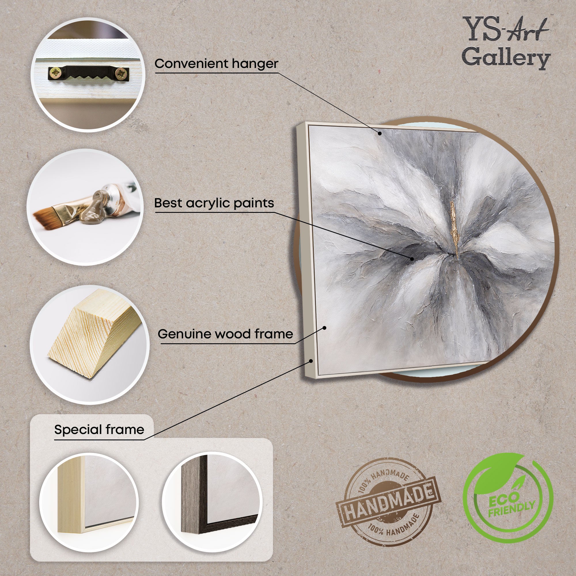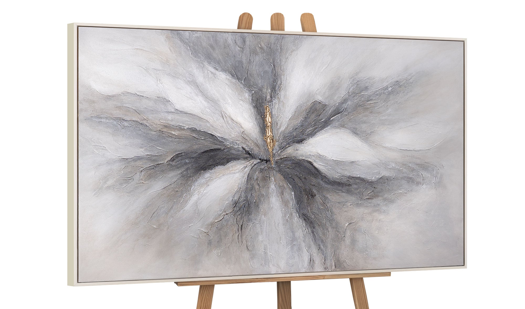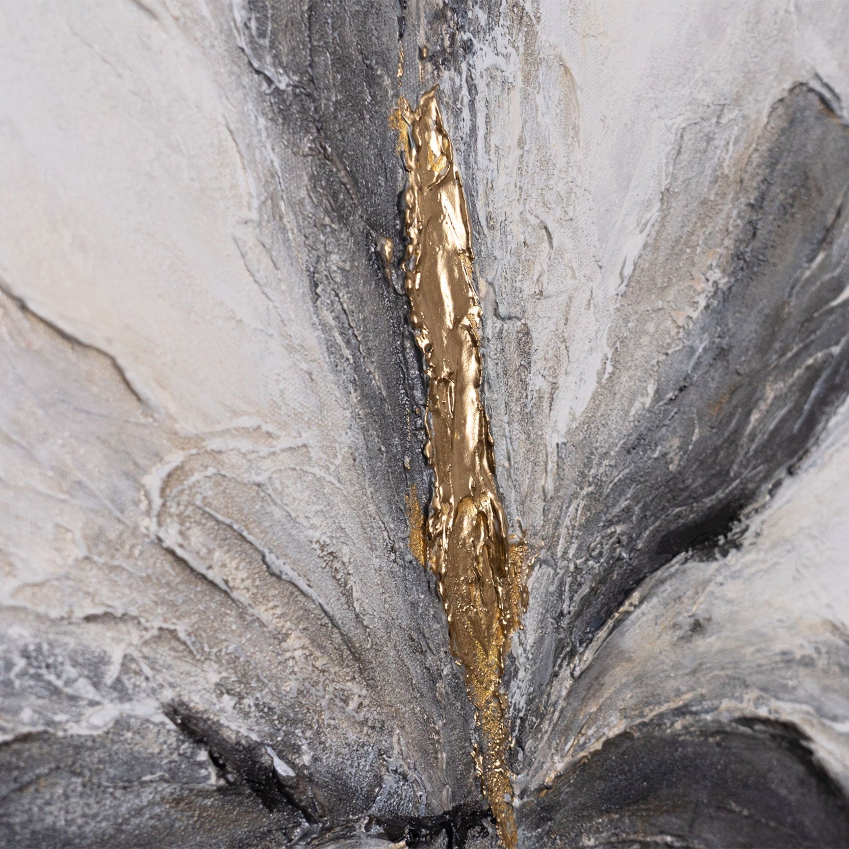 „Goldener Moment“ ist ein elegantes, handgemaltes Acrylgemälde, das durch seine zeitlose Farbkombination von Grau, Weiß und sanften Beigetönen besticht. Im Zentrum des Bildes verläuft ein goldener Akzent, der die Komposition mit edler Wärme durchzieht und die reliefartige Struktur zum Leuchten bringt. Die plastischen Pinselstriche verleihen dem Werk Tiefe und Dynamik, sodass es eine harmonische Ausstrahlung voller Eleganz entfaltet.