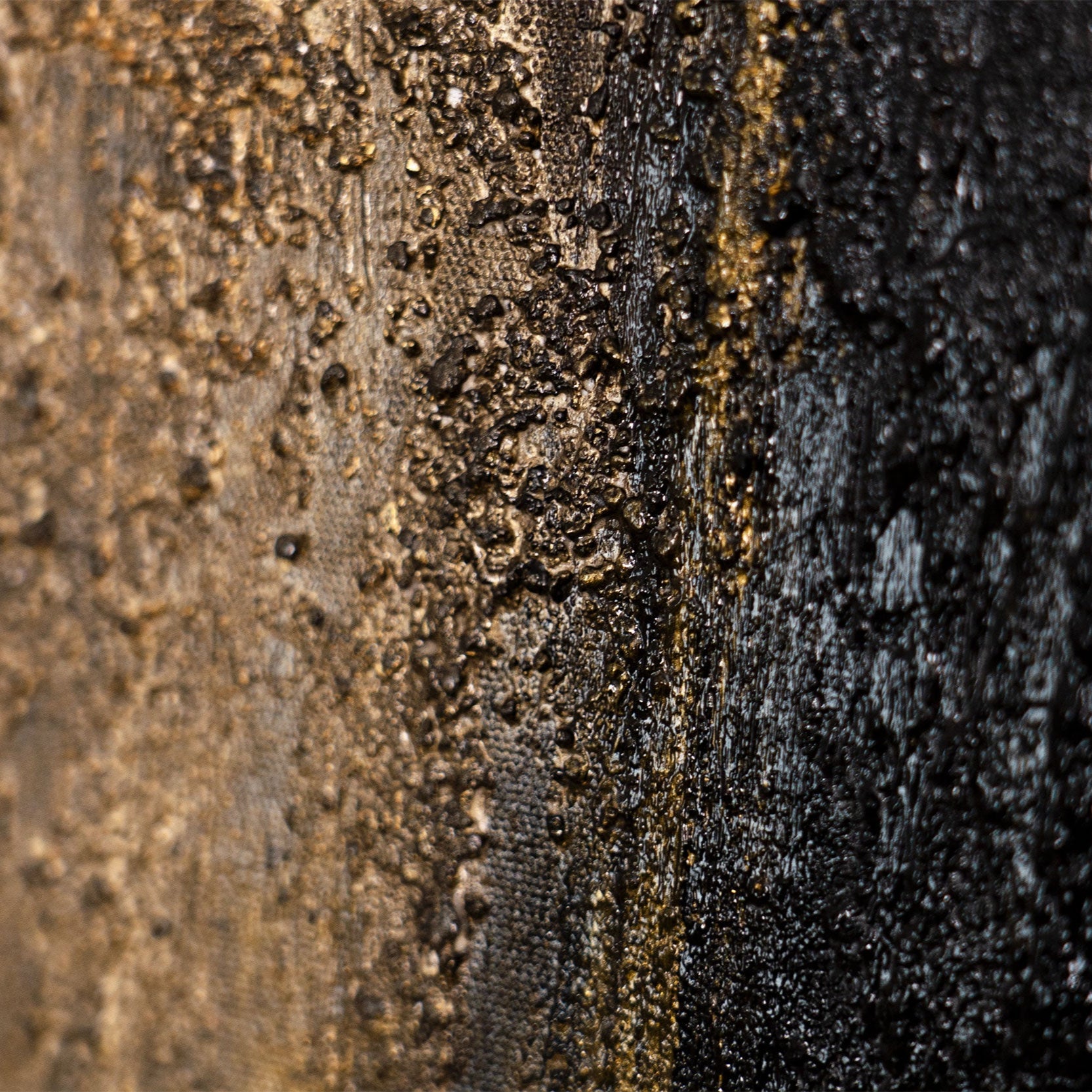 „Tiefe der Zeit“ ist ein kraftvolles, handgemaltes Acrylgemälde, das durch seine kontrastreiche Farbgebung und intensive Struktur besticht. Die Kombination aus tiefem Schwarz, warmen Brauntönen, edlem Gold und einem feinen Rotakzent erzeugt eine mystische und zugleich elegante Wirkung. Die reliefartige Oberfläche verleiht dem Werk Tiefe und Ausdruckskraft.