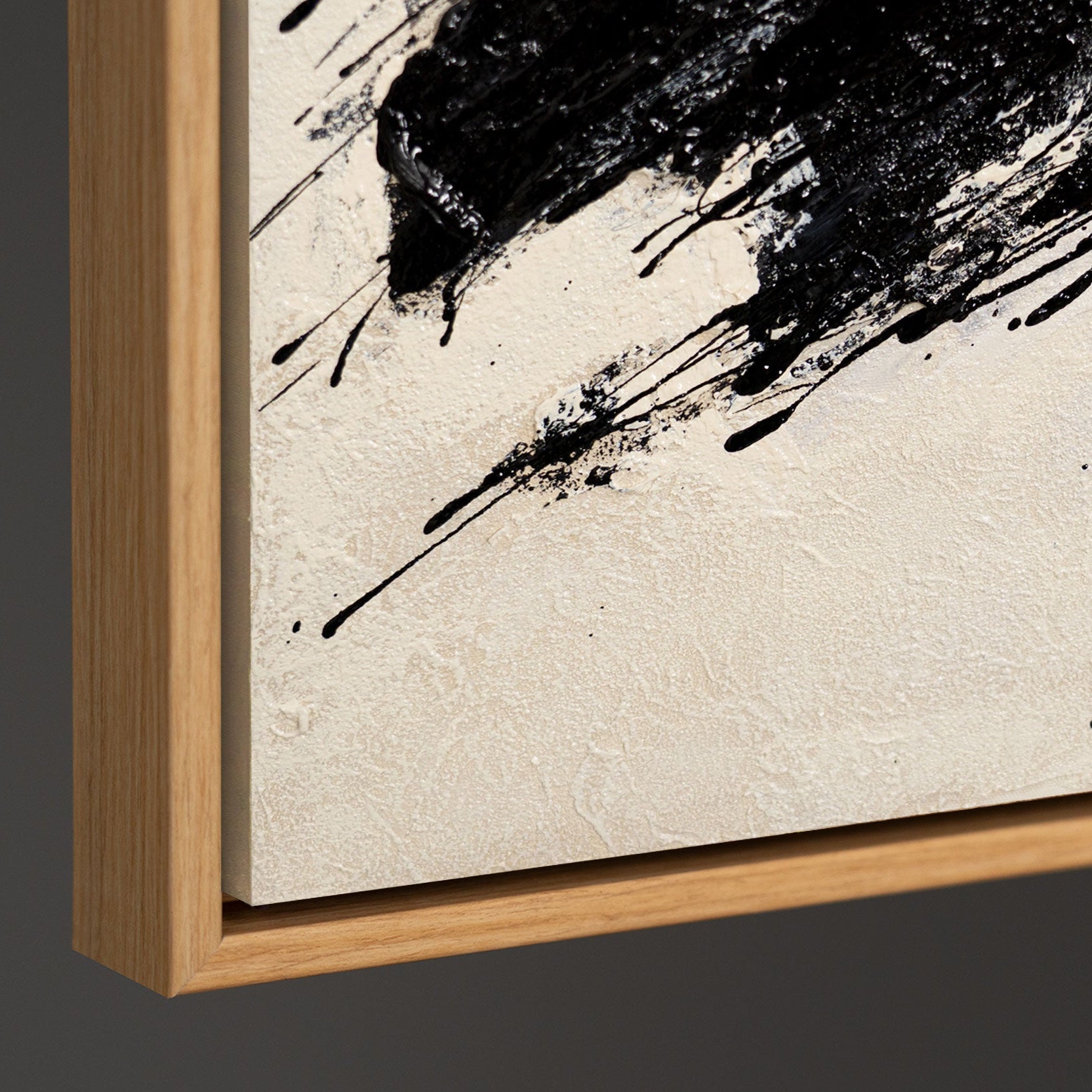 Dit abstracte schilderij kenmerkt zich door een krachtige zwarte penseelstreek die scherp contrasteert met een licht, gestructureerd oppervlak. Het acrylverfschilderij oogt spontaan en dynamisch, met zichtbare lagen en een levendige textuur die het handgeschilderde karakter duidelijk benadrukt.