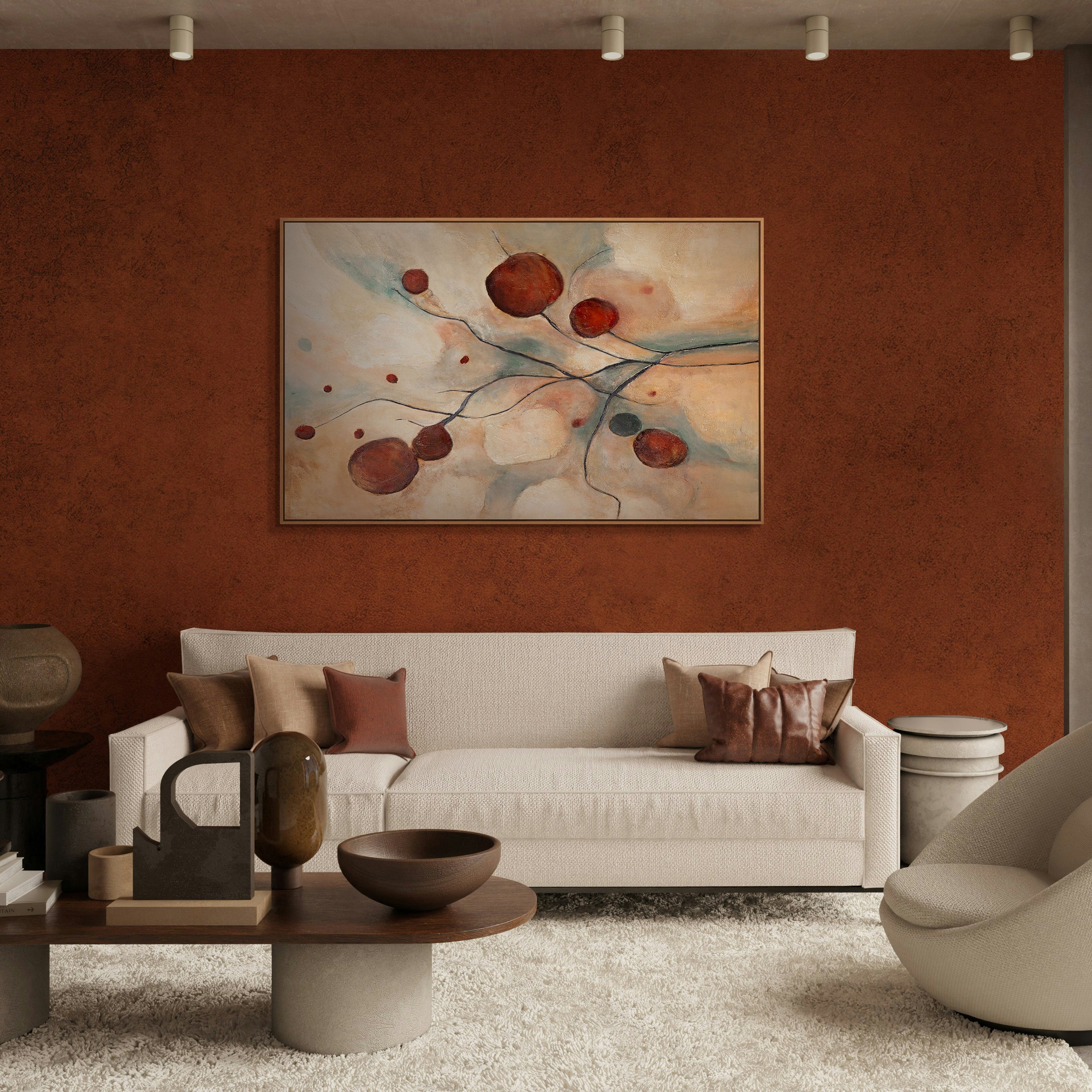 Dieses handgemalte abstrakte Wandbild verbindet sanfte Naturtöne mit ausdrucksstarken scharlachroten Akzenten. Die schwebenden Formen und feinen Linien erinnern an Sternbilder und verleihen dem Gemälde eine ruhige, harmonische Bewegung. Die strukturierte Oberfläche erzeugt Tiefe und macht das Bild lebendig, ohne aufdringlich zu wirken.