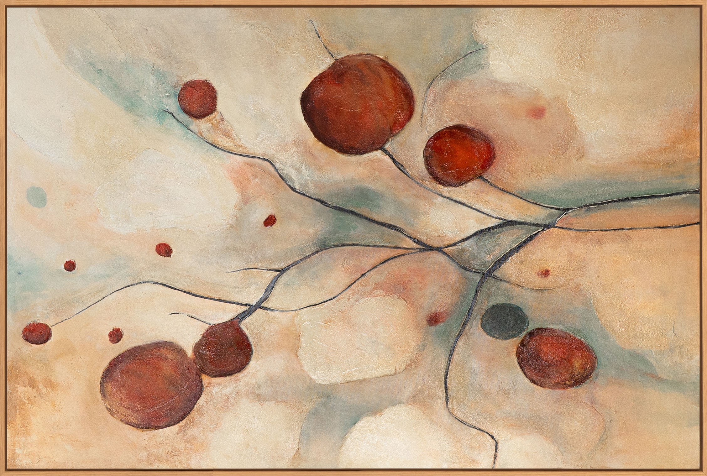 Abstraktes Leinwandbild „Scharlachrote Sternbilder“ in warmen Naturtönen mit Rahmen