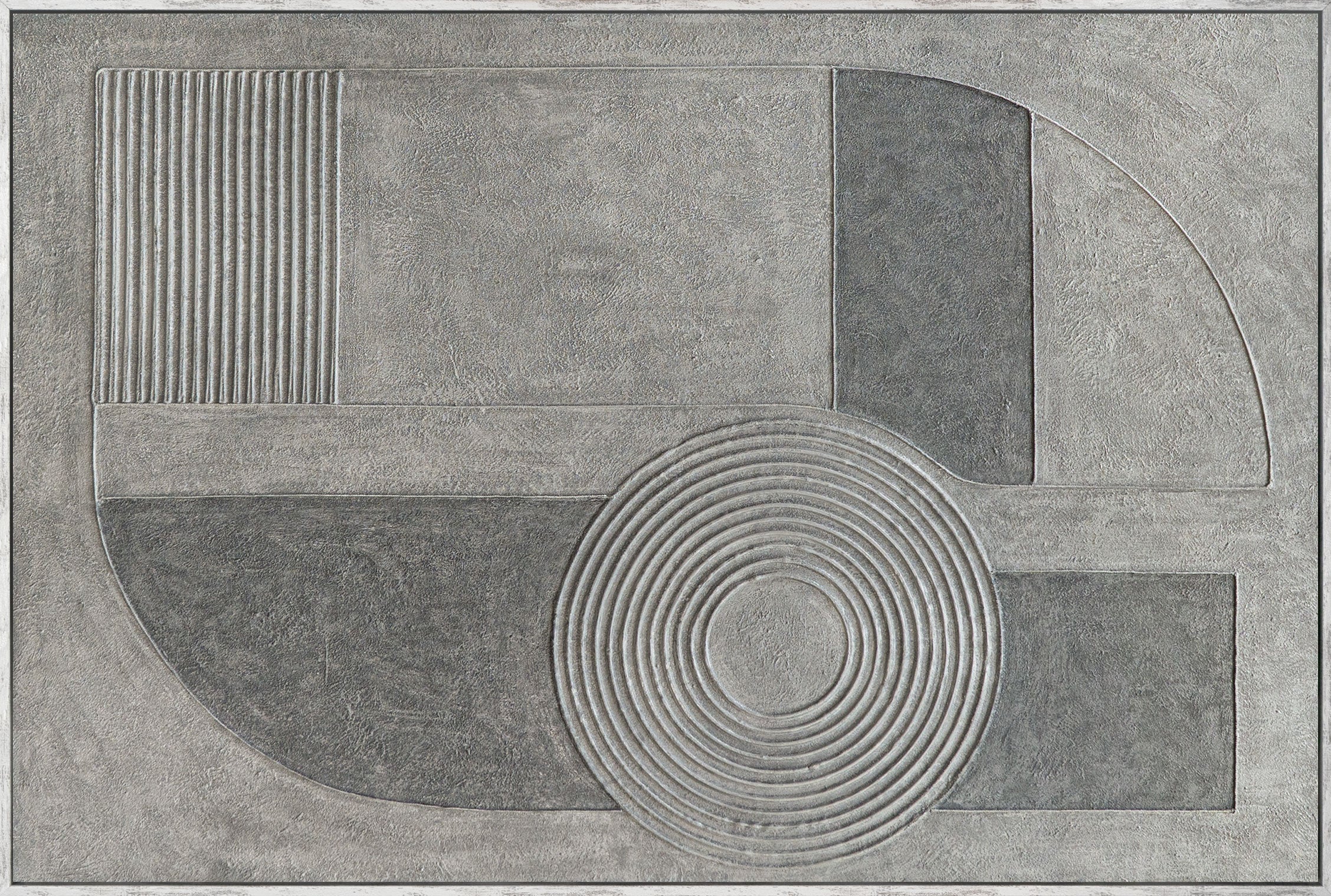 Het abstracte schilderij "Gray Chord" ontvouwt zijn effect door serene geometrische vormen, concentrische cirkels en een fijn gestructureerd oppervlak. Diverse grijstinten vloeien samen tot een harmonieuze compositie die diepte en balans uitstraalt zonder visueel te overheersen. Het reliëfachtige acrylverfschilderij creëert een boeiend samenspel van licht, schaduw en materiaal.