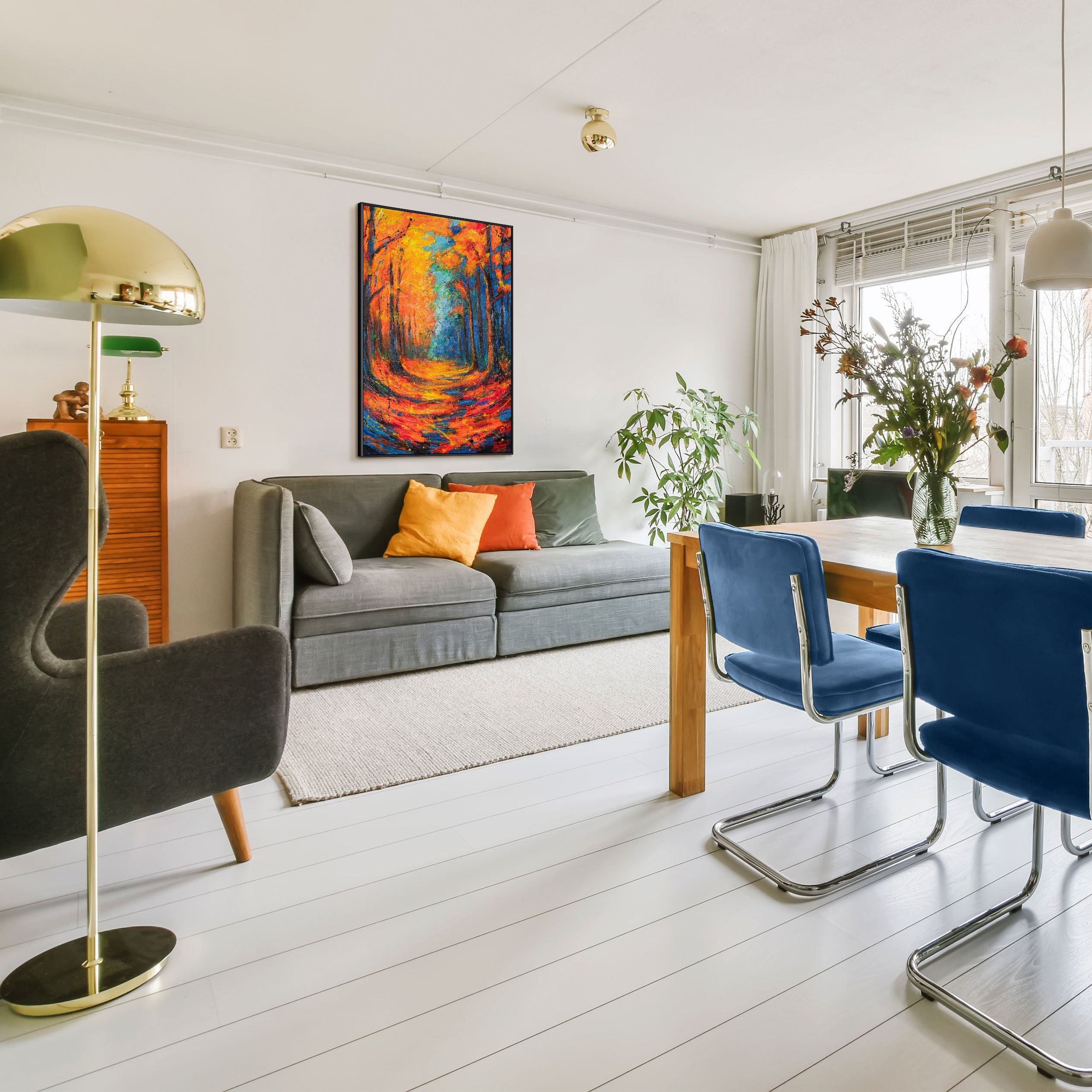 Dit handgeschilderde acrylcanvas is ideaal voor ruimtes die levendigheid en warmte willen uitstralen. De plastische penseelstreken en levendige kleuren maken elk exemplaar tot een echte blikvanger.