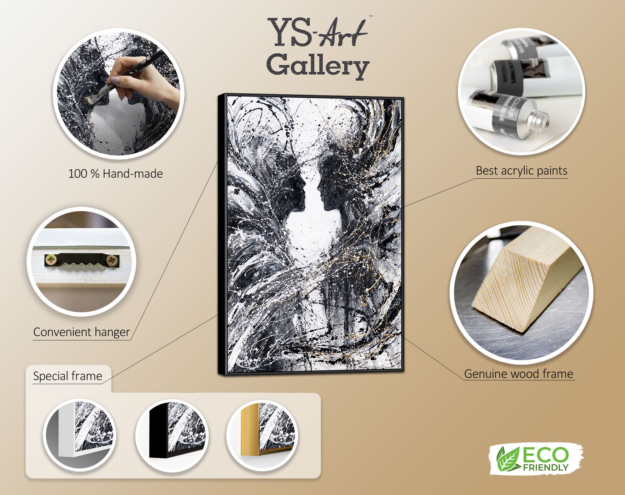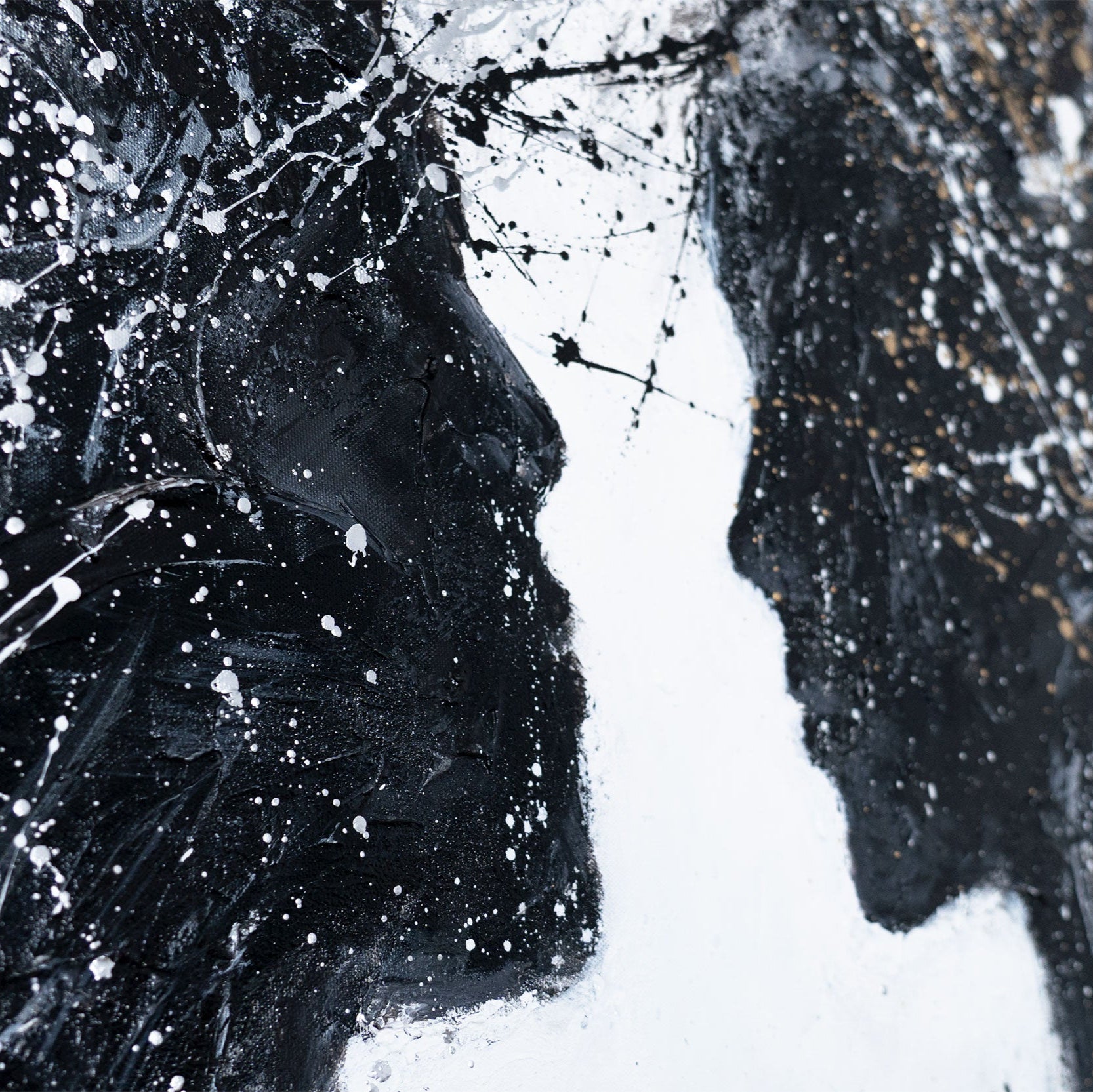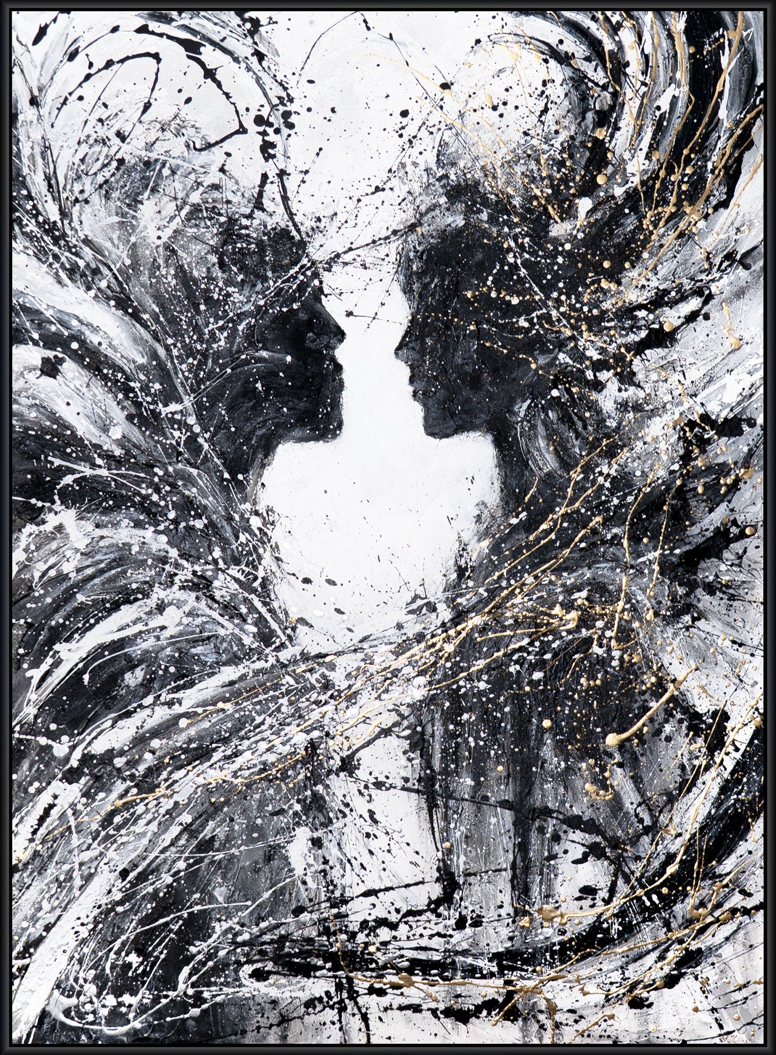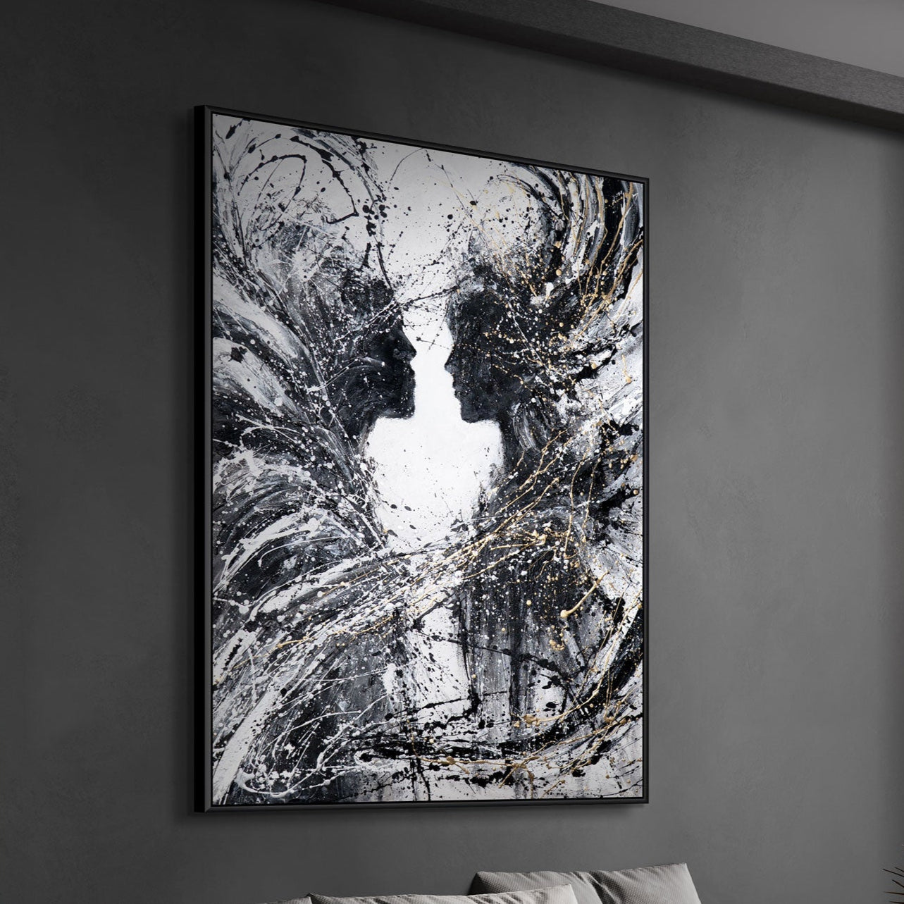 Twee tegenovergestelde silhouetten lijken samen te smelten in het midden van een abstracte werveling van zwart, wit en goud. De dynamische penseelstreken en gesprenkelde lijnen creëren een gevoel van innerlijke verbondenheid, een emotief gesprek zonder woorden. De contrastrijke weergave brengt intensiteit over, terwijl gouden accenten zorgen voor elegantie en diepte.