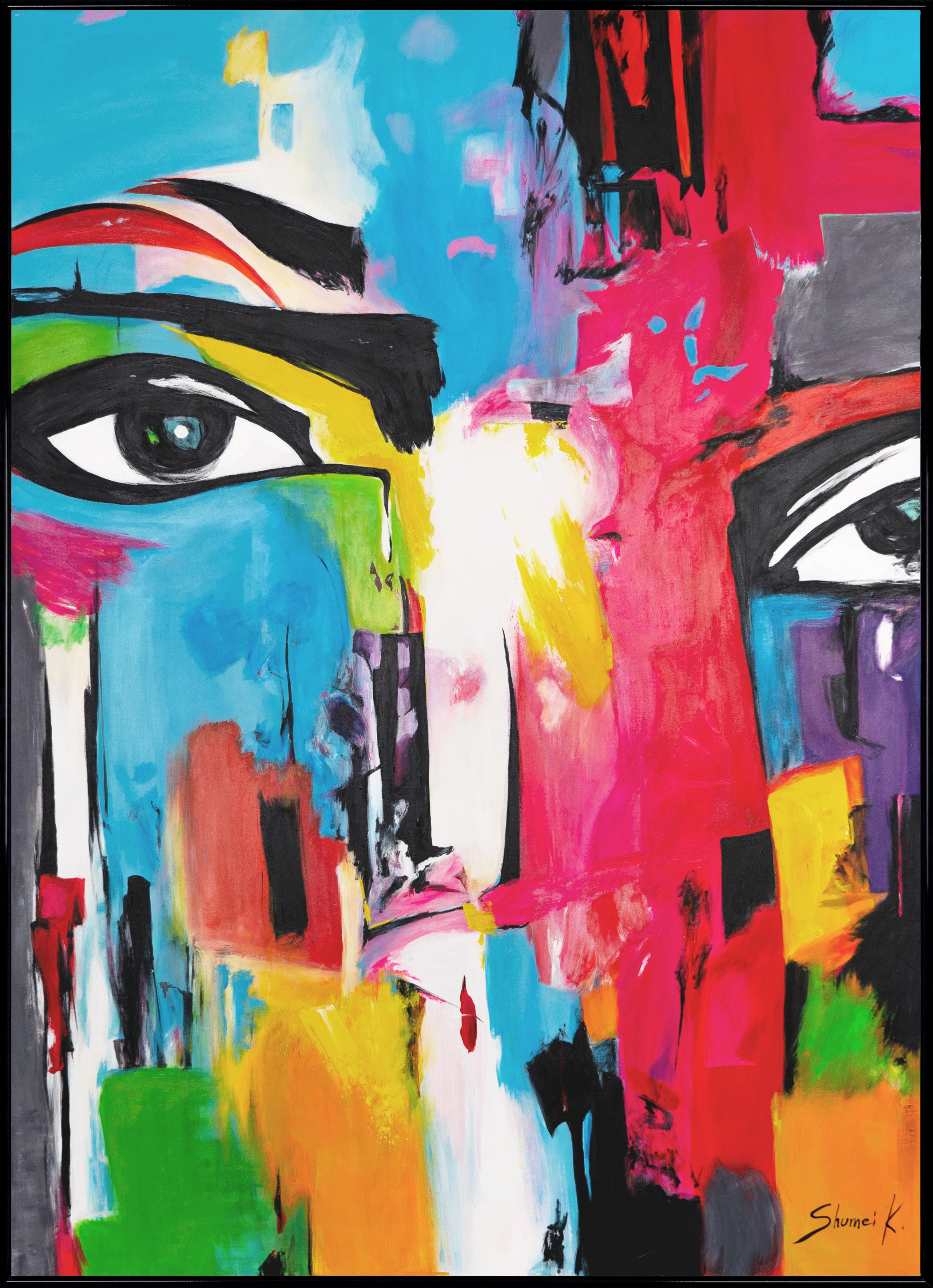 Dit moderne, abstracte portret is volledig met de hand gemaakt. De levendige kleuren en gedurfde lijnen geven het gezicht een intense expressiviteit die elke kamer verrijkt. Het frame kan worden aangepast zodat het perfect past bij uw interieurconcept. Dankzij onze gratis verzending ontvangt u dit kunstwerk binnen 1-3 dagen en kunt u het meteen in uw huis ophangen.