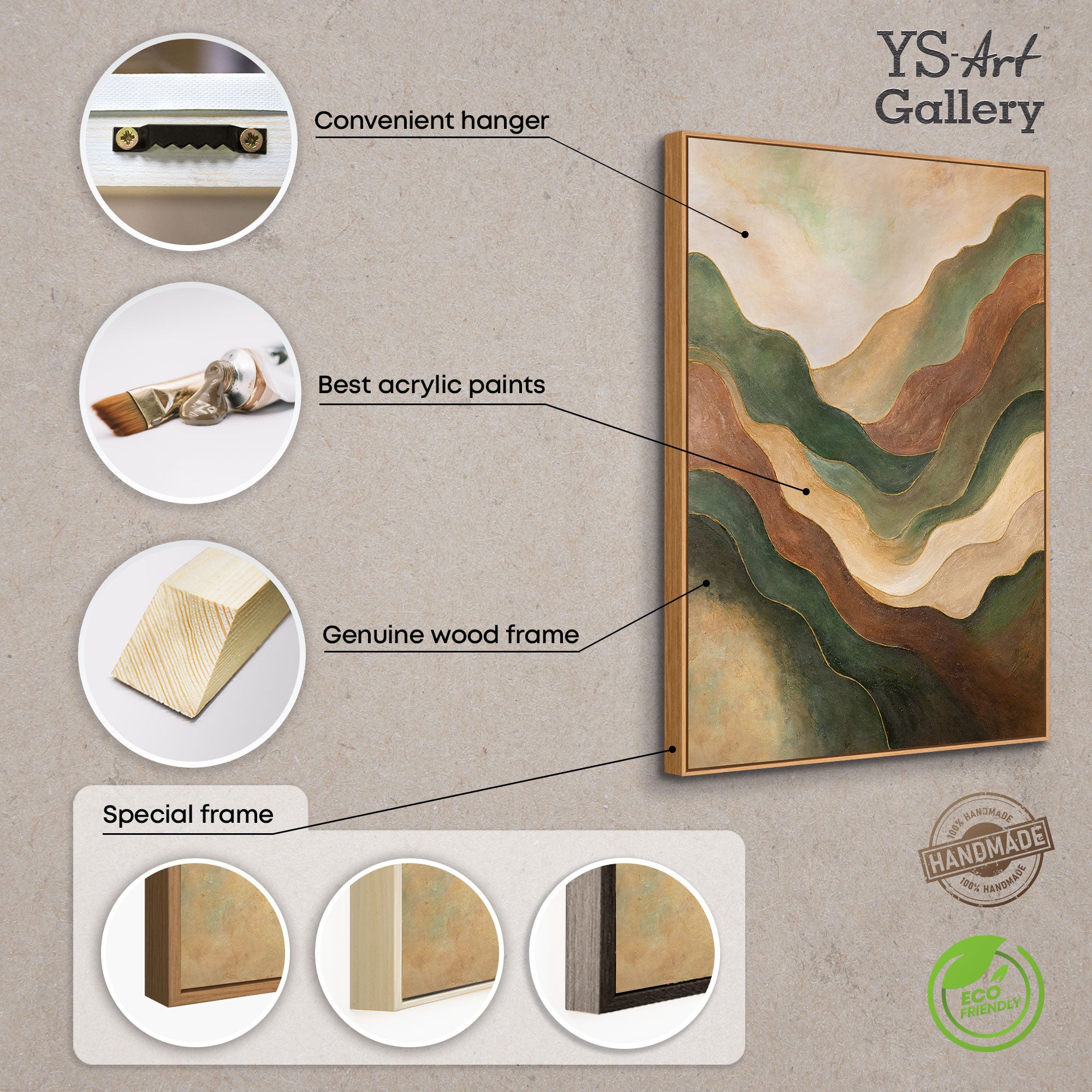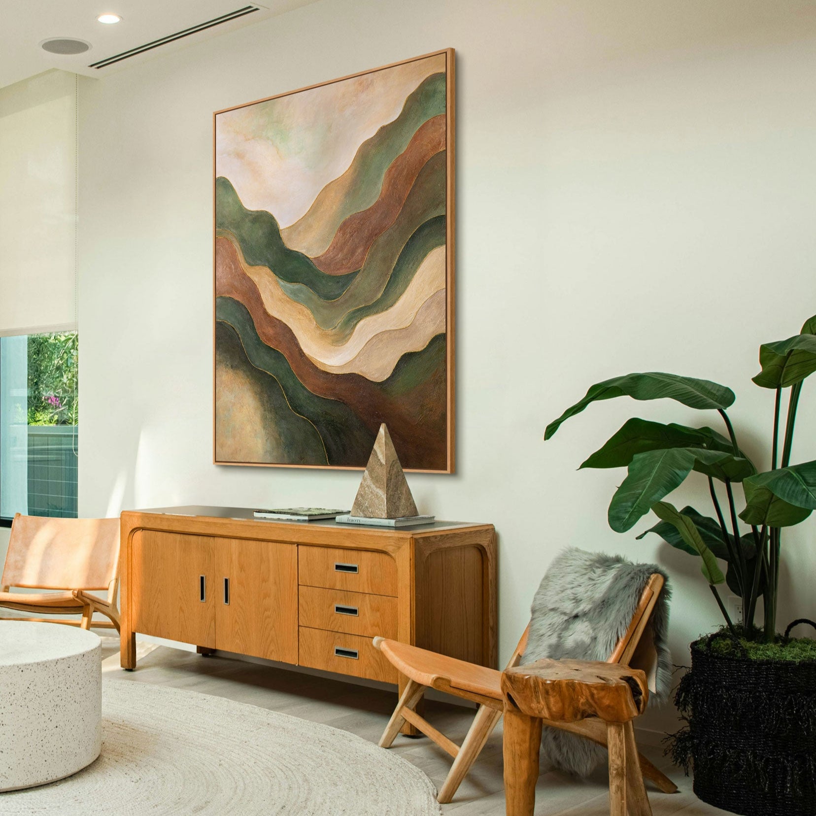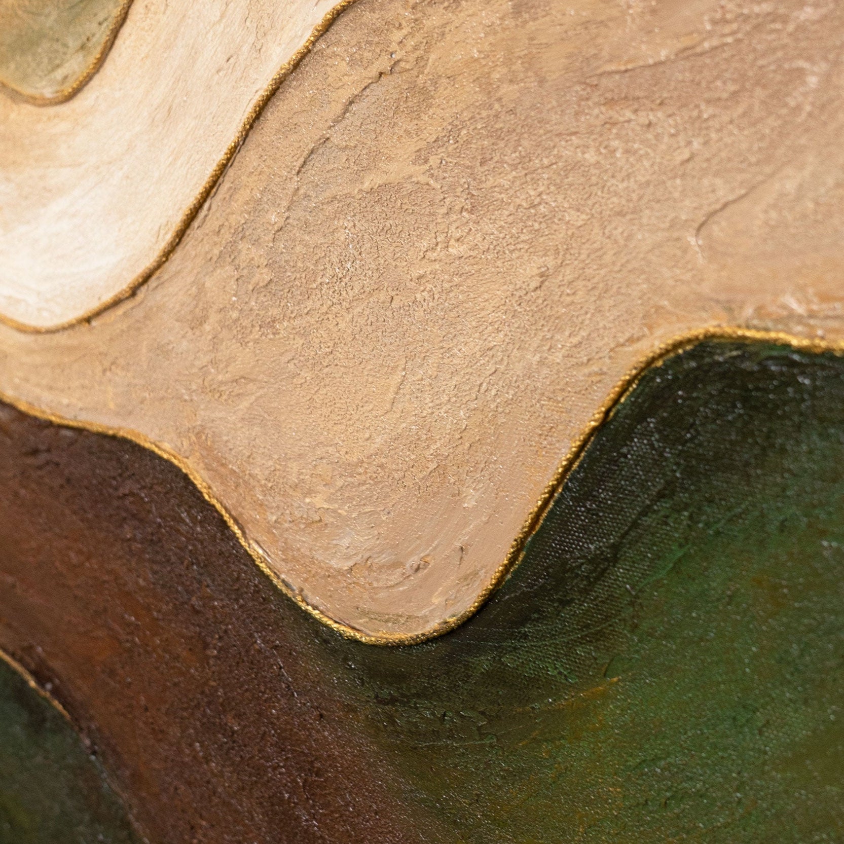 Dieses abstrakte Leinwandbild fügt sich perfekt in moderne, skandinavische oder klassische Einrichtungen ein. Es verleiht Wohnzimmer, Schlafzimmer oder Büro eine warme, erdige Ausstrahlung und schafft eine beruhigende Atmosphäre, die das Auge fesselt und den Raum ausbalanciert.