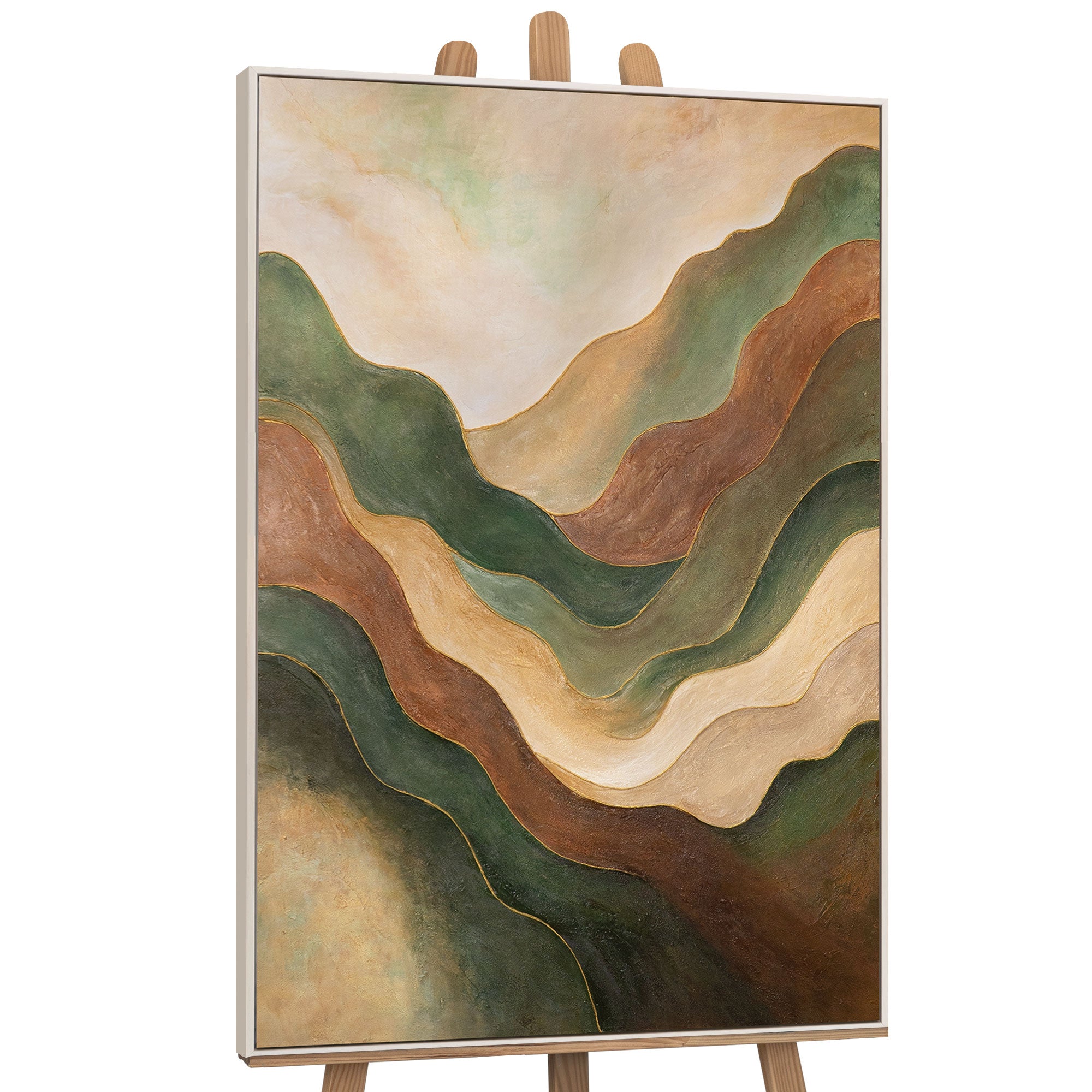 „Tanz der Hügel“ ist ein atmosphärisches Acrylgemälde, das die sanften Bewegungen einer hügeligen Landschaft einfängt. Die fließenden Linien in Grün, Braun und Beige erzeugen eine harmonische Wellenstruktur, die Naturverbundenheit und Ruhe ausstrahlt. Durch die strukturierte Malweise erhält das Bild Tiefe und eine besondere haptische Qualität.