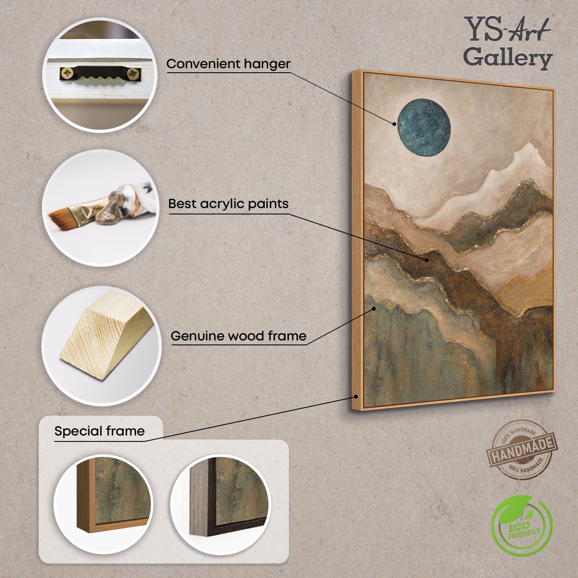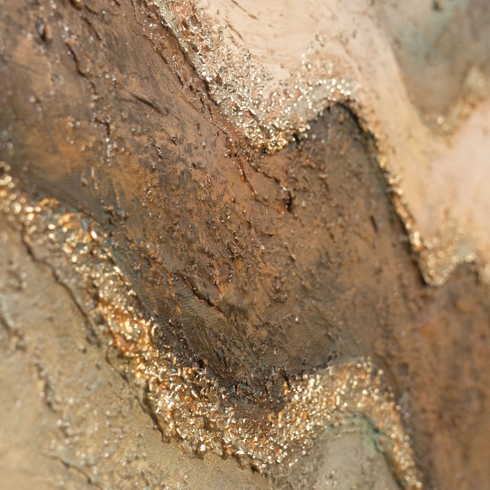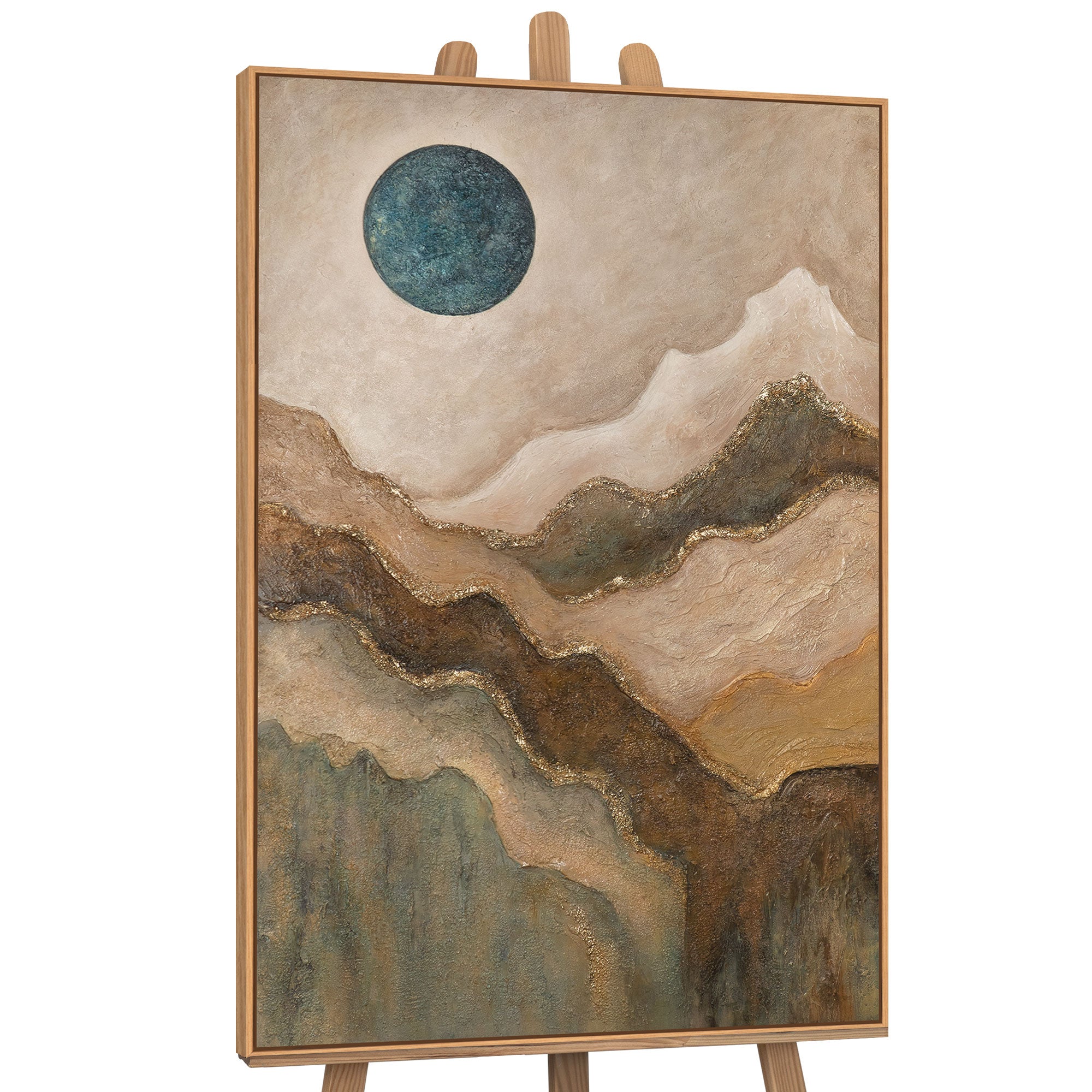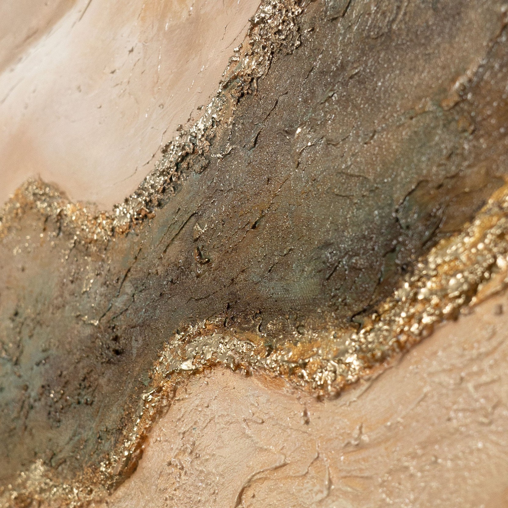 „Smaragdgrüne Sonne“ ist ein atmosphärisches Acrylgemälde, das eine abstrahierte Berglandschaft in warmen Naturtönen zeigt. Fließende Linien in Beige, Braun und Gold treffen auf die intensive Präsenz einer smaragdgrünen Sonne, die dem Werk Tiefe und Mystik verleiht. Die strukturierte Oberfläche verstärkt die Natürlichkeit und verleiht der Komposition einen ausdrucksstarken Charakter.