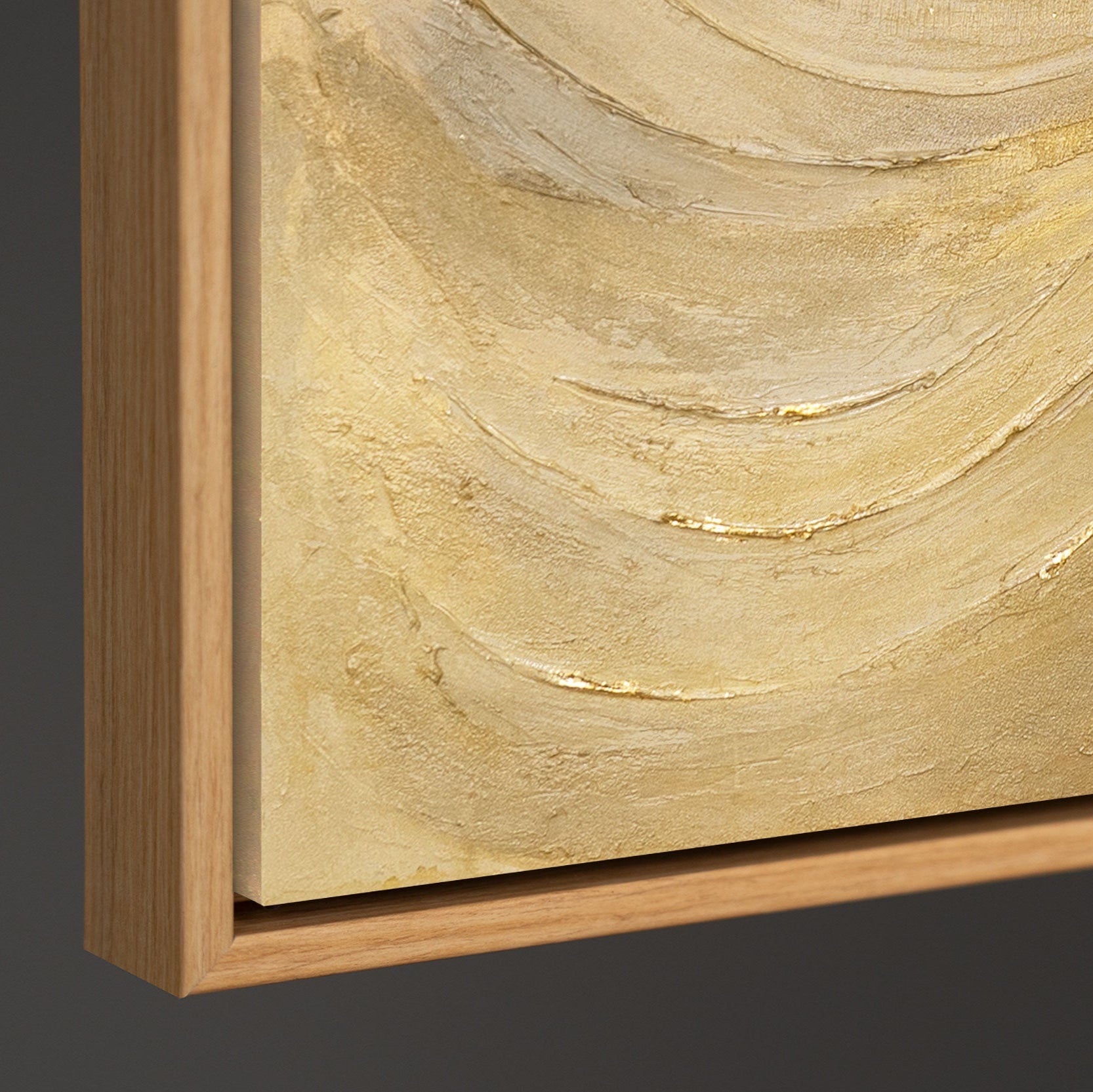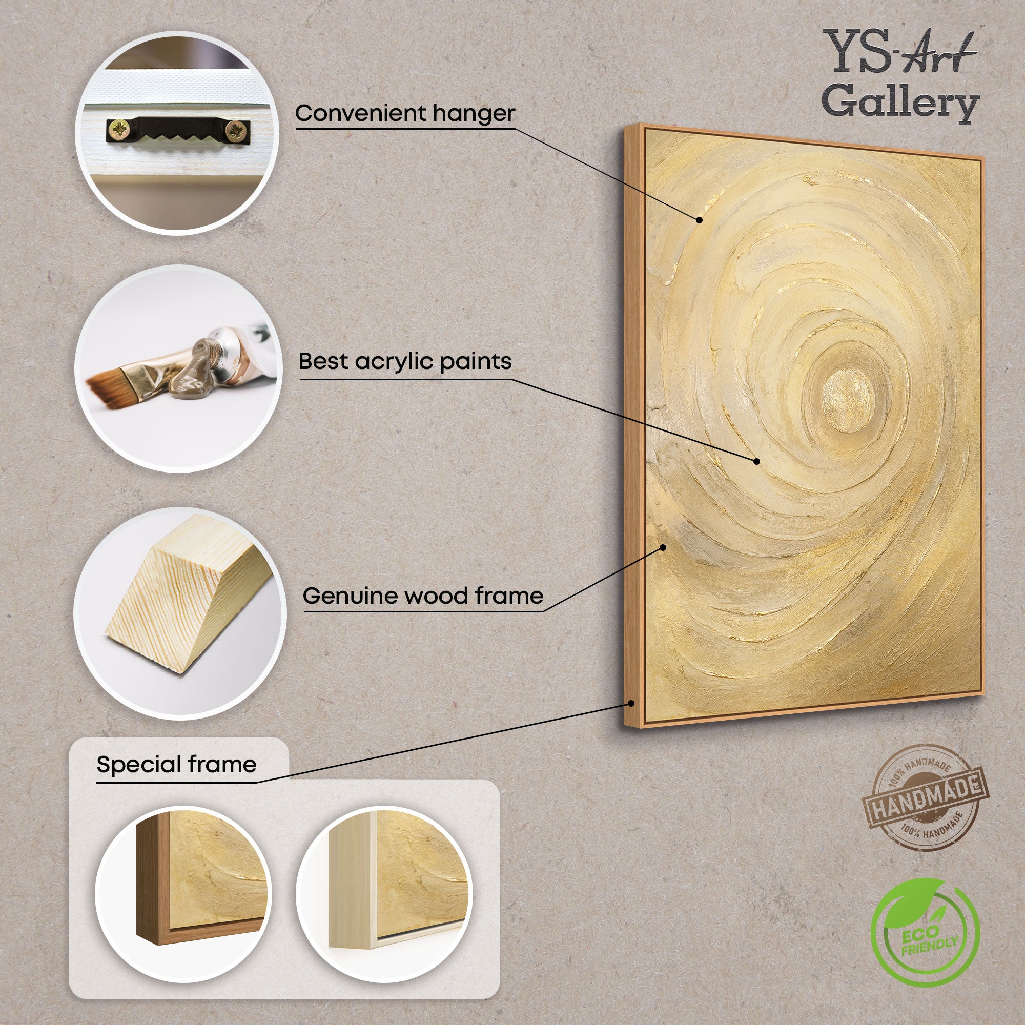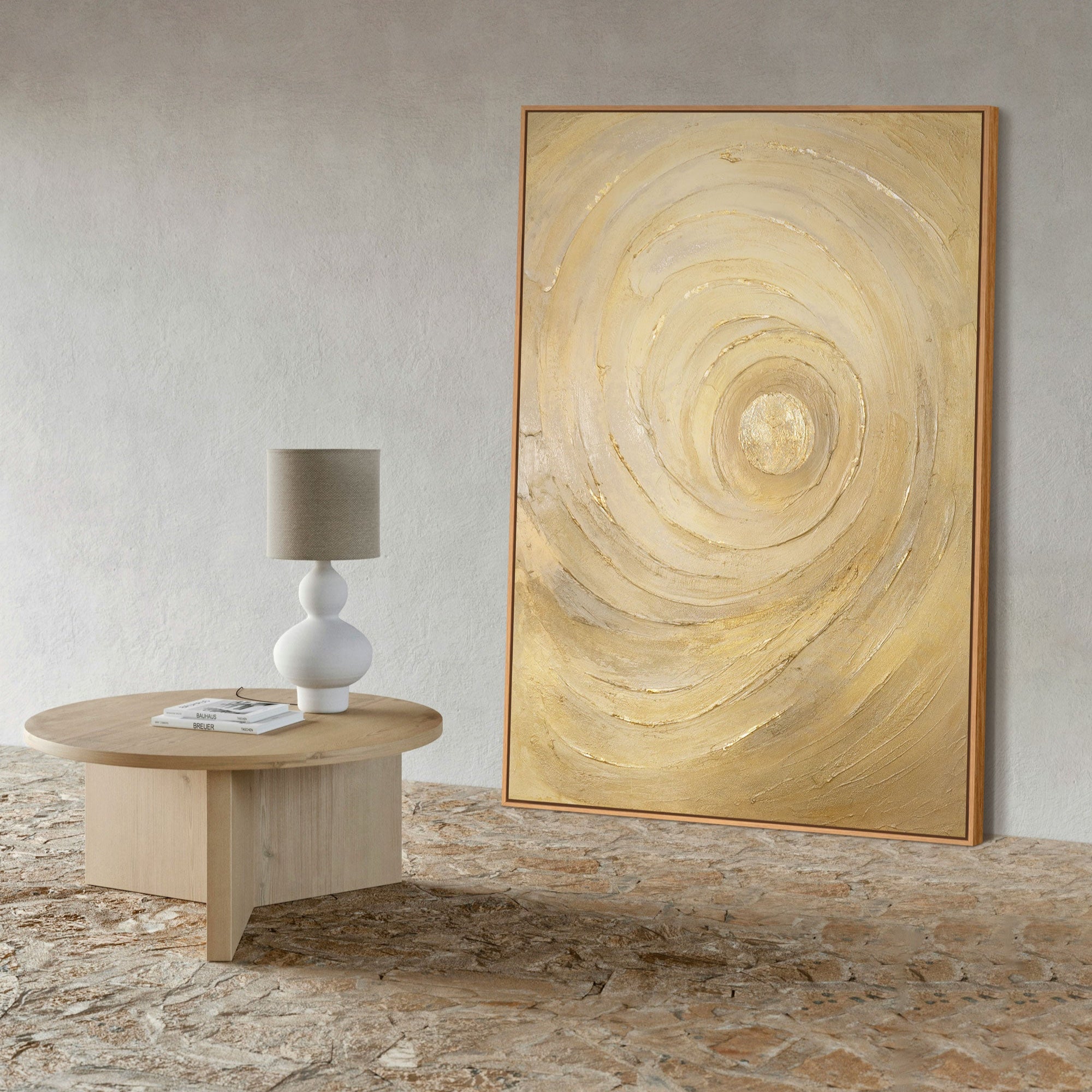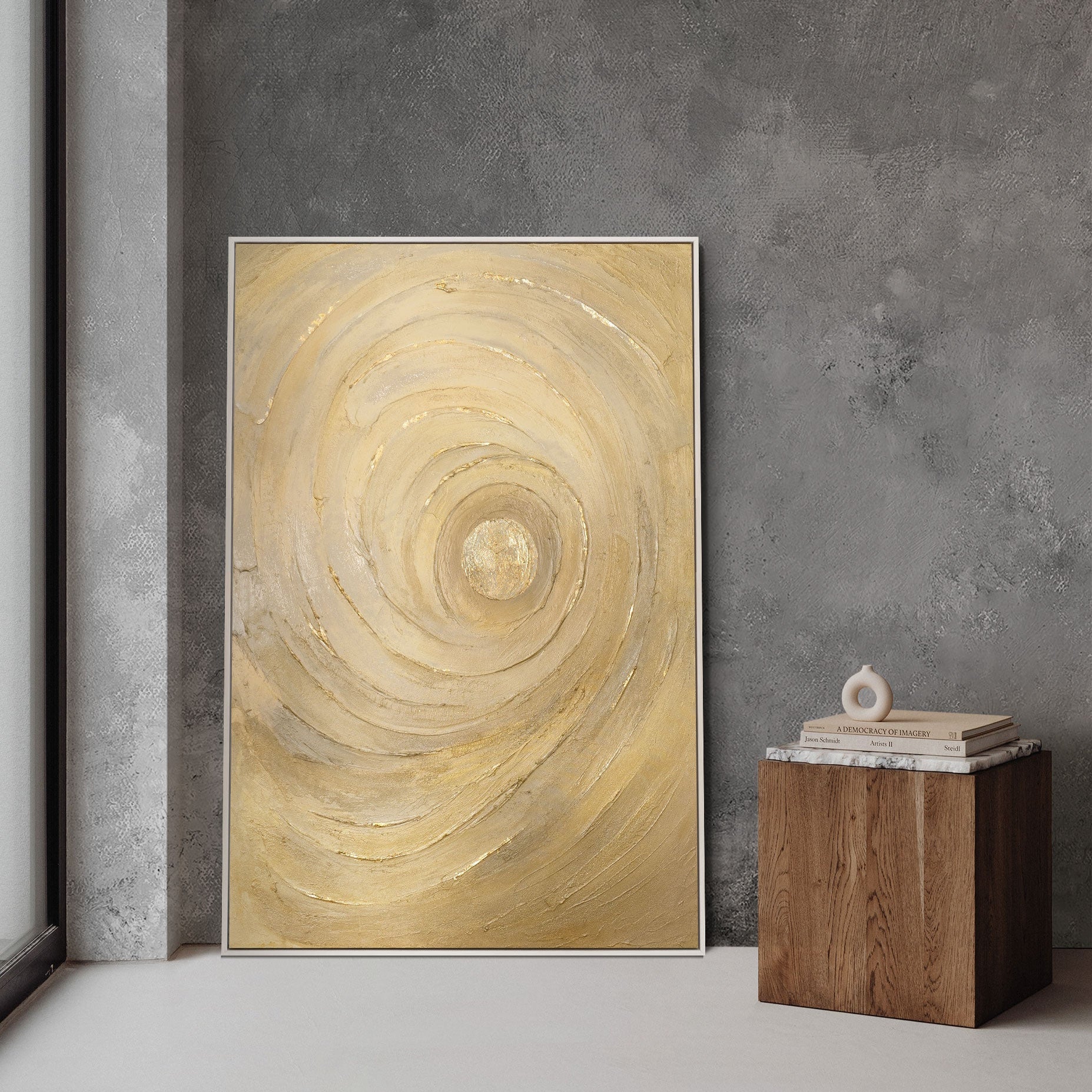 Das Gemälde „Kreise der Zeit“ fasziniert mit seiner harmonischen Spiralform, die in schimmernden Goldtönen auf einer strukturierten Leinwand erstrahlt. Die konzentrischen Formen erinnern an den unaufhörlichen Fluss der Zeit und erzeugen einen meditativen, fast hypnotischen Effekt.