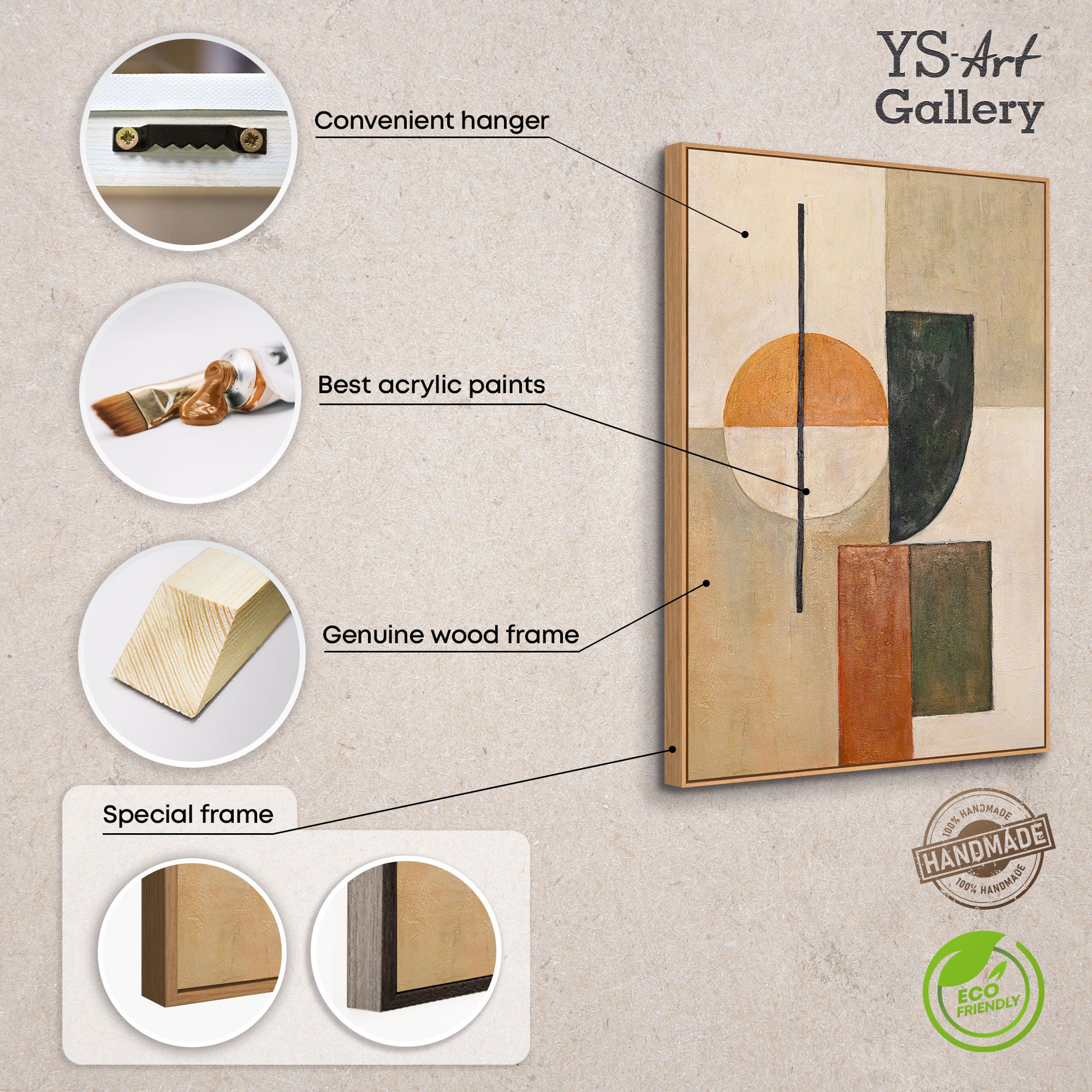 „Gleichgewicht“ ist ein handgemaltes Acrylgemälde, das durch seine klaren Formen, Linien und eine ausgewogene Farbpalette aus Beige, Grün, Rostrot und Schwarz besticht. Die geometrische Komposition strahlt Ruhe und Stabilität aus, während die strukturierte Oberfläche dem Bild Tiefe und Ausdruck verleiht.
