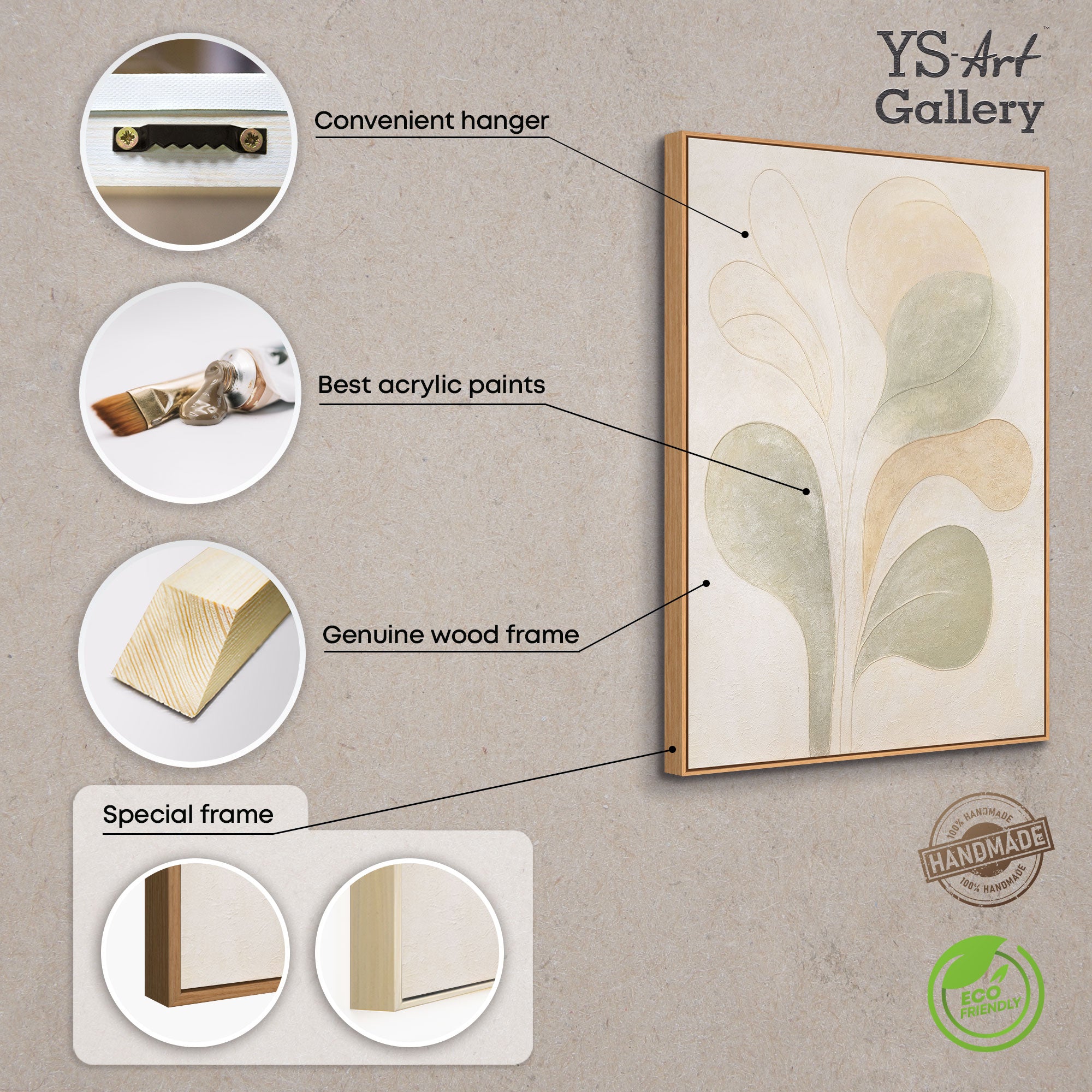 Dieses handgemalte Leinwandbild überzeugt durch seine organischen Formen und die zarten Farbtöne in Beige, Grün und Sand. Mit feiner Struktur gearbeitet, wirkt das Kunstwerk leicht, harmonisch und zugleich elegant – ein Symbol für Ruhe und Natürlichkeit.