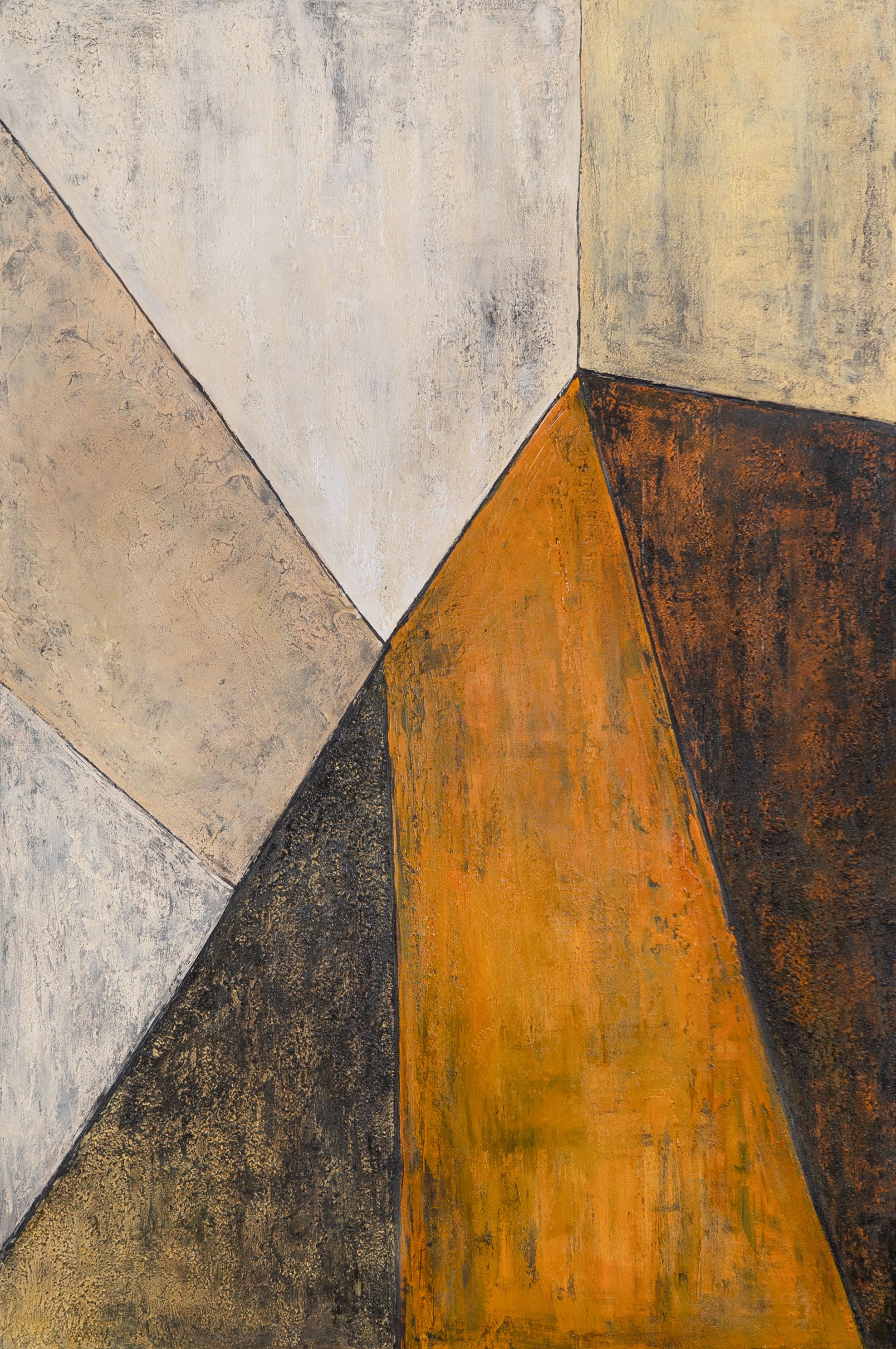 "Ontmoeting van de niveaus" is een handgeschilderd acryl schilderij dat geometrische vlakken en zachte structuren in harmonieuze balans brengt. Het contrasterende kleurenpalet van warm oranje, gedempt zwart en licht beige geeft de compositie diepte en dynamiek. Het gestructureerde oppervlak vangt subtiel het licht en creëert een spel van vorm, kleur en textuur.