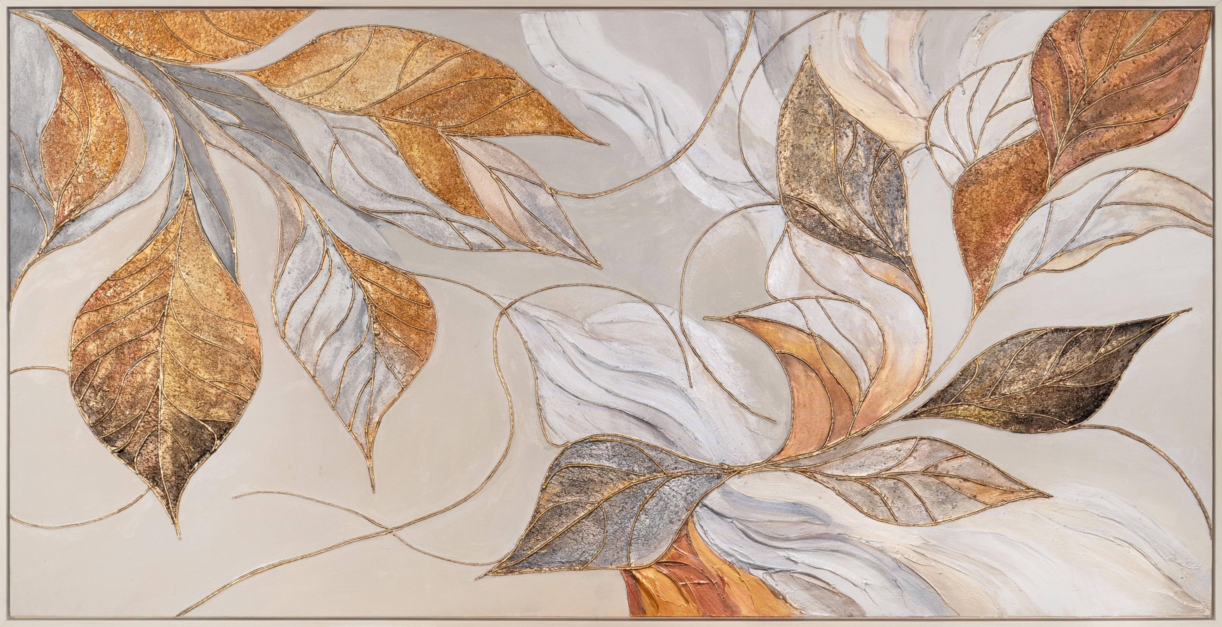 Dit elegante acrylschilderij brengt de schoonheid van de natuur in een gestileerde vorm naar uw muur. Gouden en bronzen bladeren worden op een gestructureerd canvas gecombineerd tot een harmonieus kunstwerk dat warmte en verfijning uitstraalt.