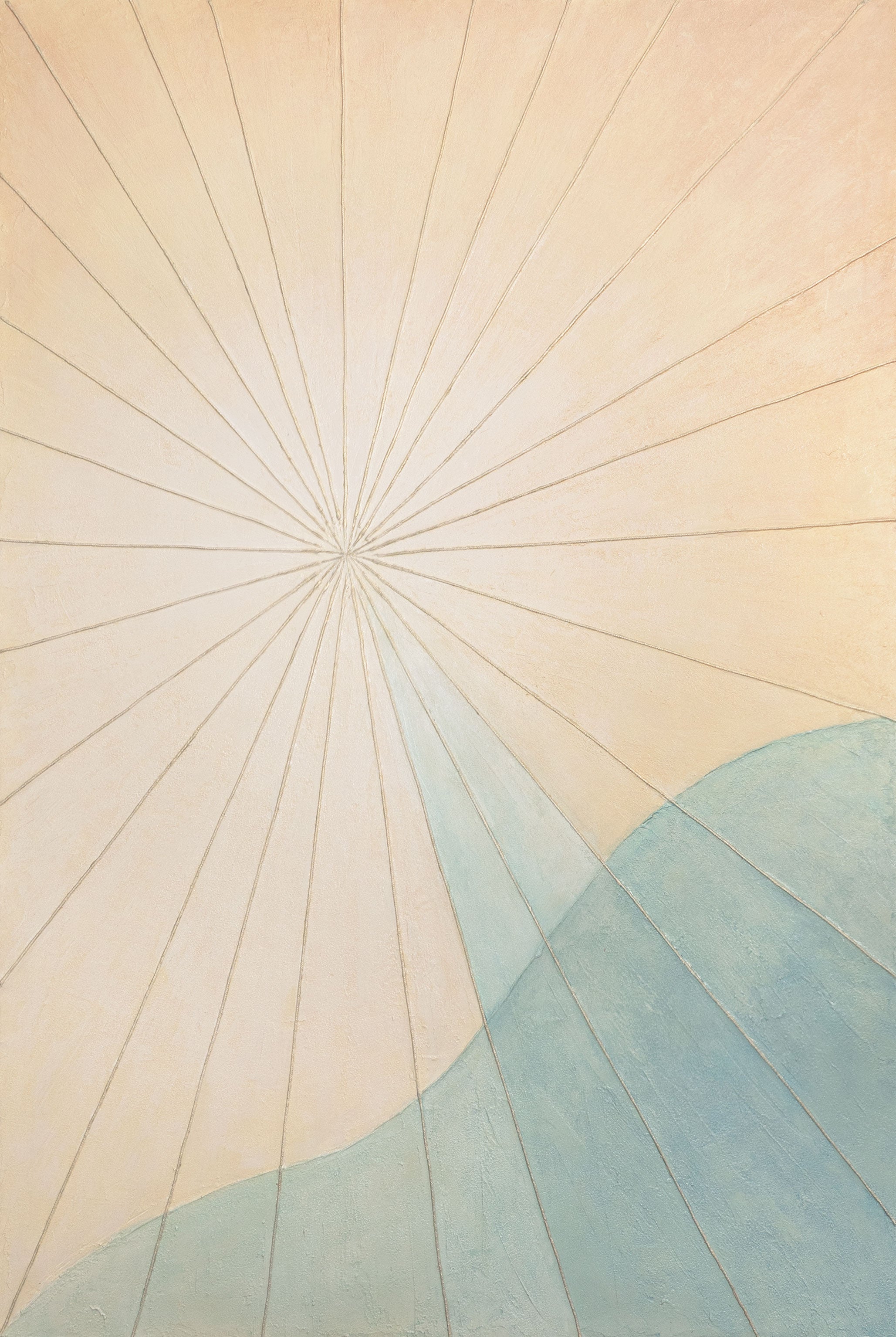 "Ochtendgloren boven de zee" straalt in zachte, lichtdoorlatende tinten – een spel van crème, lichtblauw en beige, dat het moment tussen nacht en dag vastlegt. De fijne structuur op het canvas geeft diepte en beweging, terwijl de delicate lijnen een meditatief ritme creëren.