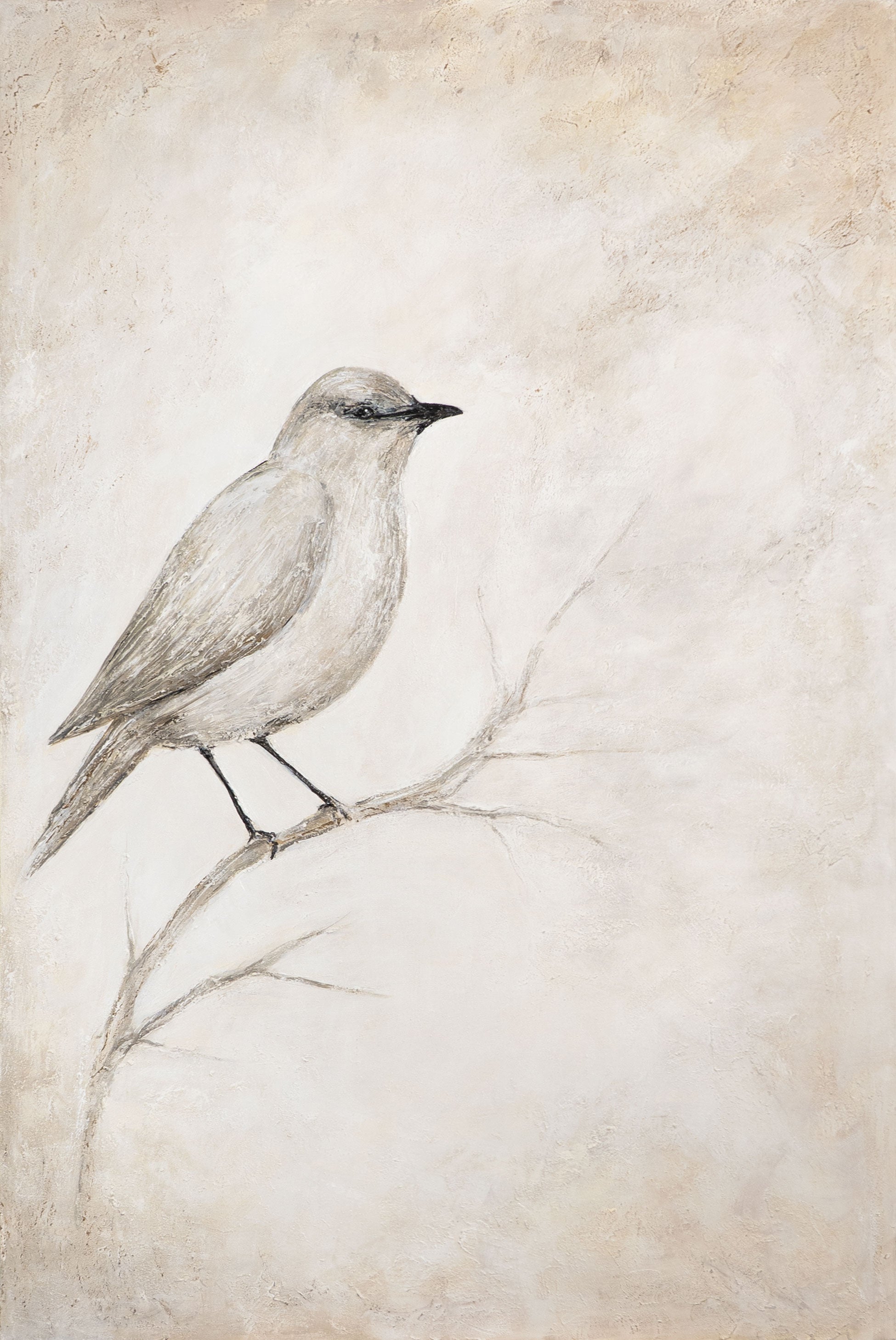 „Singende Pause“ zeigt einen zarten Moment der Stille. Ein einzelner Vogel sitzt auf einem Ast, umgeben von sanften Beigetönen und feiner Struktur. Die ruhige Komposition verleiht dem Motiv eine poetische Leichtigkeit, während die haptische Oberfläche Tiefe und Natürlichkeit ausstrahlt.