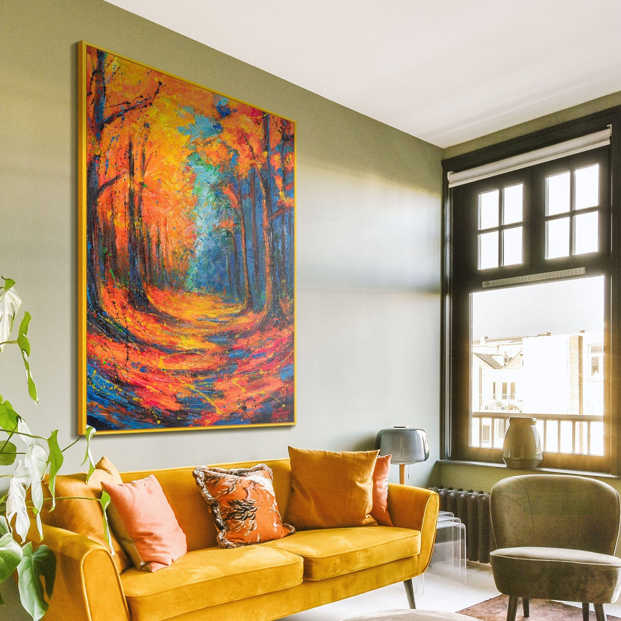 Handgeschilderd Leinwandbeeld "Gloeiende Paden in Herfstbos" – Structuur & Kleurrijk