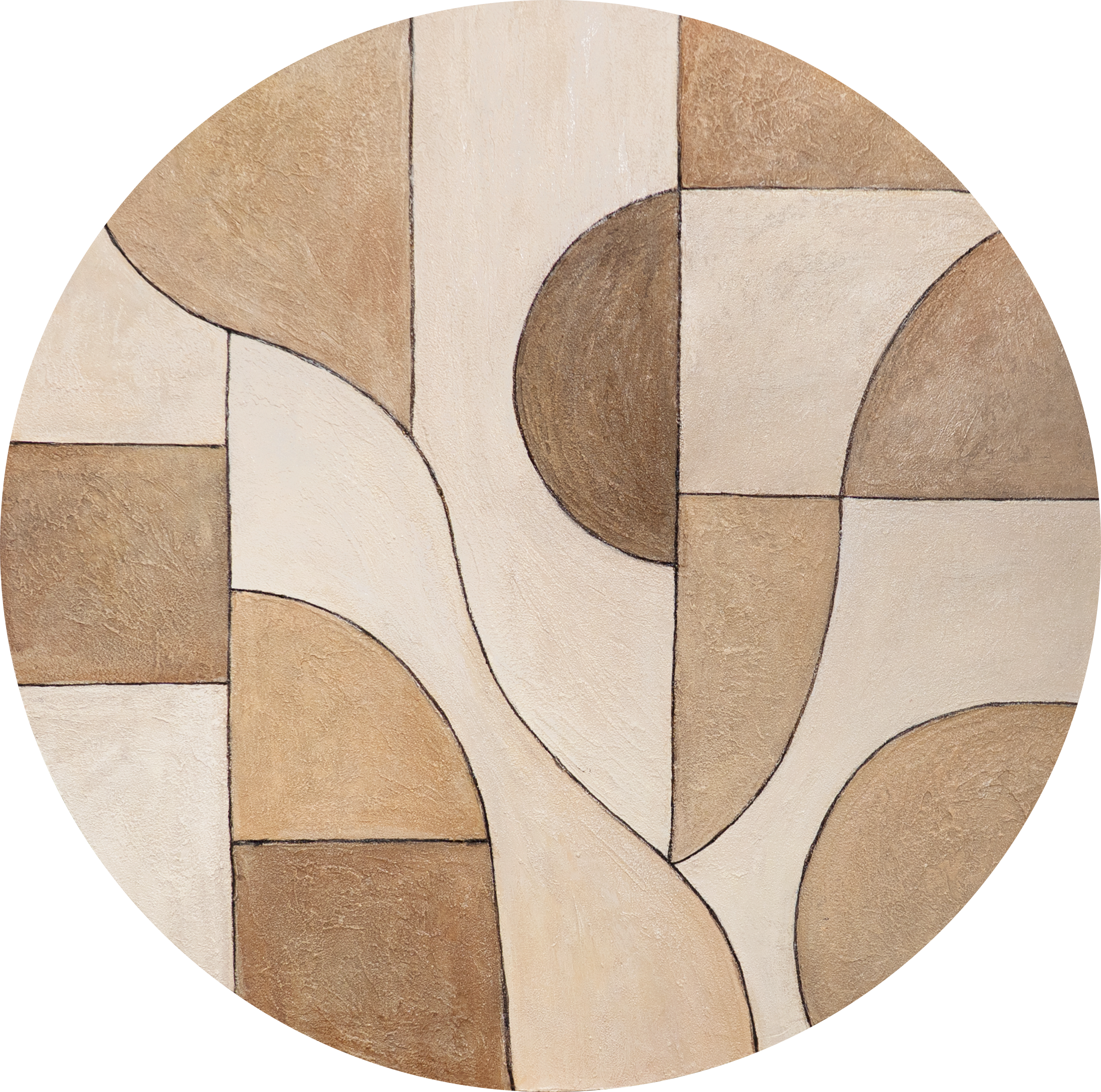„Ornamente der Zeit“ verkörpert den Rhythmus der Formen und die stille Bewegung der Jahre. Sanft geschwungene Linien treffen auf klare geometrische Flächen – ein Dialog zwischen Ordnung und Fluss. Die erdigen Beige- und Brauntöne verleihen der Komposition Wärme, Tiefe und natürliche Ruhe.