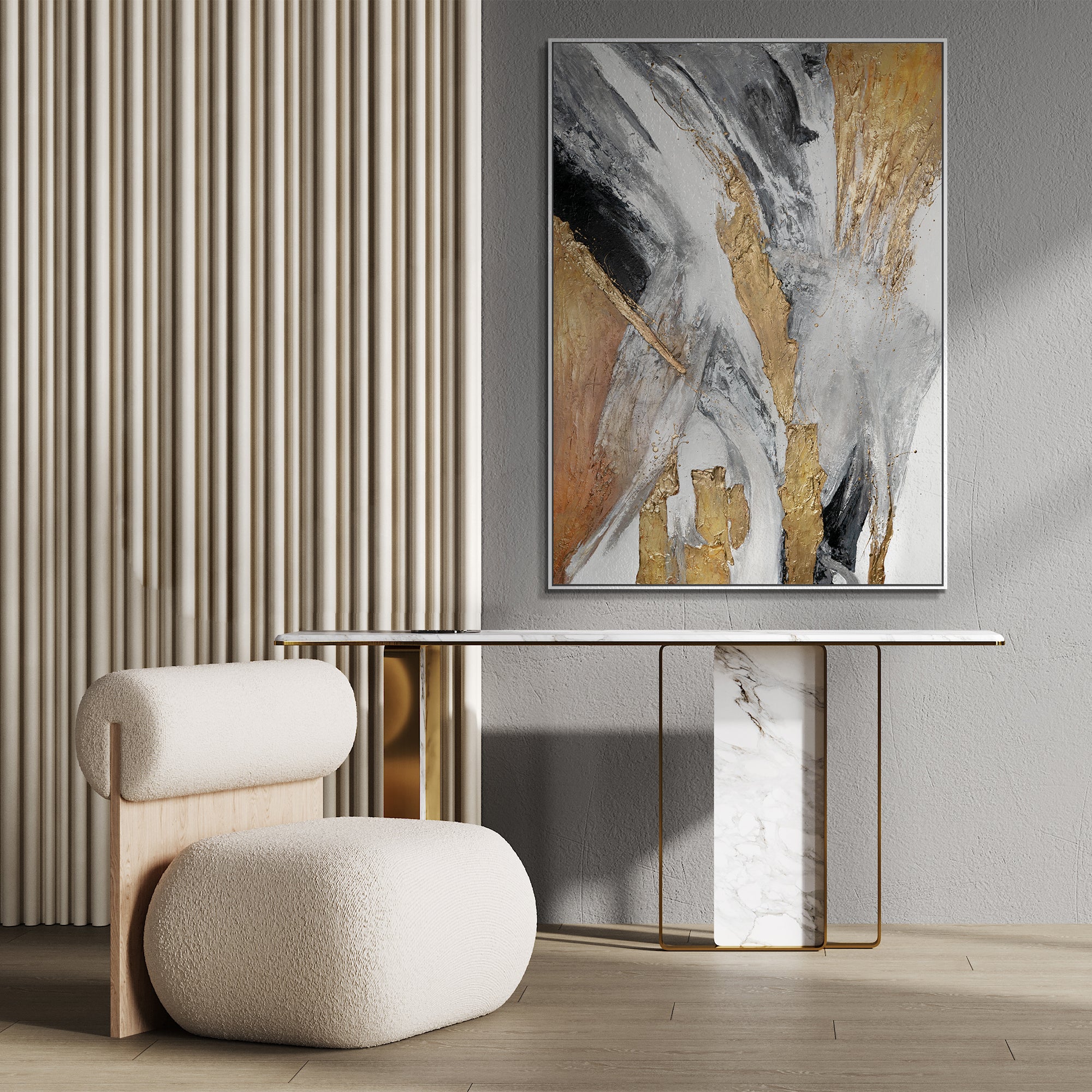 Verrijk uw huis of kantoor met dit elegante abstracte kunstwerk. De goud- en grijstinten zorgen voor een dynamische en moderne compositie. Het schilderij maakt indruk door de sterke contrasten en de expressieve penseelstreken. Het is 100% handbeschilderd en wordt geaccentueerd door een elegante lijst.