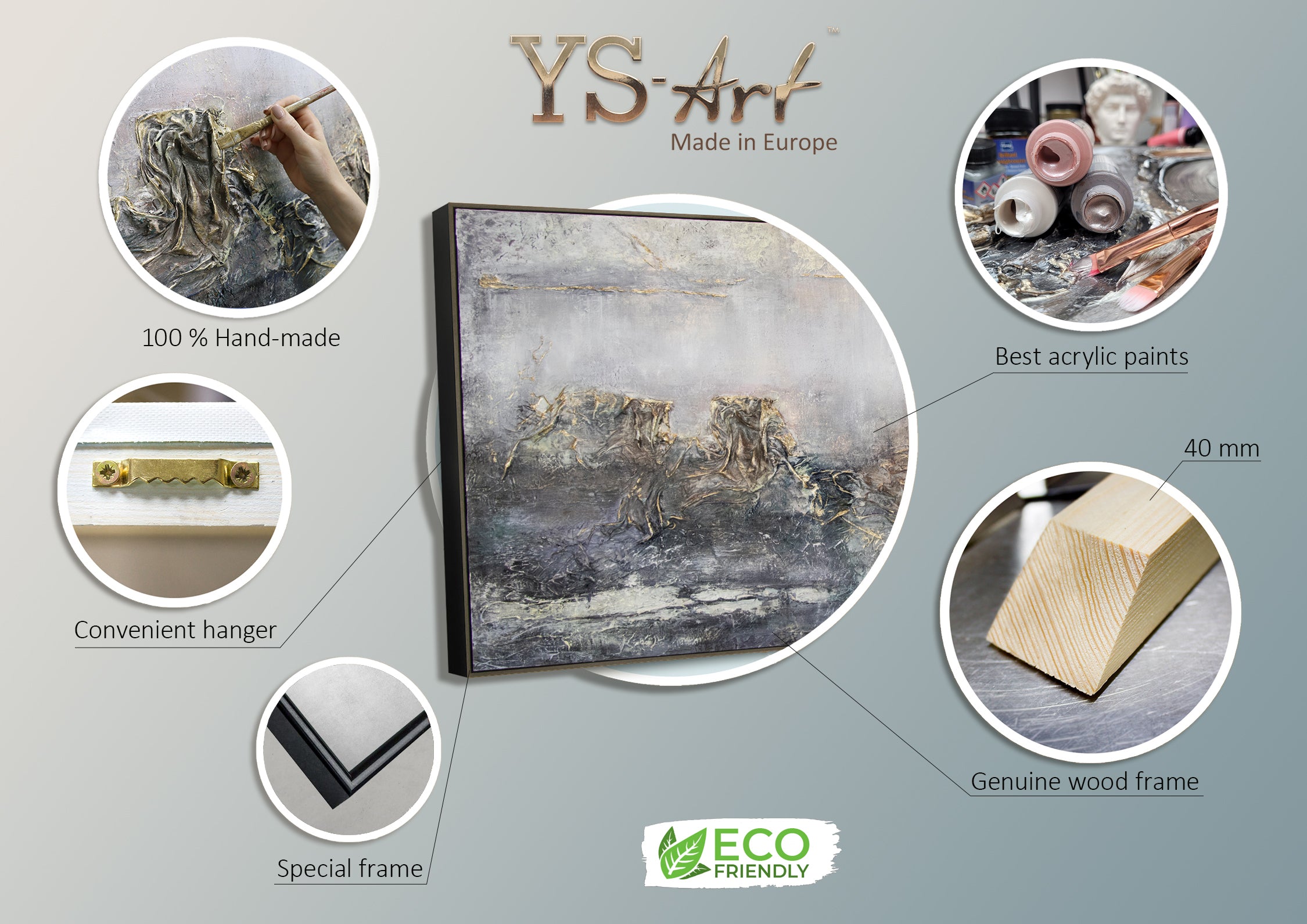 Een structuurschilderij met bladgoud in donkere kleuren vormt een aanvulling op uw interieur en past stijlvol en bondig in de sfeer van een studeerkamer, slaapkamer of woonkamer. Deze versie van het handgeschilderde schilderij is ook een leuk cadeau voor een vriend, zakenpartner of collega.