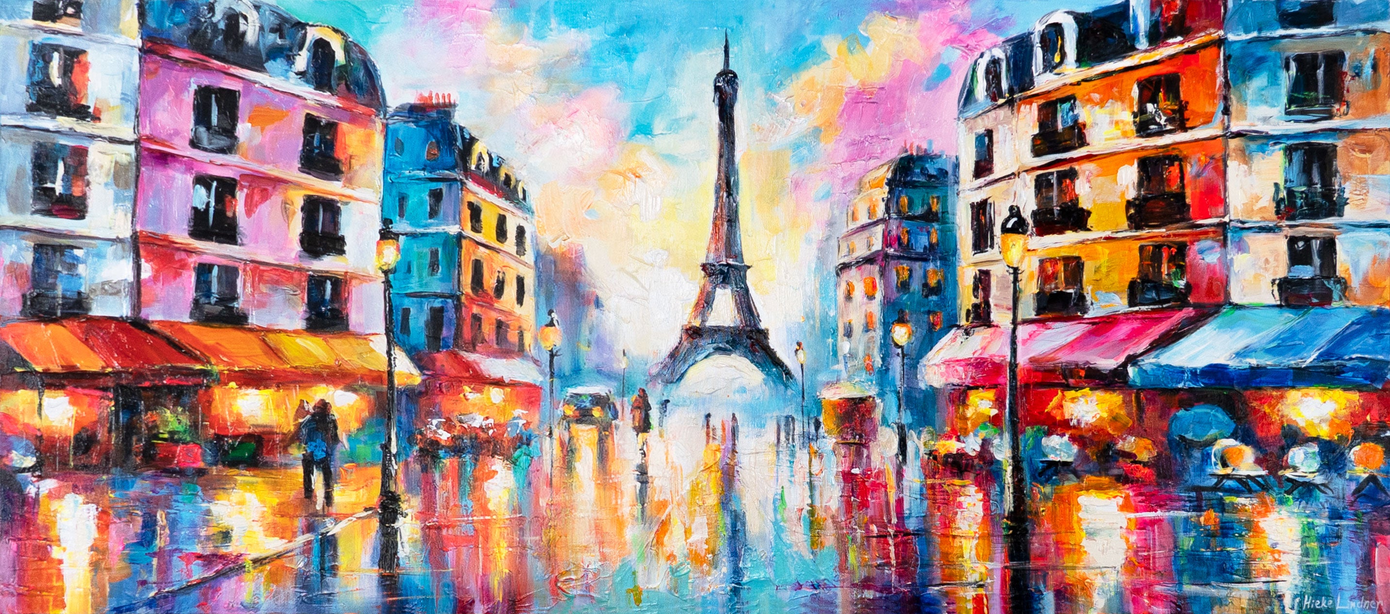 Het schilderij “Paris Lights” toont een impressionistisch stadsgezicht met de Eiffeltoren op de achtergrond. Felle kleuren, lichtreflecties en levendige penseelstreken geven het tafereel een bijzondere sfeer die grenst aan romantiek en de flair van een grote stad.