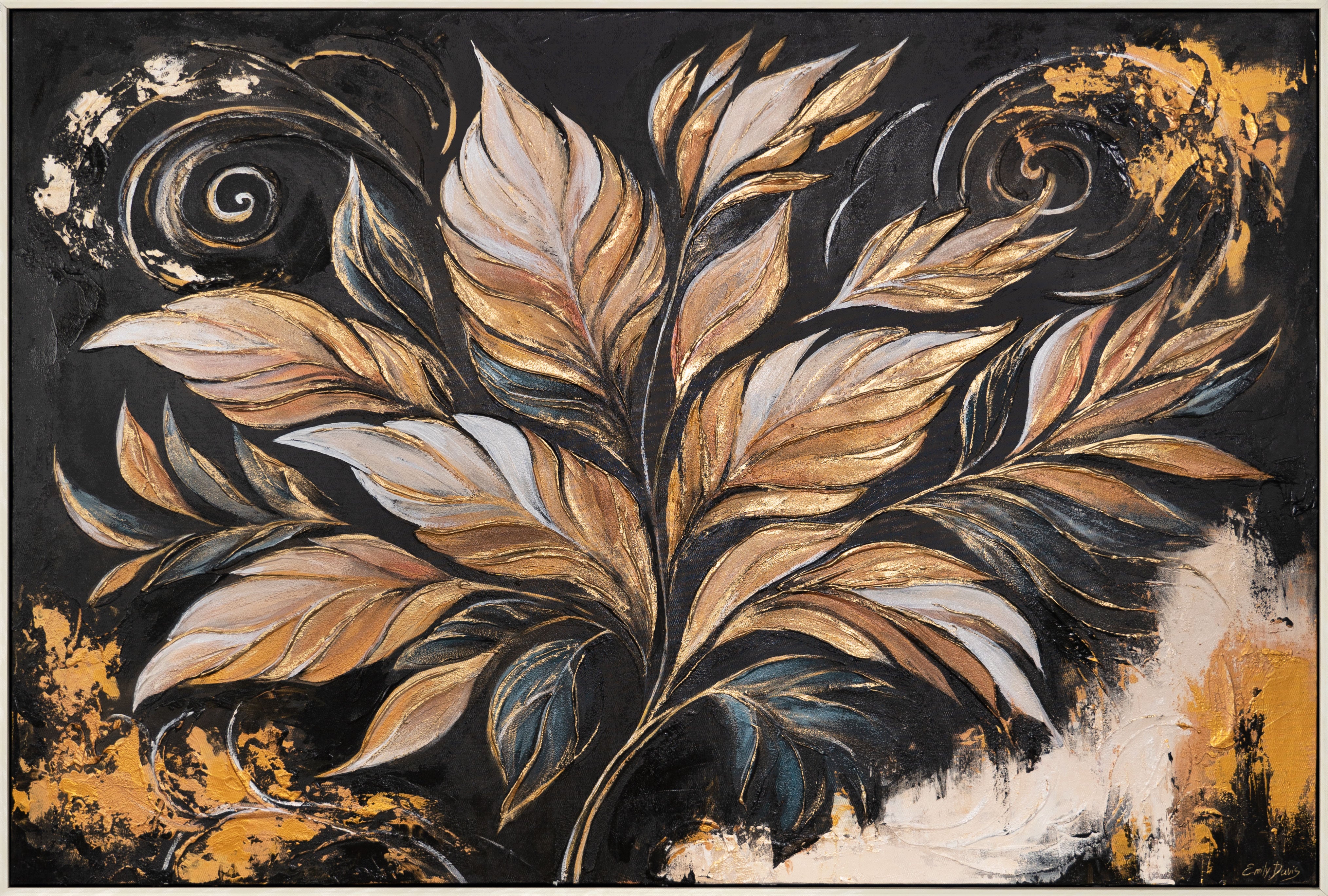 Het handgeschilderde canvas “Gouden Bladeren” betovert met een moderne, abstracte compositie van glanzende gouden bladeren op een diepzwarte achtergrond. De kunstzinnige structuur van het oppervlak geeft het werk een levendige, driedimensionale diepte, waardoor elke ruimte een luxe en stijlvolle uitstraling krijgt.
