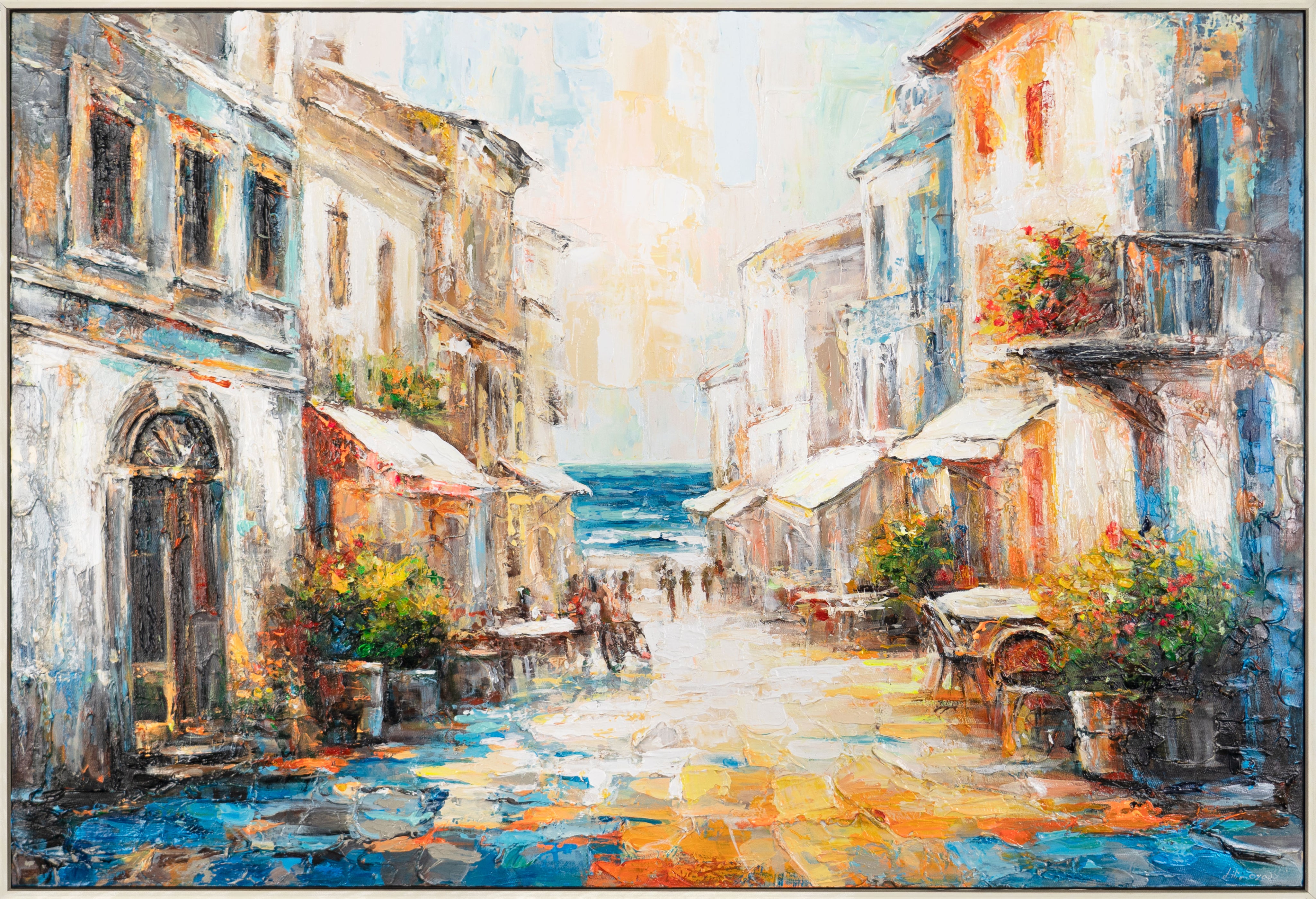 Het handgeschilderde canvas “Warme Bries” vangt de levendige sfeer van een zonnige kustplaats met een harmonieuze mix van warme en koele tinten. De krachtige penseelstreken en de fijne textuur van het oppervlak geven diepte en levendigheid aan het kunstwerk, waardoor elke ruimte wordt verrijkt. Zachte geel- en blauwtinten vermengen zich met helder oranje en aardetinten voor een inspirerende en rustgevende ambiance.
