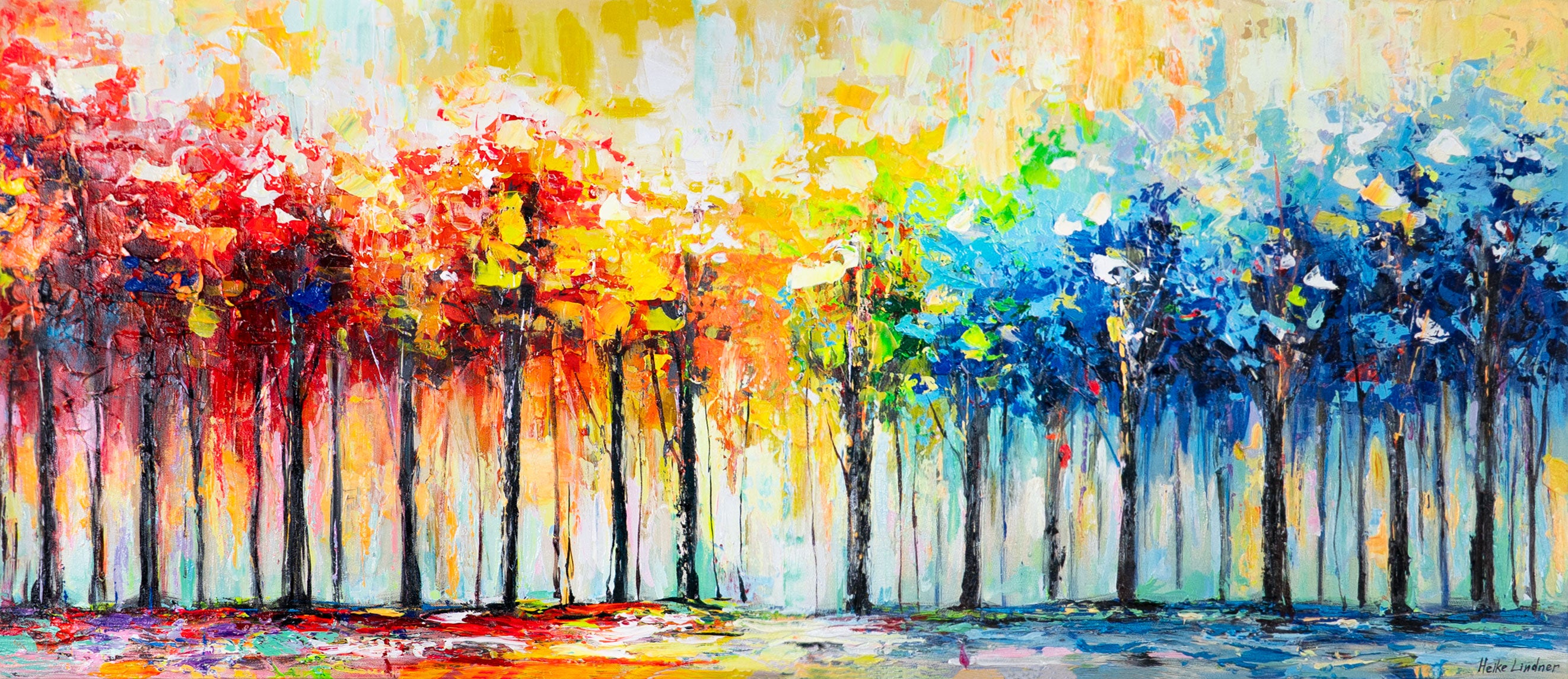Het kunstwerk “Colors of Nature” toont een abstracte, kleurrijke rij bomen in intense tinten blauw, groen, geel en rood. Door de gestructureerde acryltechniek en het vloeiende kleurverloop ontstaat een harmonieus en levendig totaalbeeld.