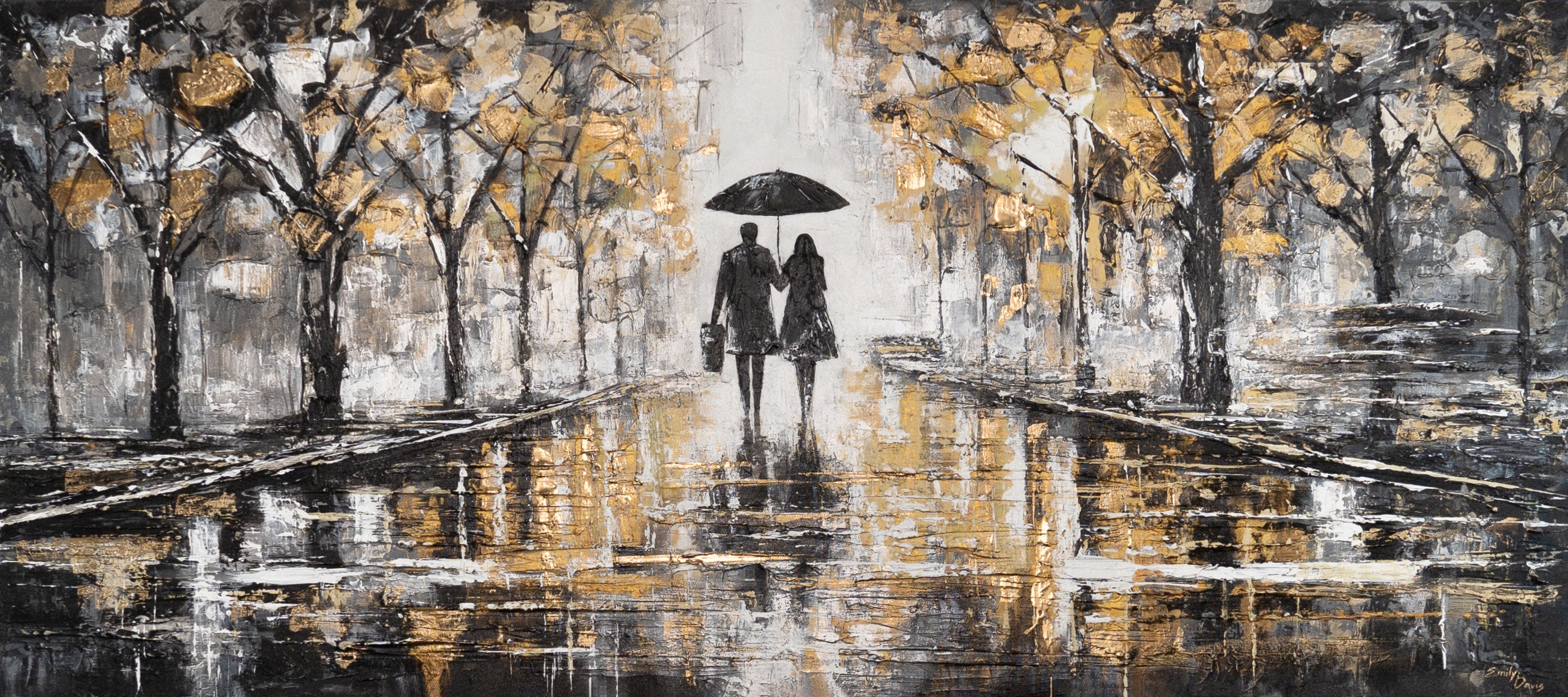 Dit met de hand geschilderde acrylschilderij toont een stel dat samen door een goudkleurig park loopt in de regen – een symbool van verbondenheid, vertrouwen en harmonie. De reflecterende plassen en het samenspel van zwart, grijs en goud geven het beeld diepte en emotie.