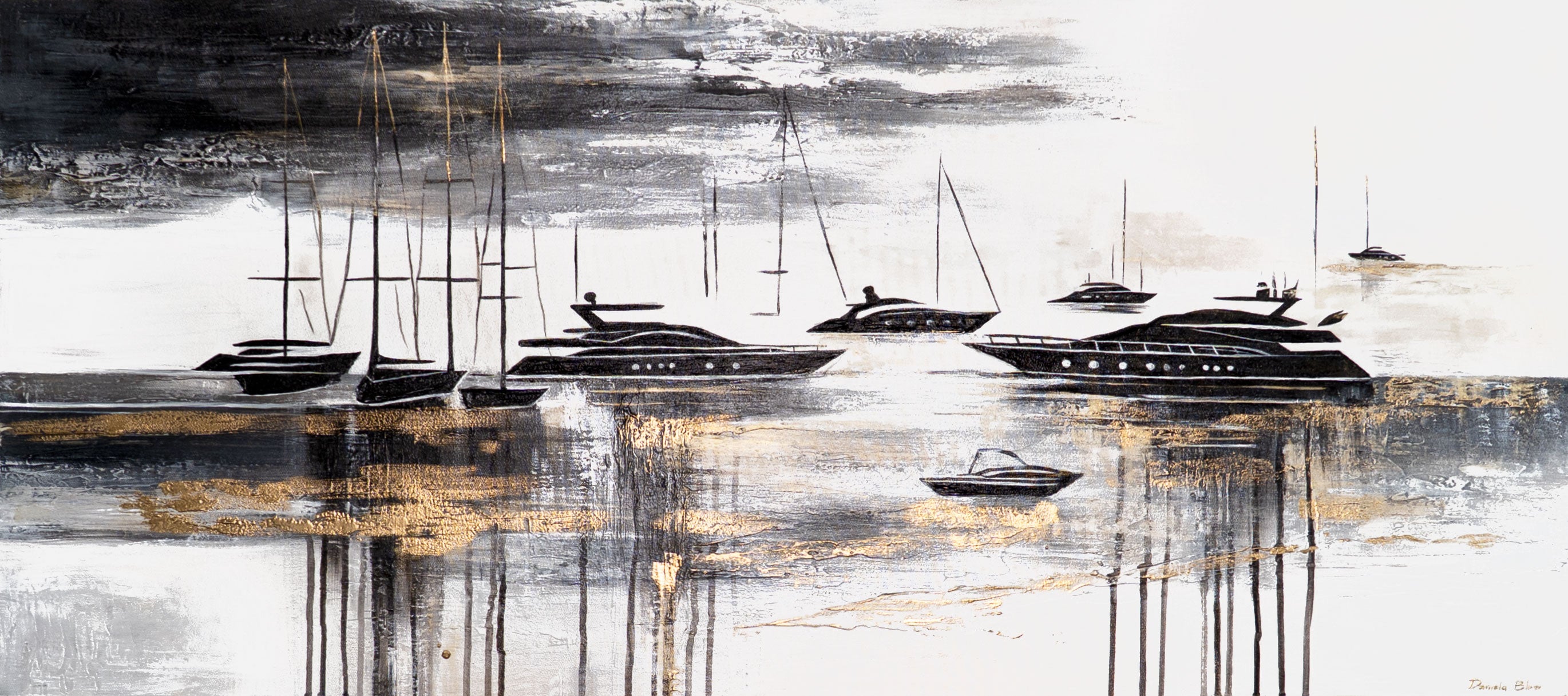 “Yachts” is een stijlvol, met de hand geschilderd acrylschilderij op canvas dat een rustig maritiem tafereel afbeeldt met elegante jachten in zwart, wit en goud. De gestructureerde schilderstijl geeft het beeld diepte en glans, terwijl het monochrome contrast met gouden accenten een moderne, luxueuze sfeer creëert.