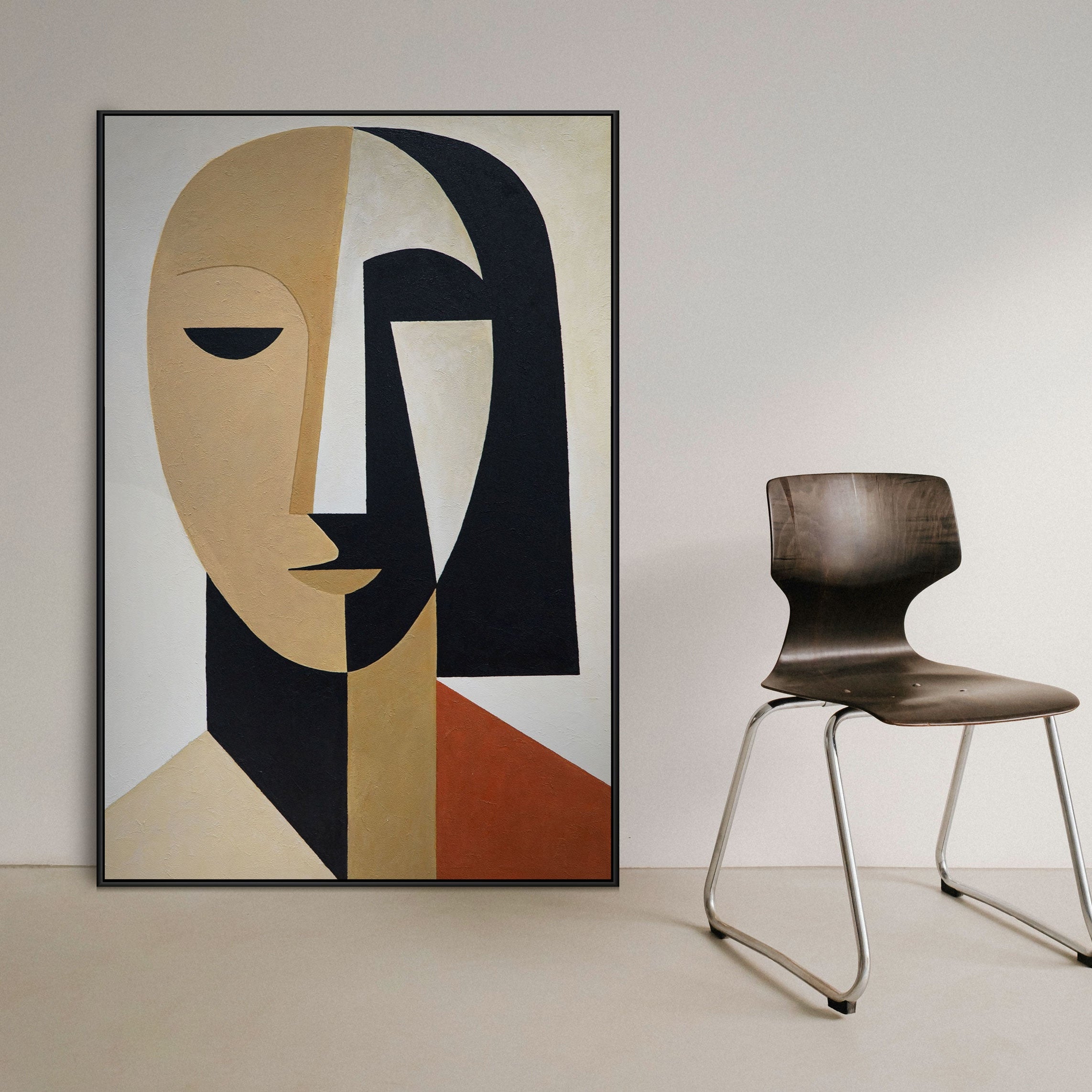 "Geometry of the Face" is een eerbetoon aan de helderheid van vorm en de expressiviteit van het kubisme. Het minimalistische gezichtsmotief verenigt geometrische elementen in beige, zwart en warm terracotta. Elk facet straalt balans en emotie uit, de stille harmonie tussen abstractie en menselijkheid.