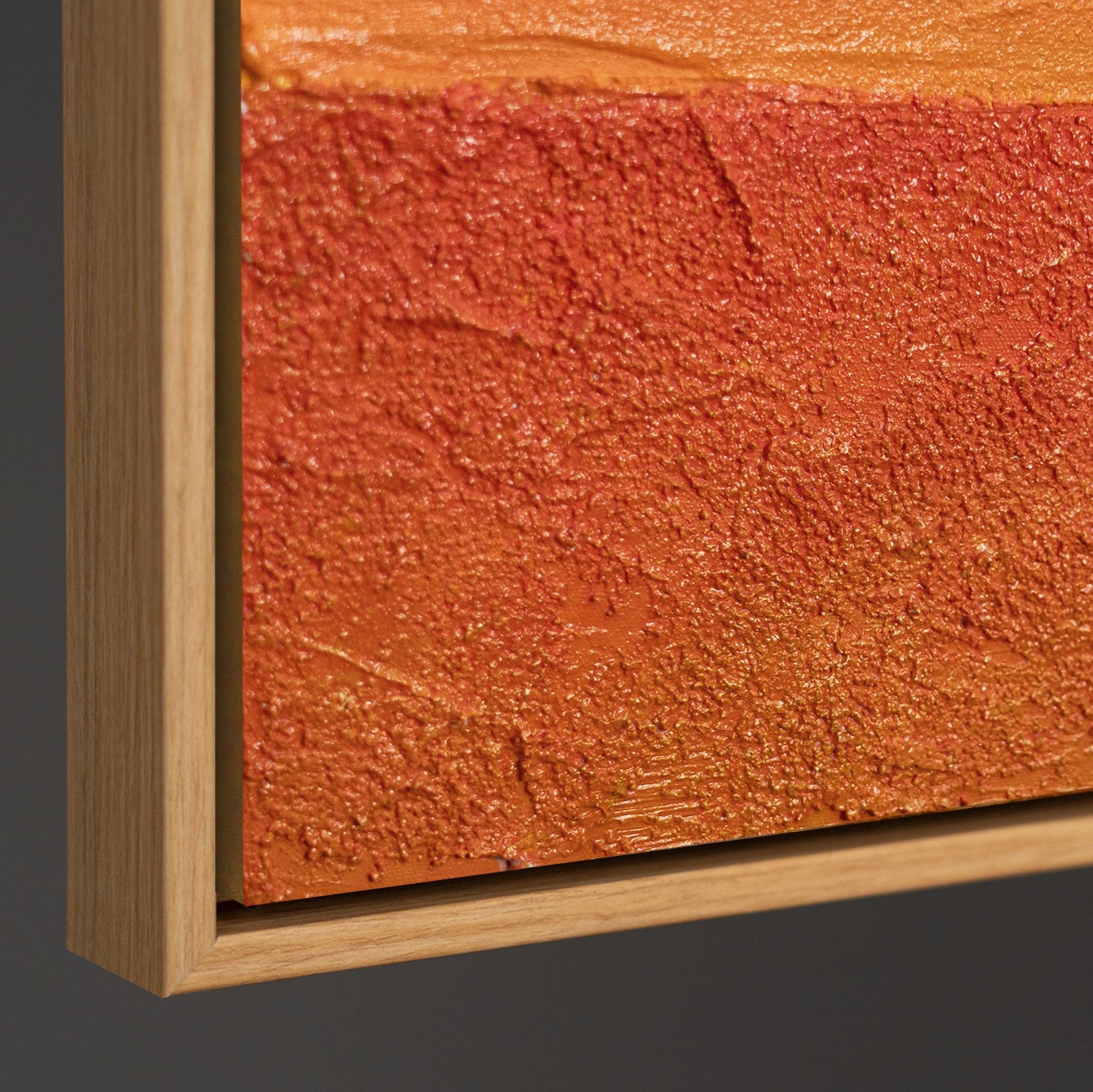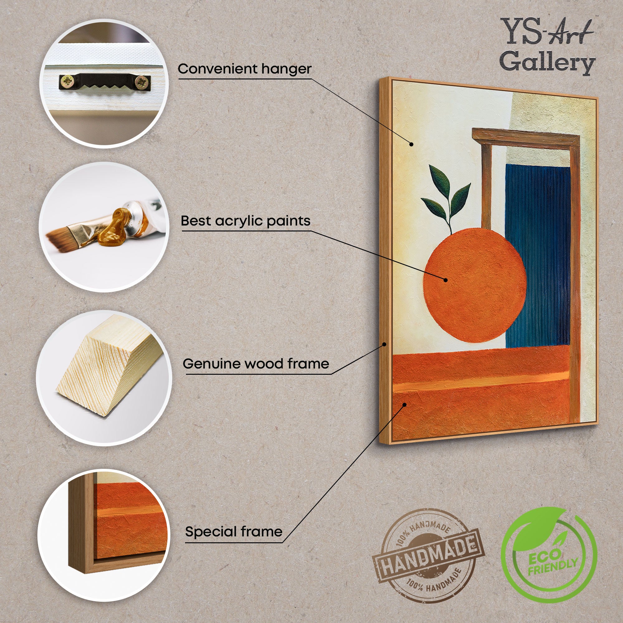 "Fertile Balance" verenigt geometrie en natuur in een harmonieuze compositie. De levendige oranje bol staat voor energie en leven, terwijl strakke lijnen en natuurlijke texturen stabiliteit en rust creëren. Accenten van diepblauw en warm oker geven het kunstwerk diepte en expressie.