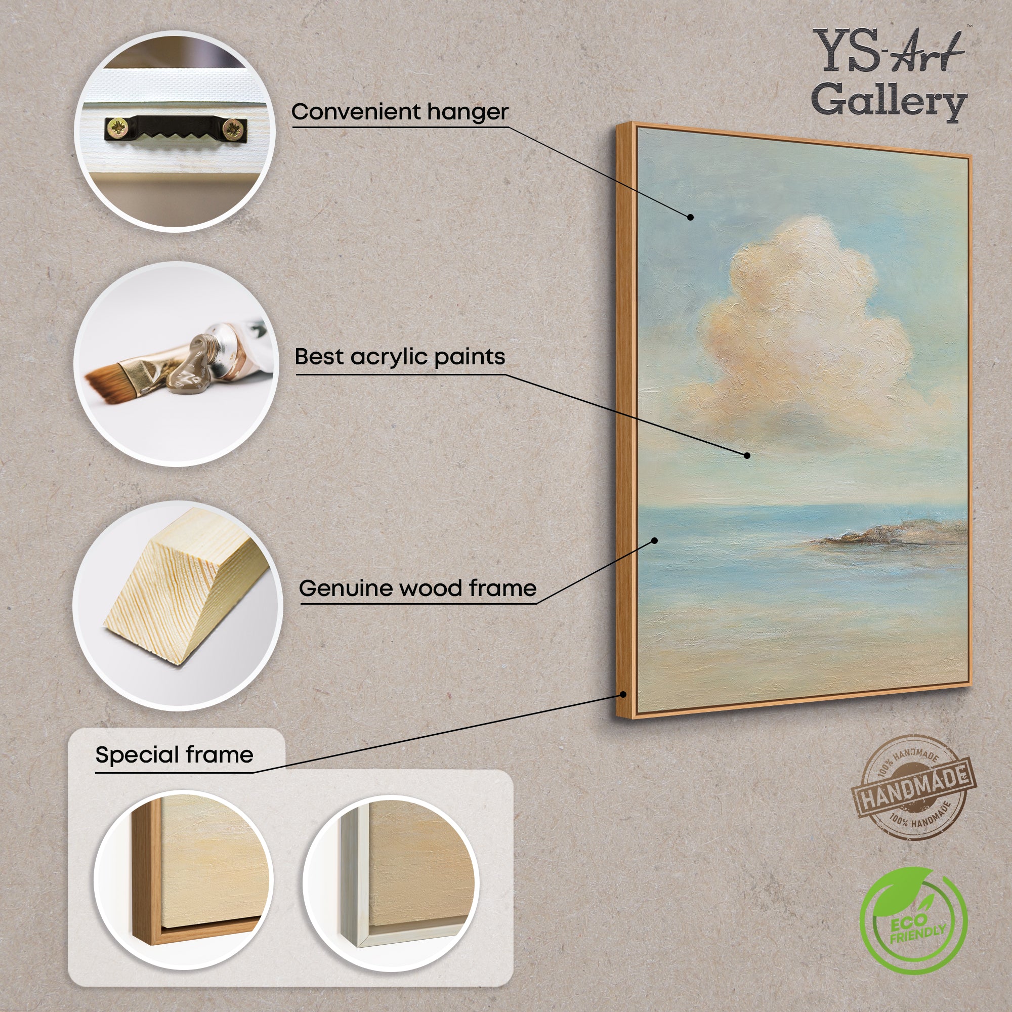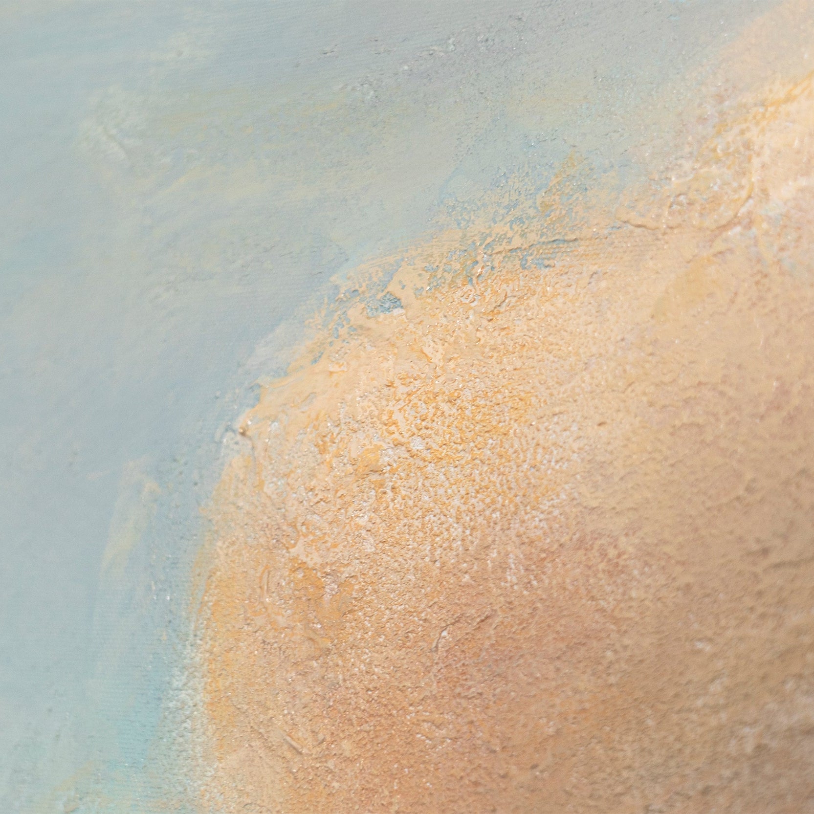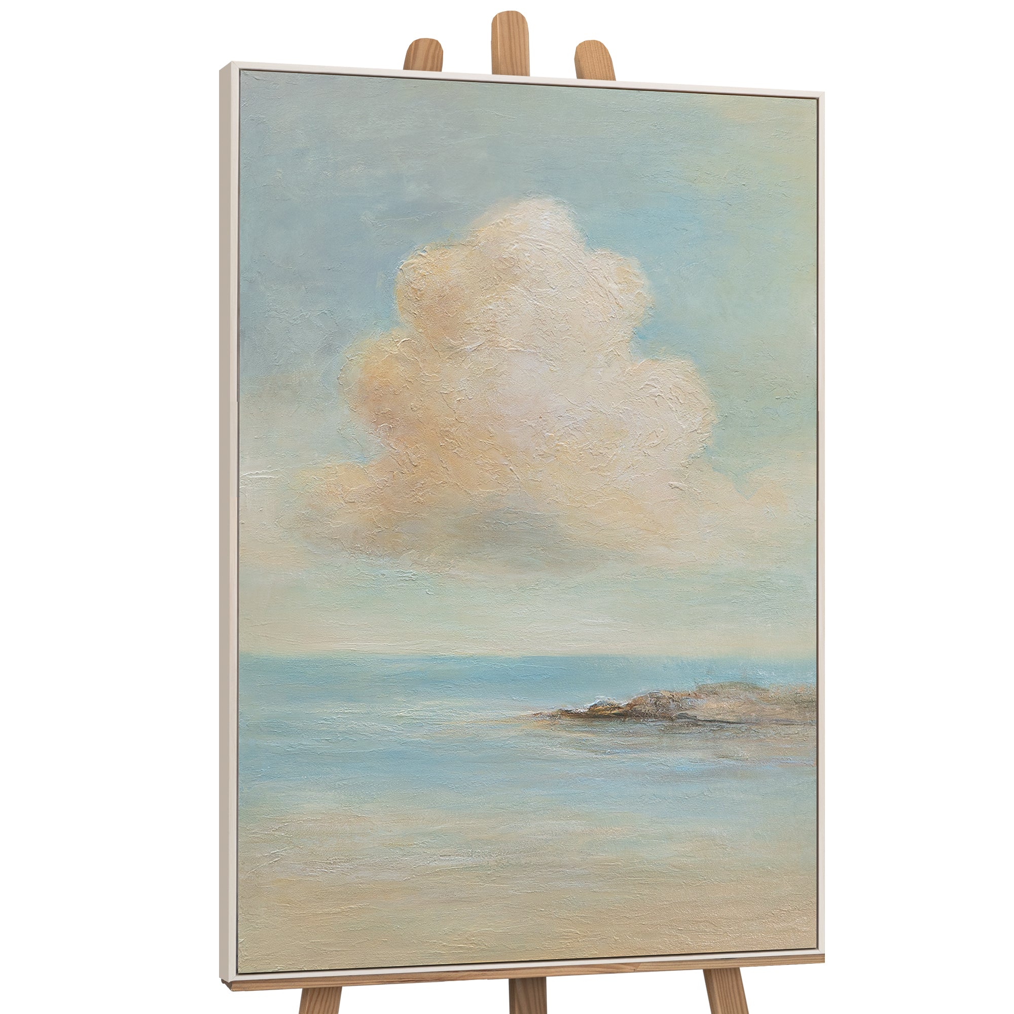 "Lightness of Being" belichaamt een moment van volmaakte rust. Zachte wolken zweven boven het delicate blauw van de zee, terwijl subtiele texturen en pasteltinten beige en crème het licht zachtjes reflecteren. Het handbeschilderde oppervlak brengt het beeld tot leven en vult de kamer met vredige energie.