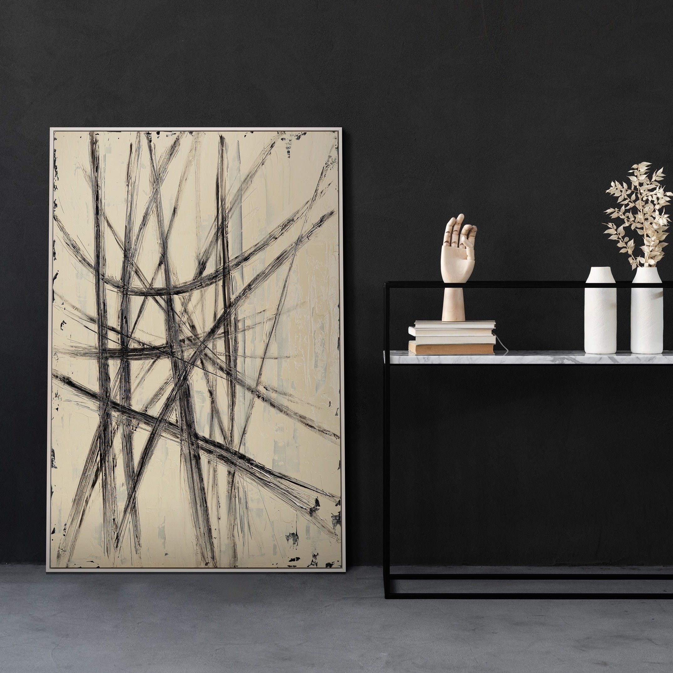 "Parallels and Intersections" verenigt beweging en structuur in één expressie. Zwarte lijnen doorkruisen het zachtbeige oppervlak en creëren ritme, energie en visuele diepte. Het samenspel van contrast en textuur brengt zowel spanning als balans over – een beeld dat de ruimte verlevendigt en tegelijkertijd ordent.