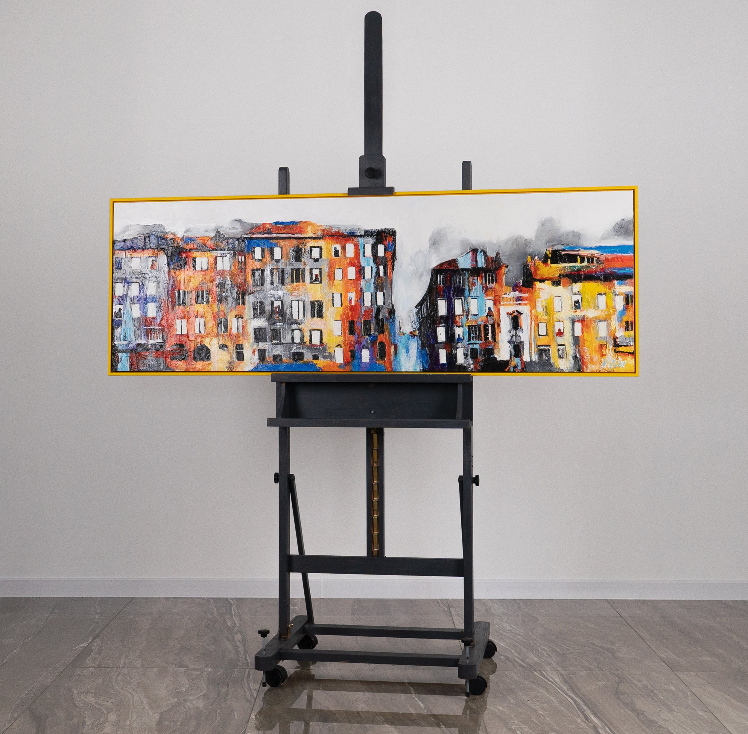 - Geschilderd met acryl- en fluorescerende verf, die milieuvriendelijk zijn. Wij spannen het doek op een spieraam van natuurlijk hout. Omdat het schilderij jarenlang bewaard moet blijven, wordt het oppervlak bedekt met een acrylvernis op waterbasis