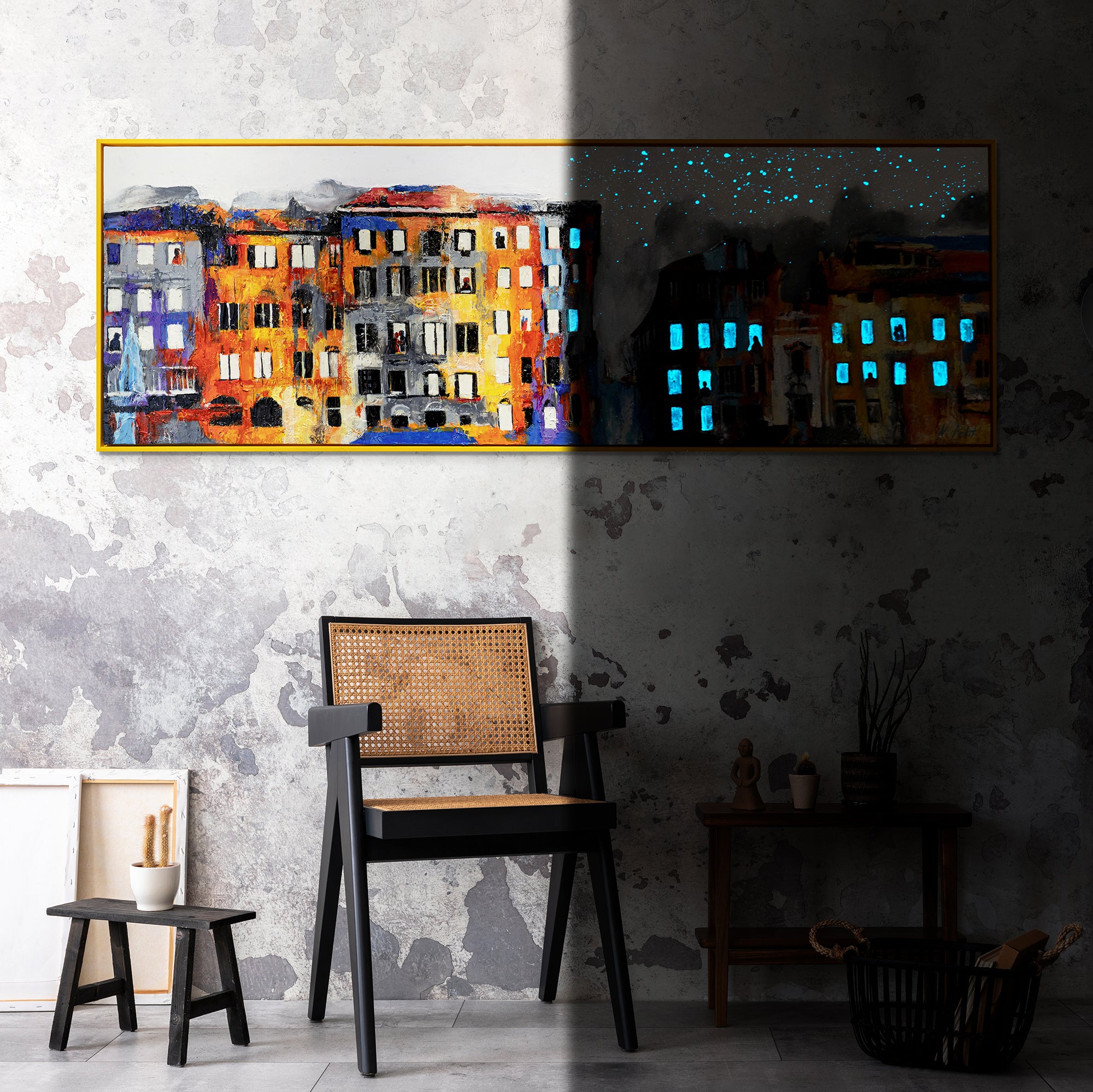 - Overdag is dit een textuurmotief met een aangenaam kleurenschema, en 's nachts ontstaat er een zacht, aangenaam lichteffect, wat een uniek comfort aan uw kamer toevoegt. U krijgt dus niet alleen een schilderij, maar ook een sfeervolle, kleurrijke nachtverlichting voor uw interieur.