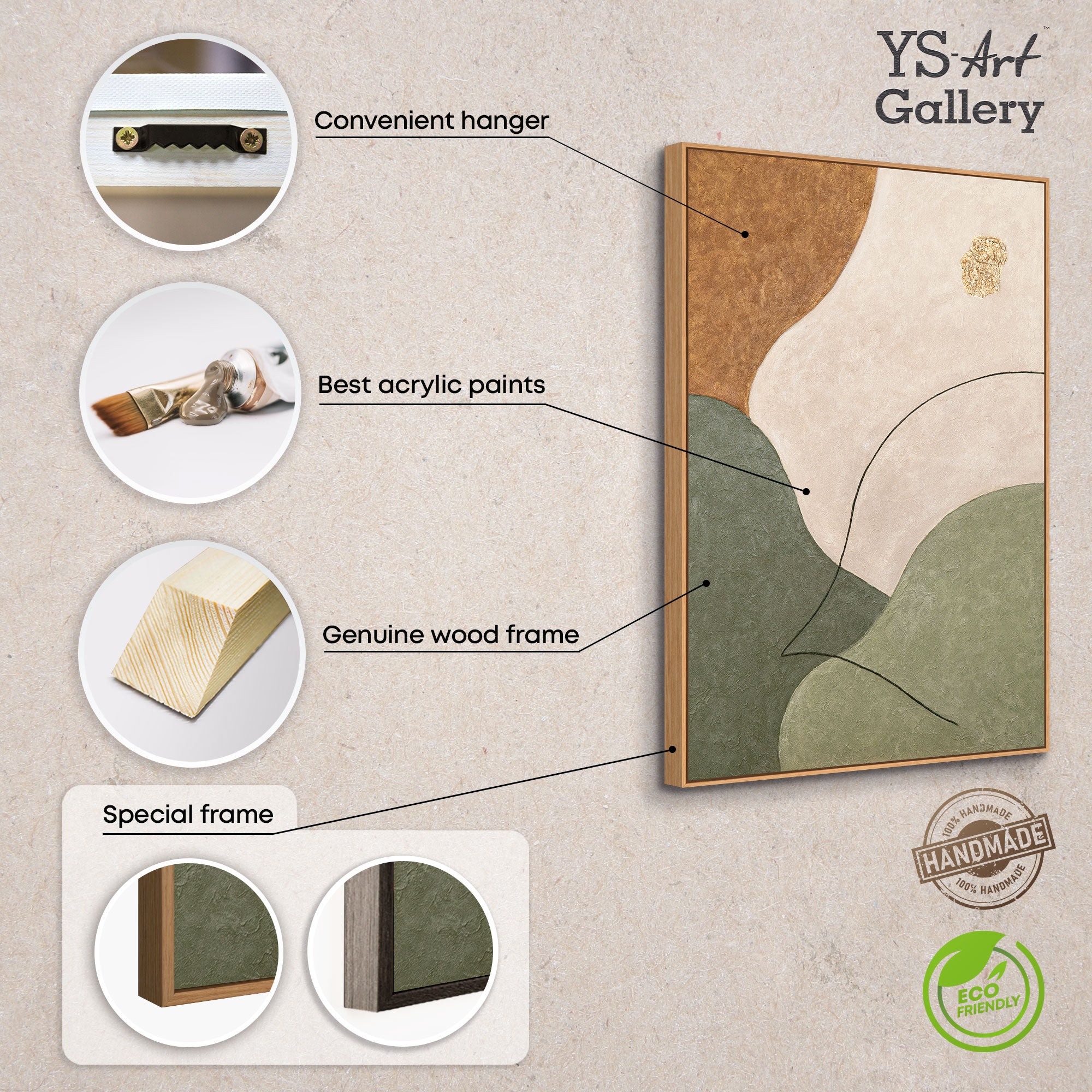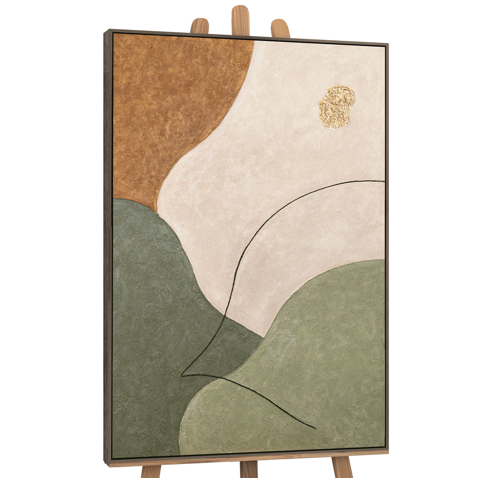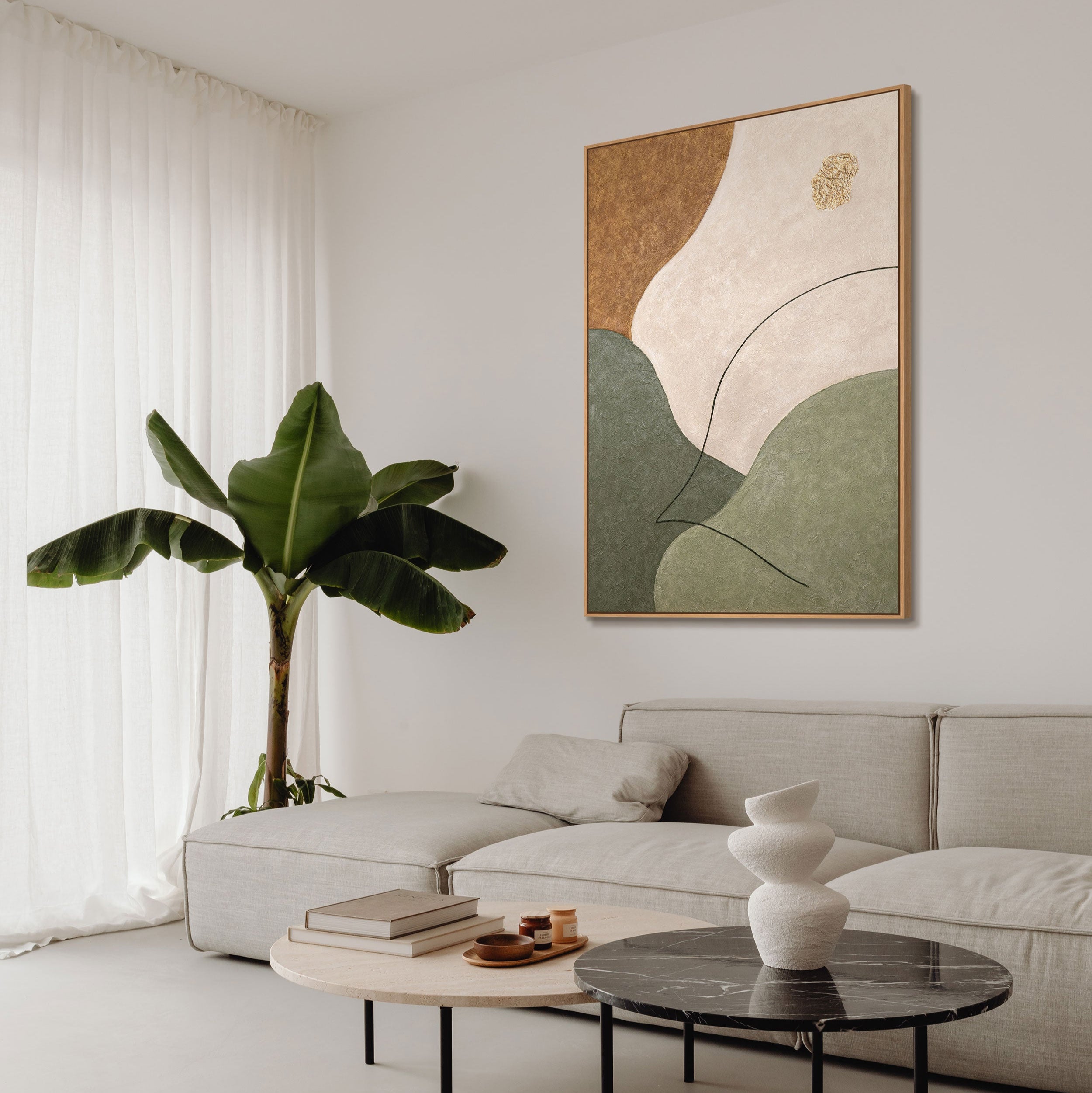 Breng elegantie en rust in uw huis met dit handgemaakte abstracte wandbeeld. De harmonieuze combinatie van warm bruin, zacht beige, kalmerend groen en een gouden accent maakt dit schilderij tot een echte blikvanger.