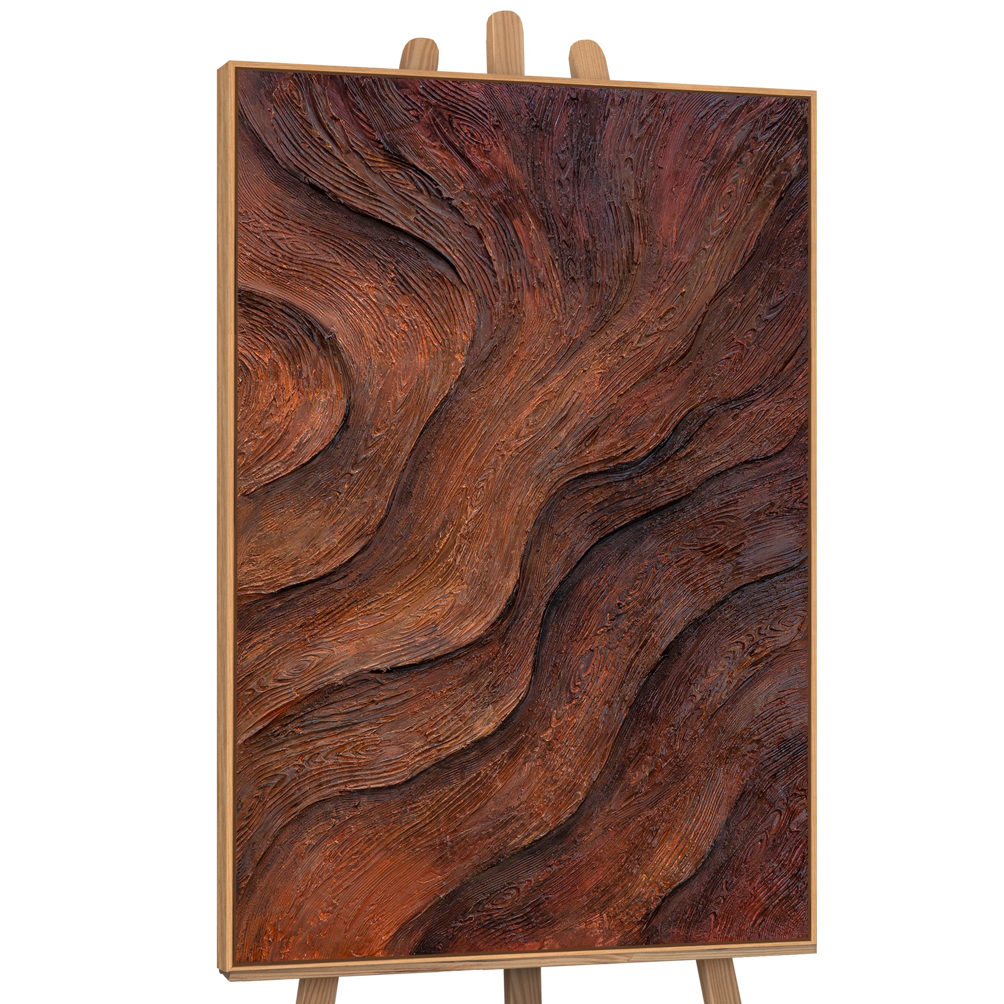 „Atem des Baumes“ ist ein Dialog zwischen Material und Bewegung. In tiefen Braun- und Kupfertönen entfalten sich Wellen, die an Jahresringe, Wurzeln und die pulsierende Lebenskraft des Holzes erinnern. Die strukturierte Oberfläche lässt das Licht tanzen, während jedes Relief den natürlichen Rhythmus der Erde spürbar macht. Es ist ein Werk, das Stille und Kraft zugleich ausstrahlt.