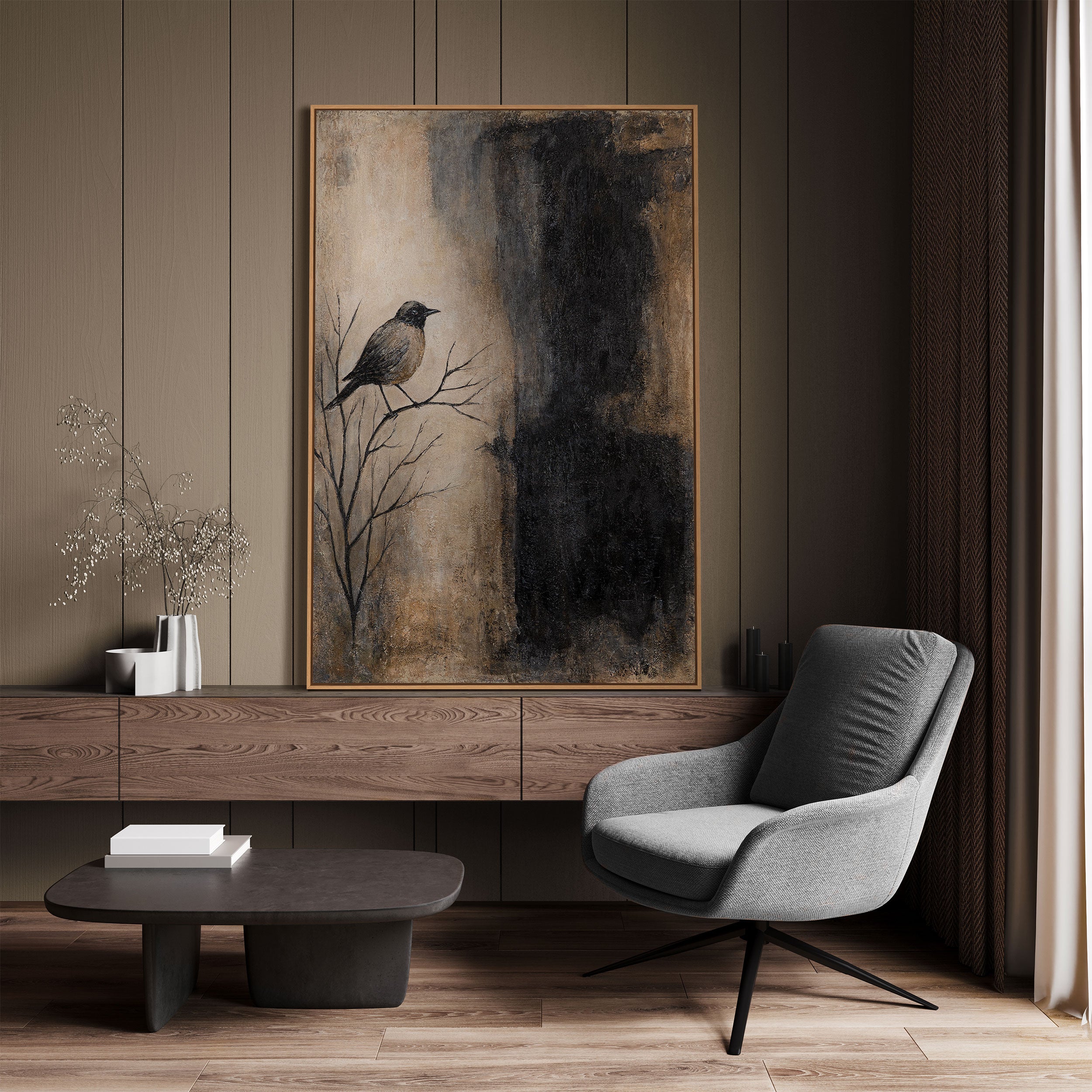 „Ast und Schatten“ ist ein handgemaltes Acrylgemälde, das durch sein ausdrucksstarkes Naturmotiv besticht. Ein einzelner Vogel sitzt auf kahlen Ästen, eingebettet in eine kontrastreiche Komposition aus warmen Beigetönen, erdigen Braunnuancen und tiefem Schwarz. Die strukturierte Oberfläche verleiht dem Bild Tiefe und eine lebendige Haptik, die den Blick fesselt.