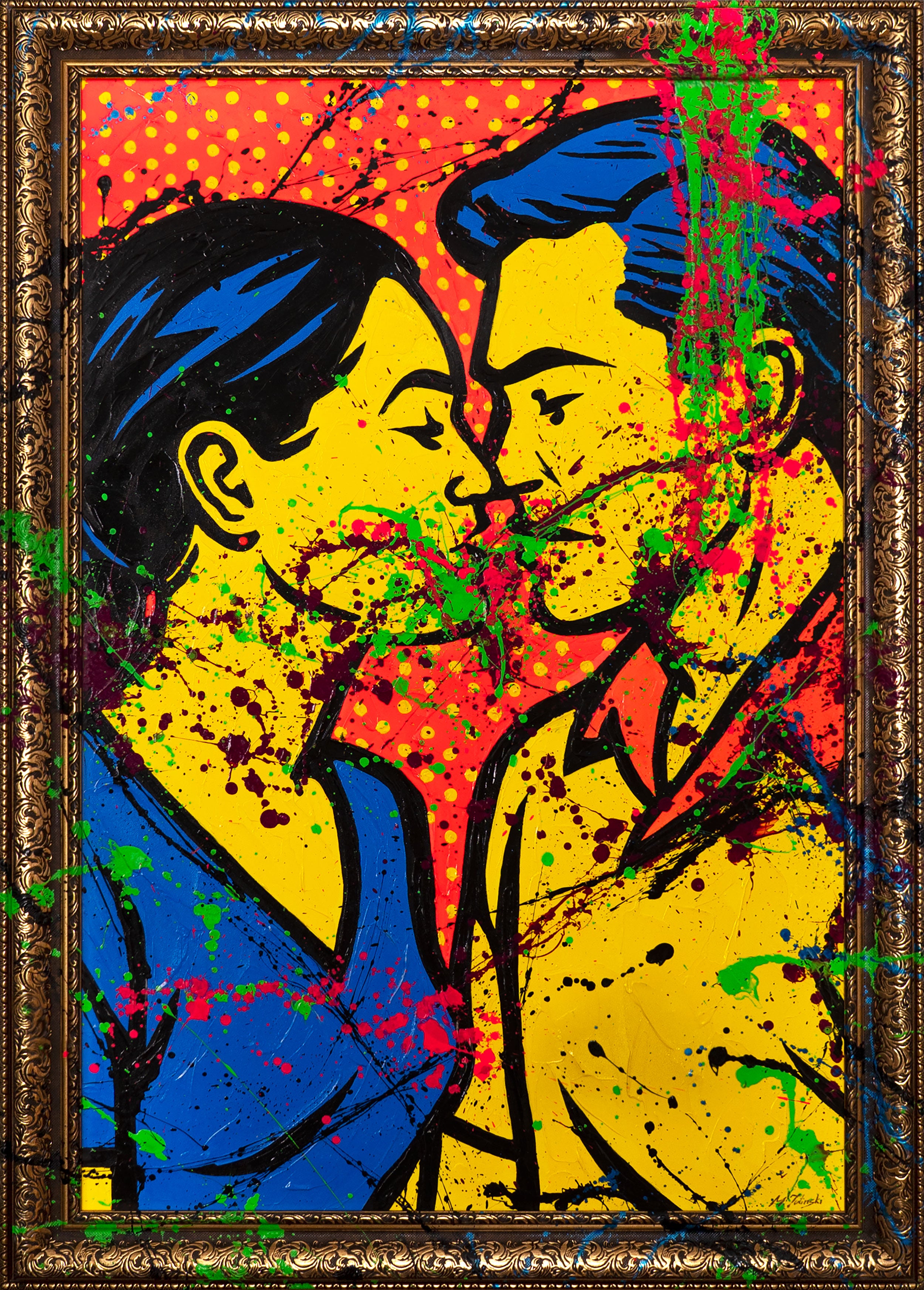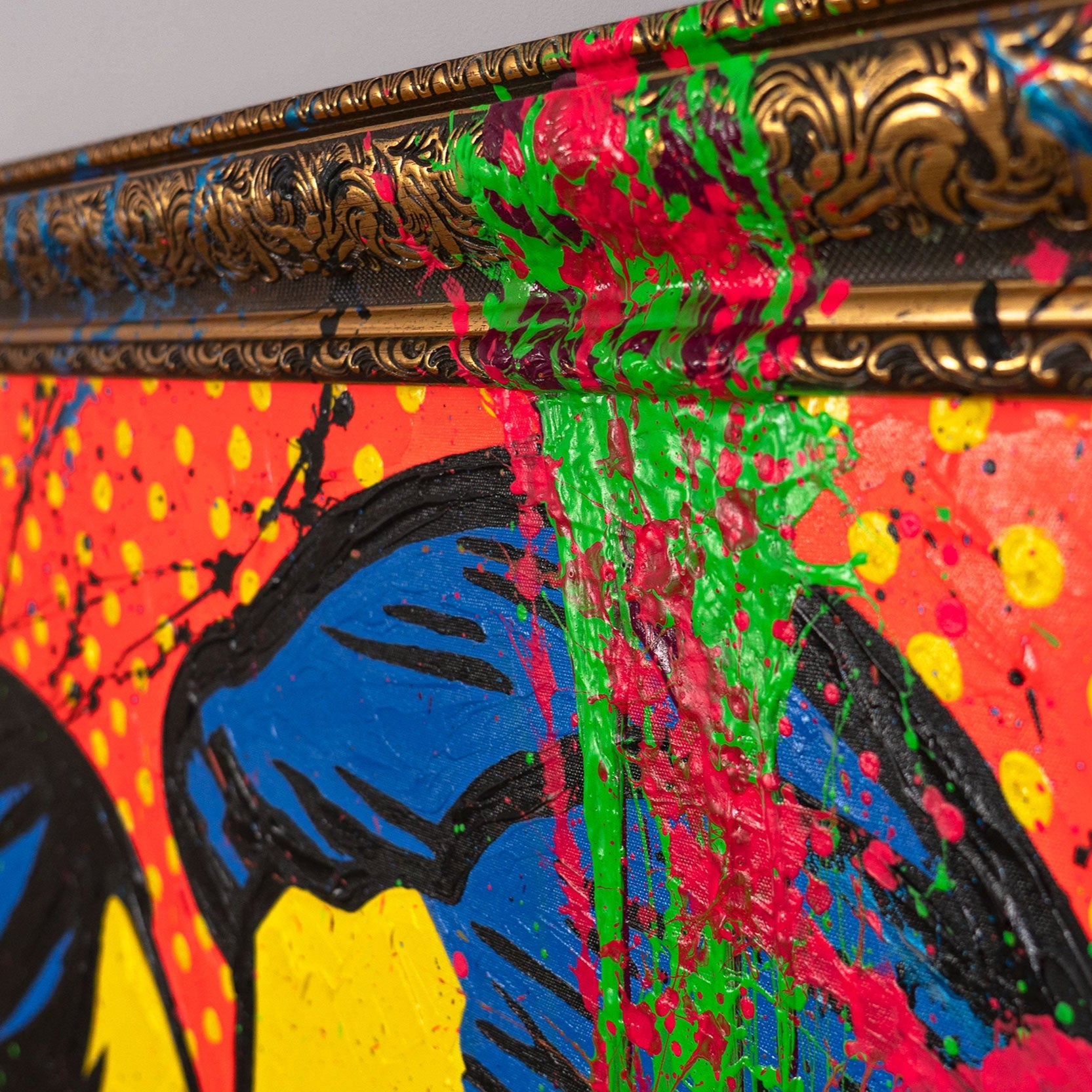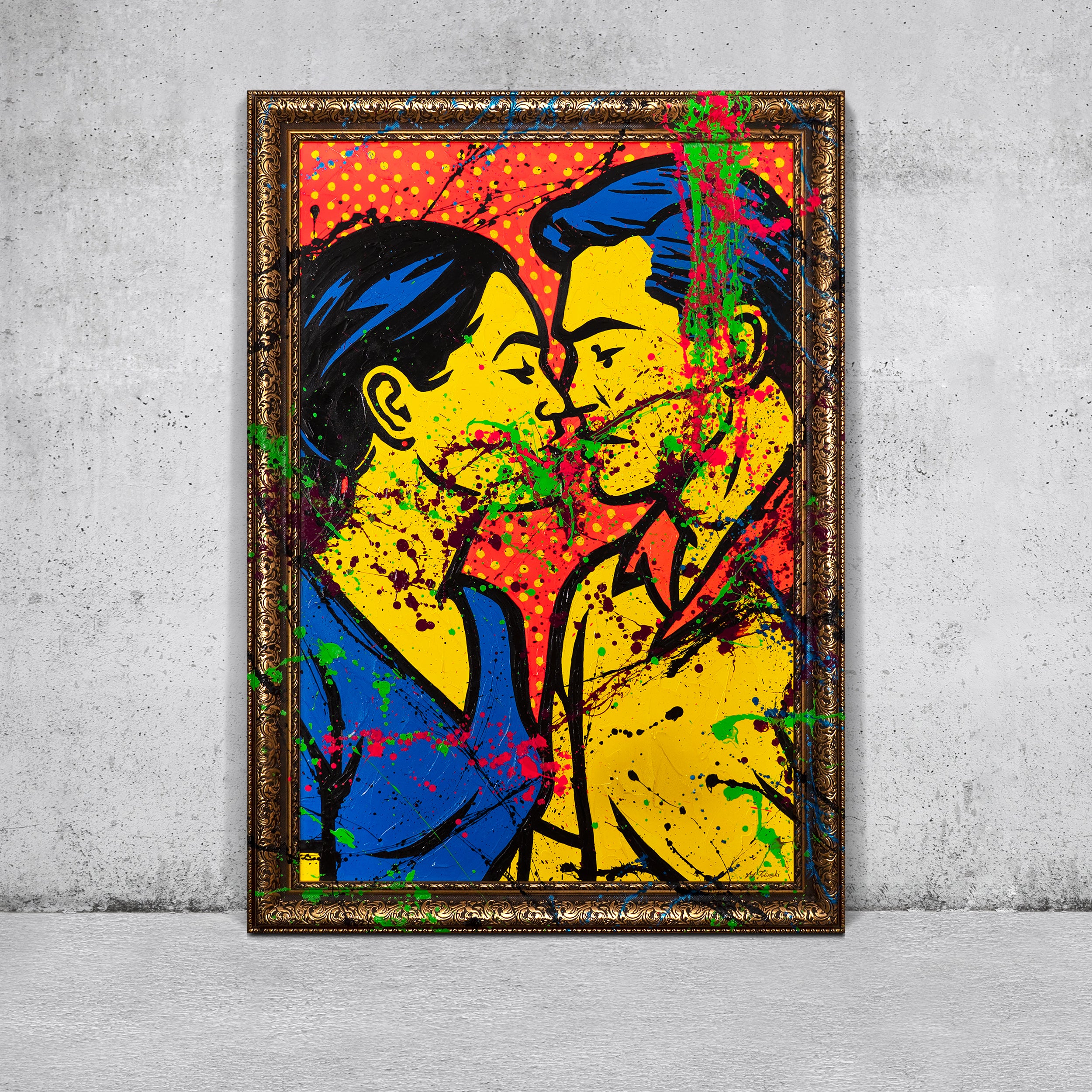 „Kleurrijke Kus“ toont een koppel in iconische Pop-Art stijl – felgele gezichten, diepe blauwtinten en een rode achtergrond met stippen. Dynamische verfspatten in groen, roze en zwart geven het werk energie en een stedelijke uitstraling. Elke penseelstreek is met de hand geschilderd en maakt dit schilderij tot een uniek statement tussen romantiek en street-art.